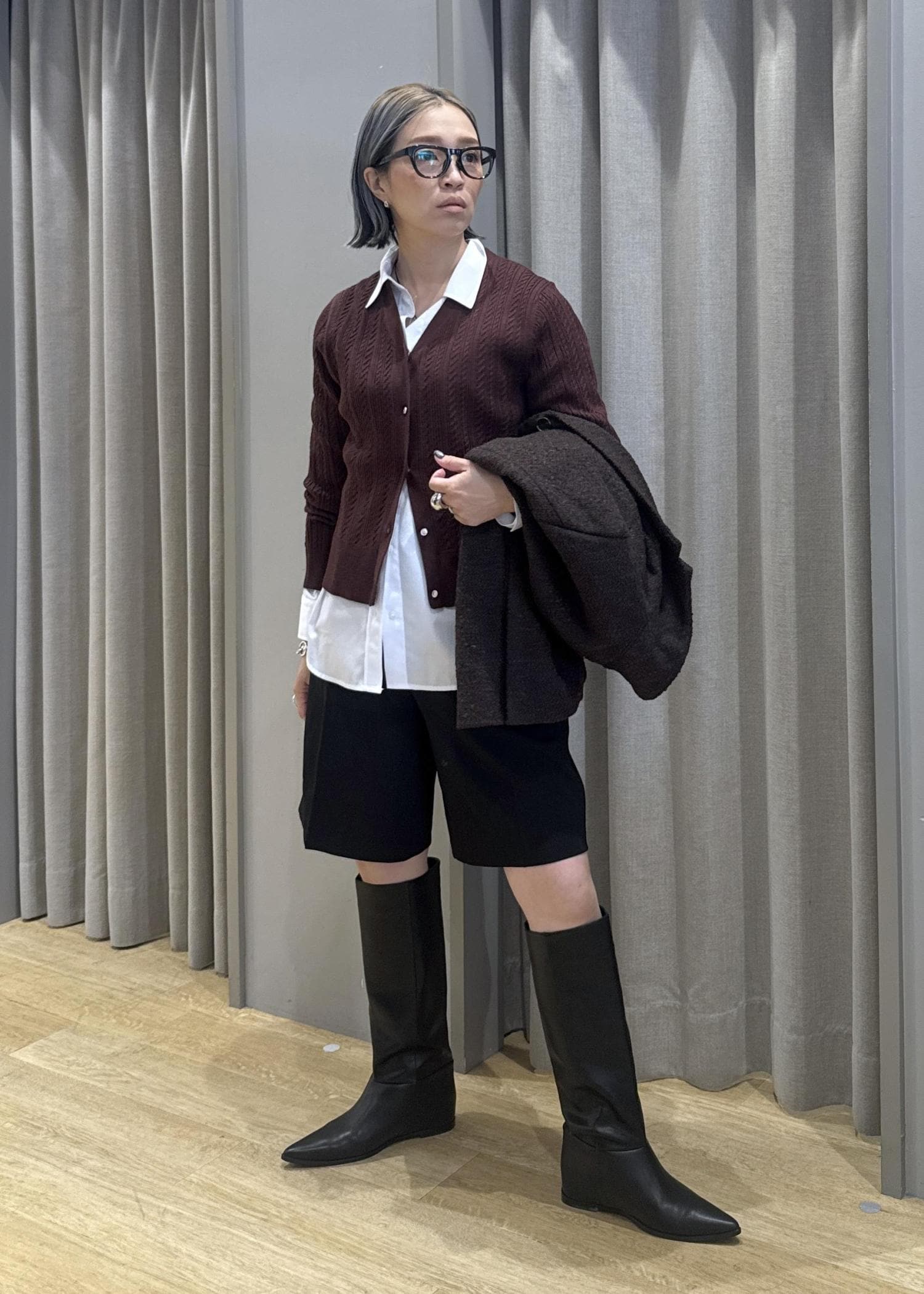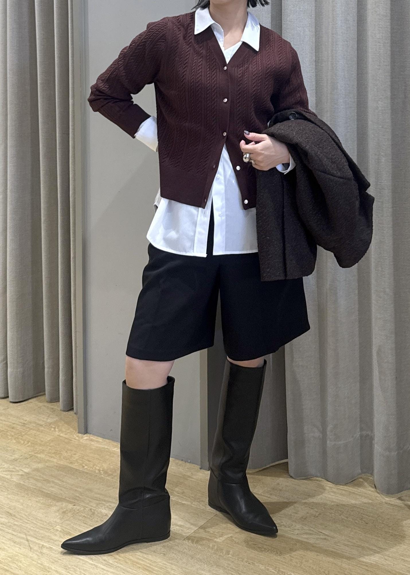 細めのカーディガンを着て脱ぐと締まって見えるようにアレンジしました。