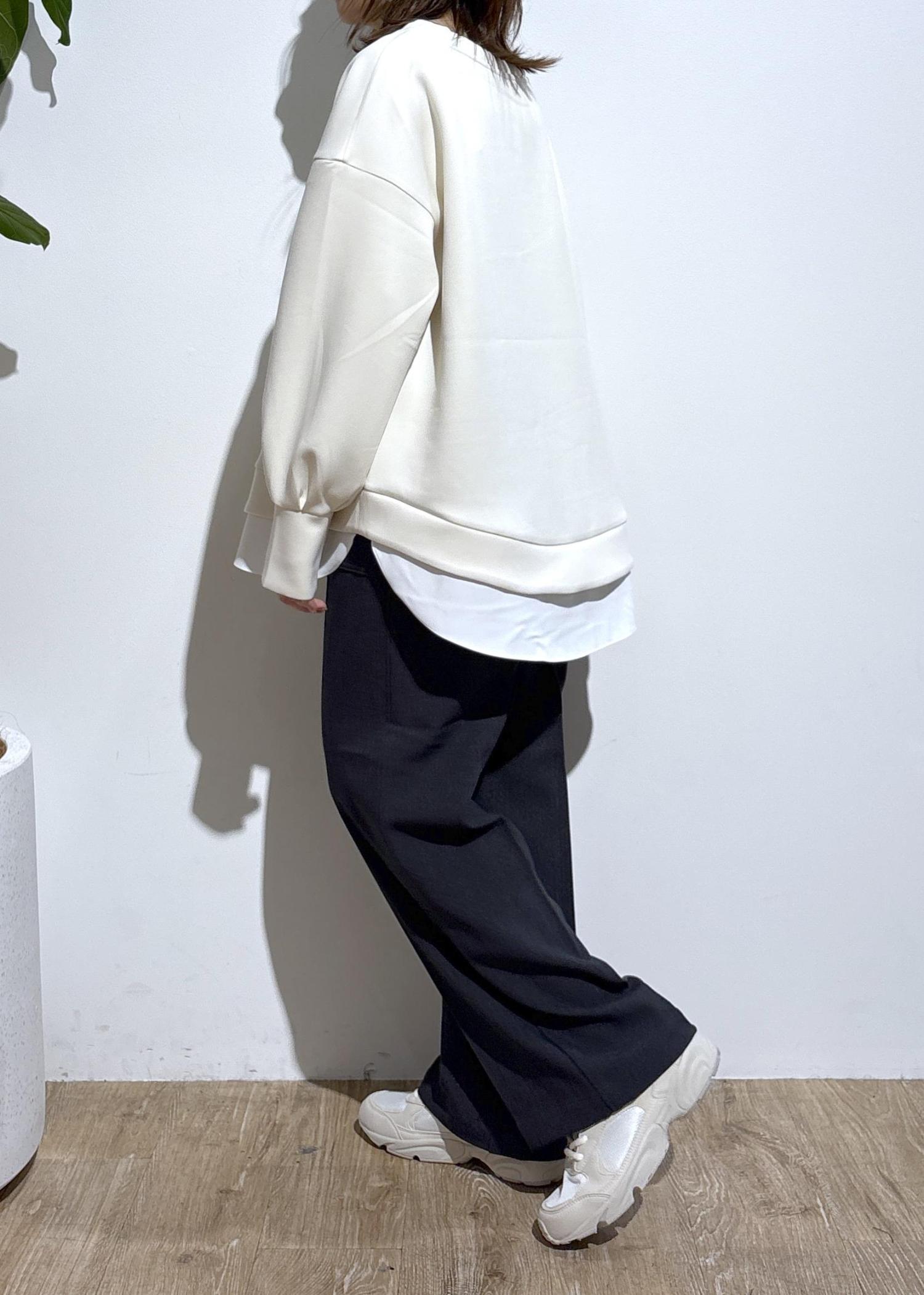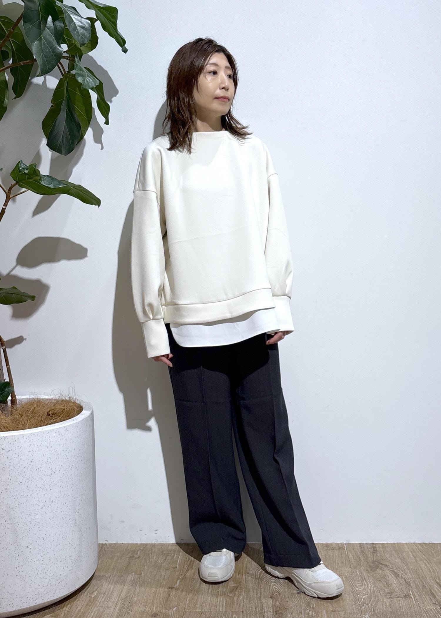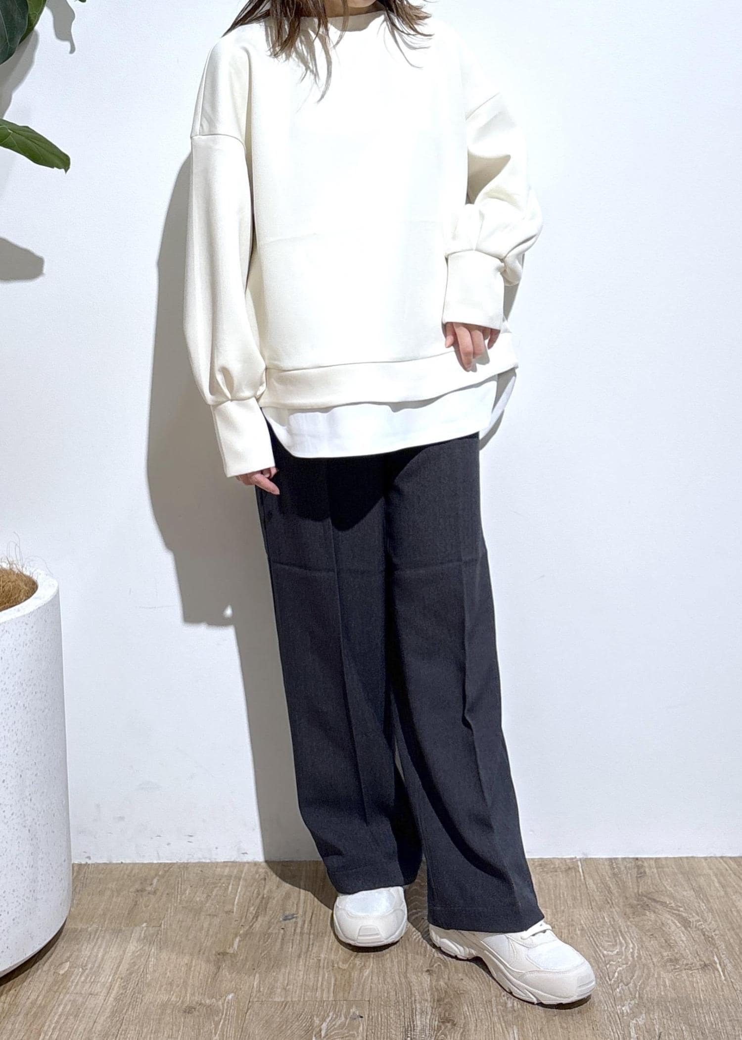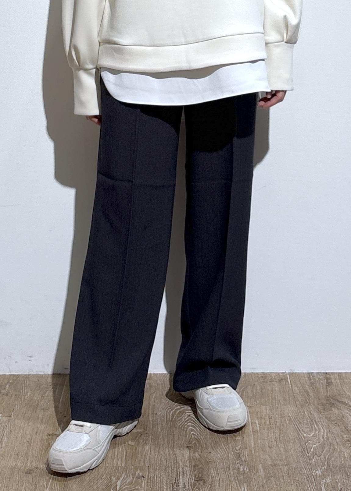 脚のラインを拾いにくいワイドシルエット、センタープレスが入っているので大きく見えず着用できます。