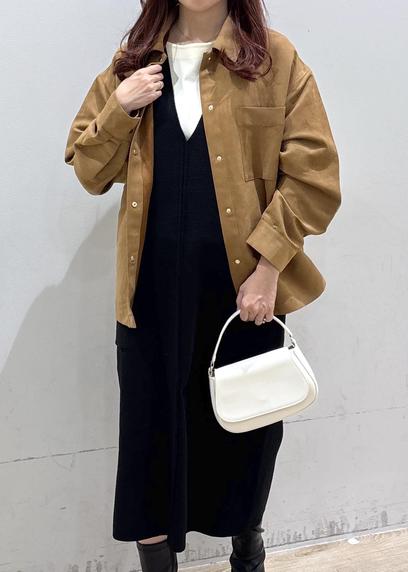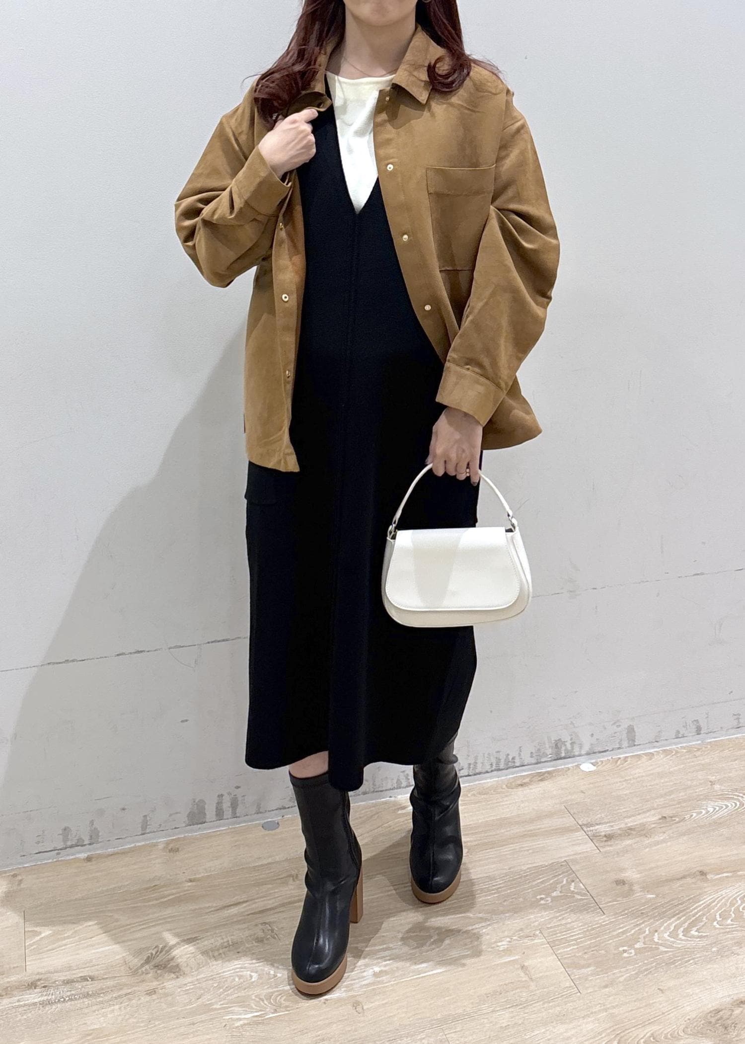 ワンピースに差し色でブラウンのシャツを羽織ったコーデです。