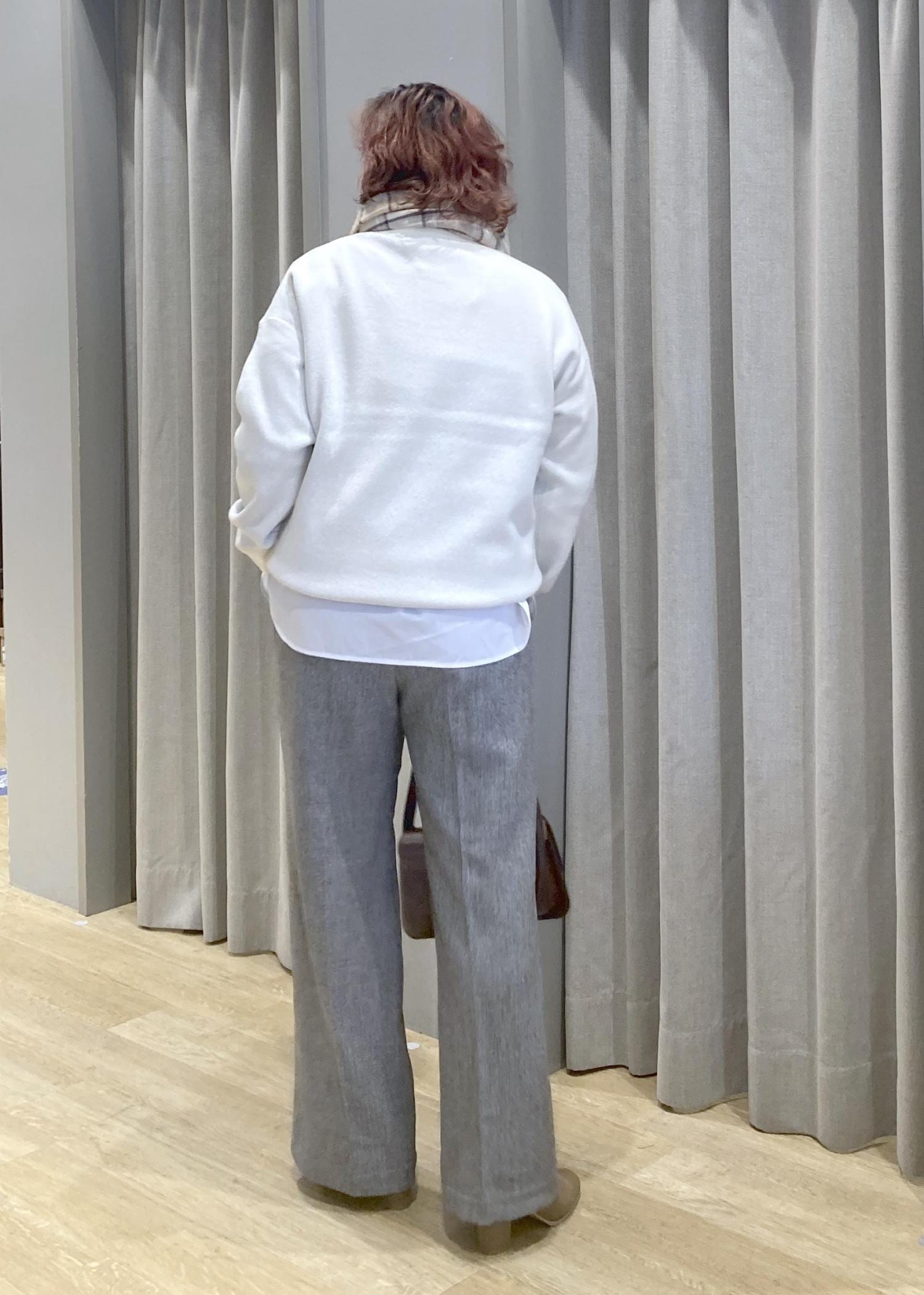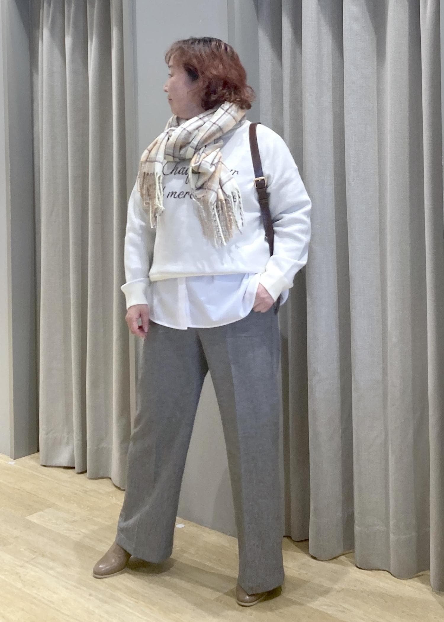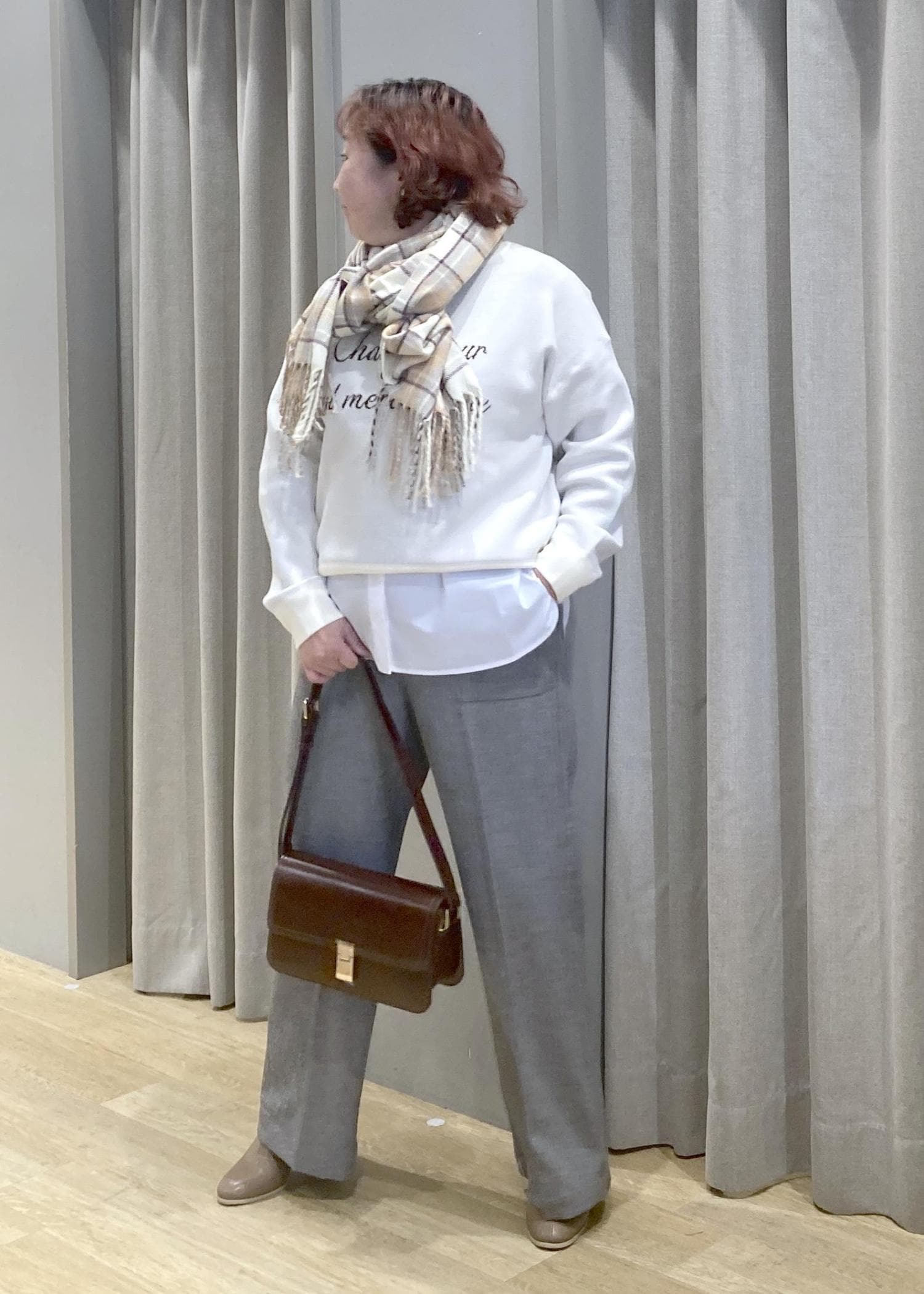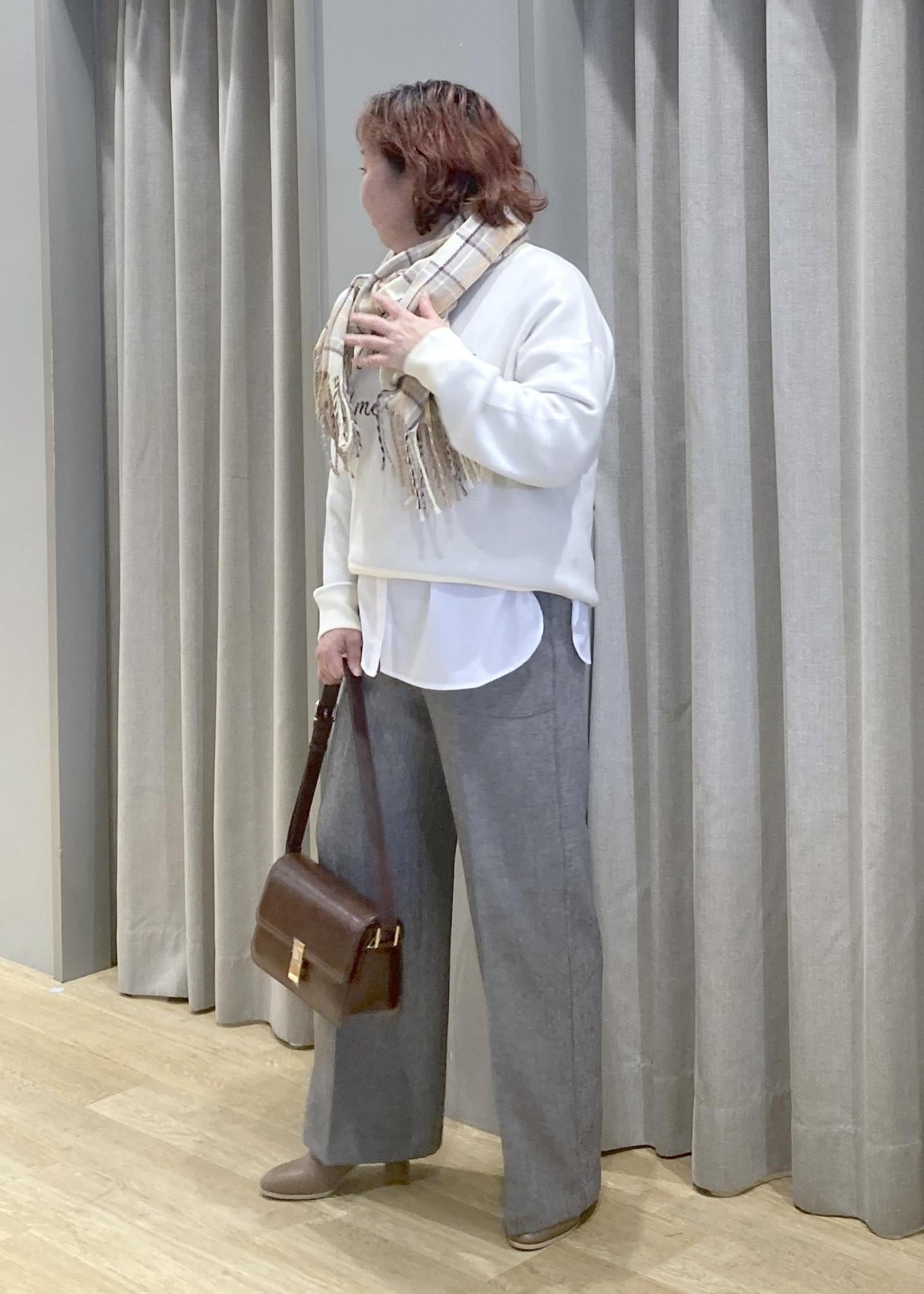 スウェットみたいに使えるロゴニット✕ワイドパンツで体型カバーしつつ、白シャツをのぞかせることで“ちゃんと感”も自然にプラスできます。