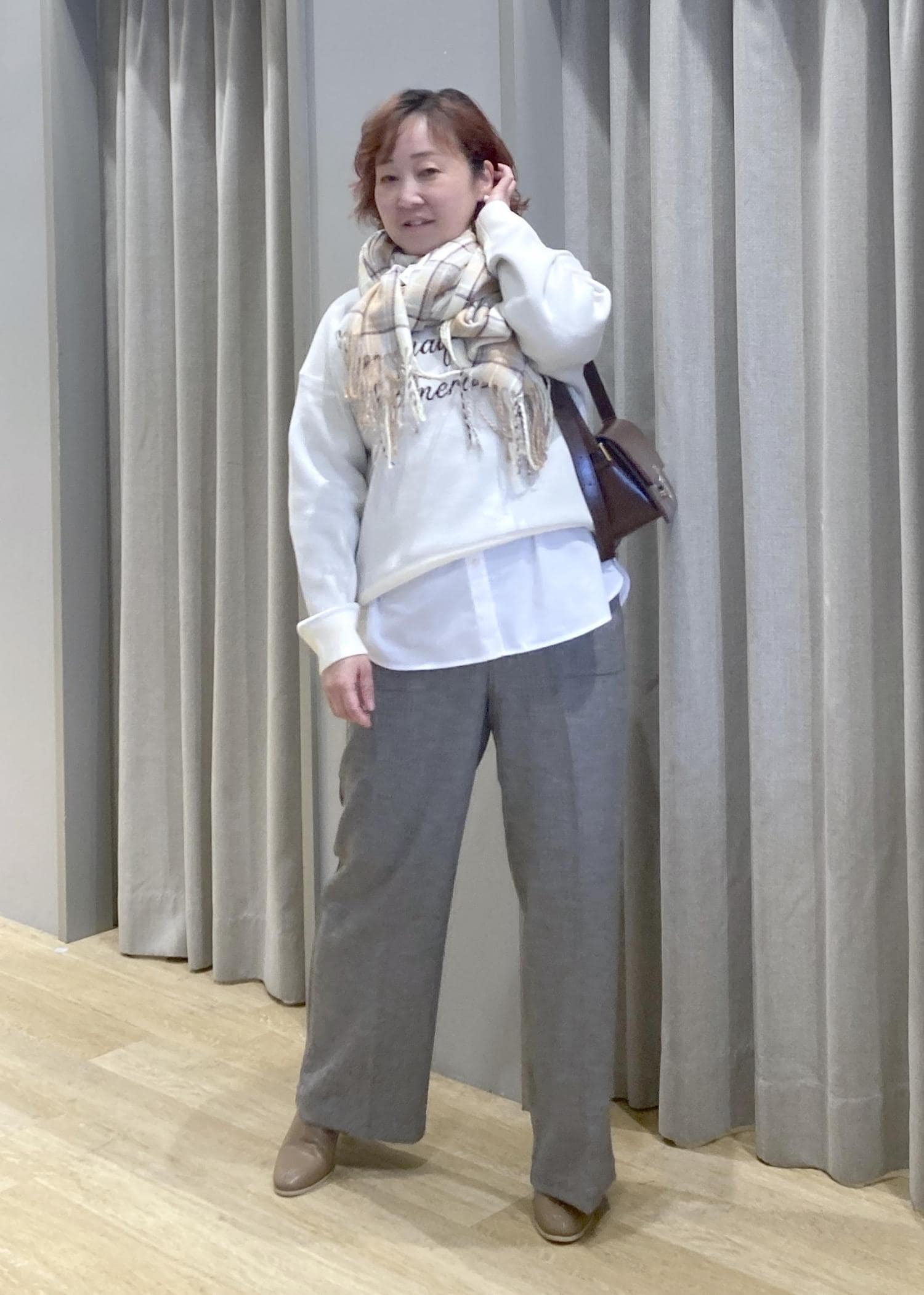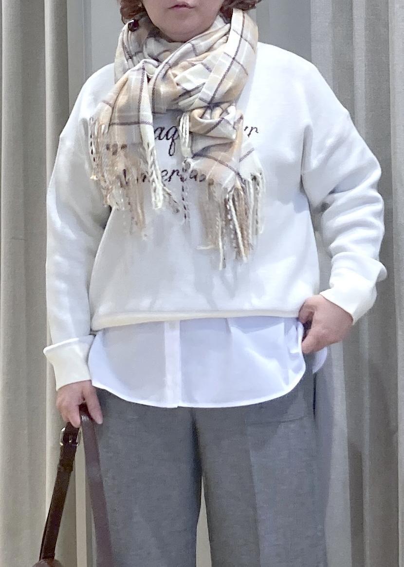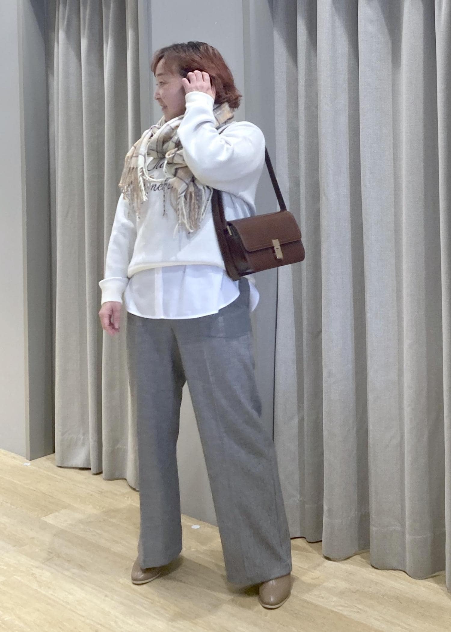ストールで首元をあたためながら、顔まわりがパッと明るくなるのでオススメ!お仕事にも送り迎えにもそのまま行ける、ラフさと上品さのバランスがちょうどいいスタイルです。