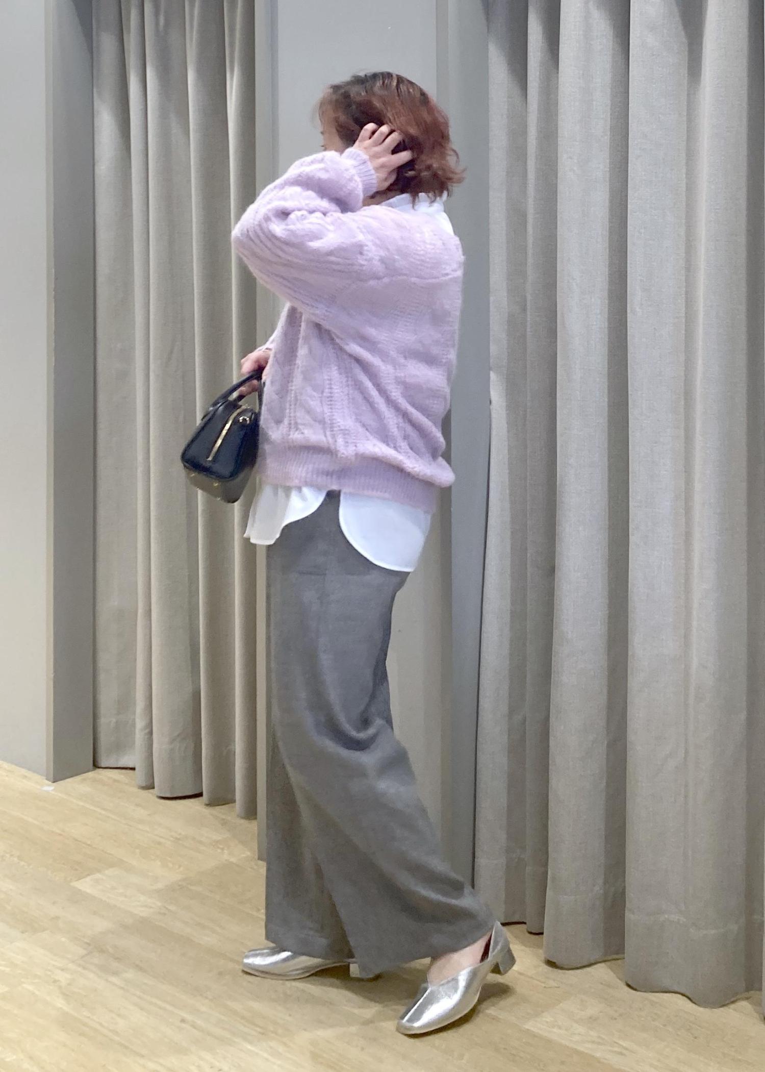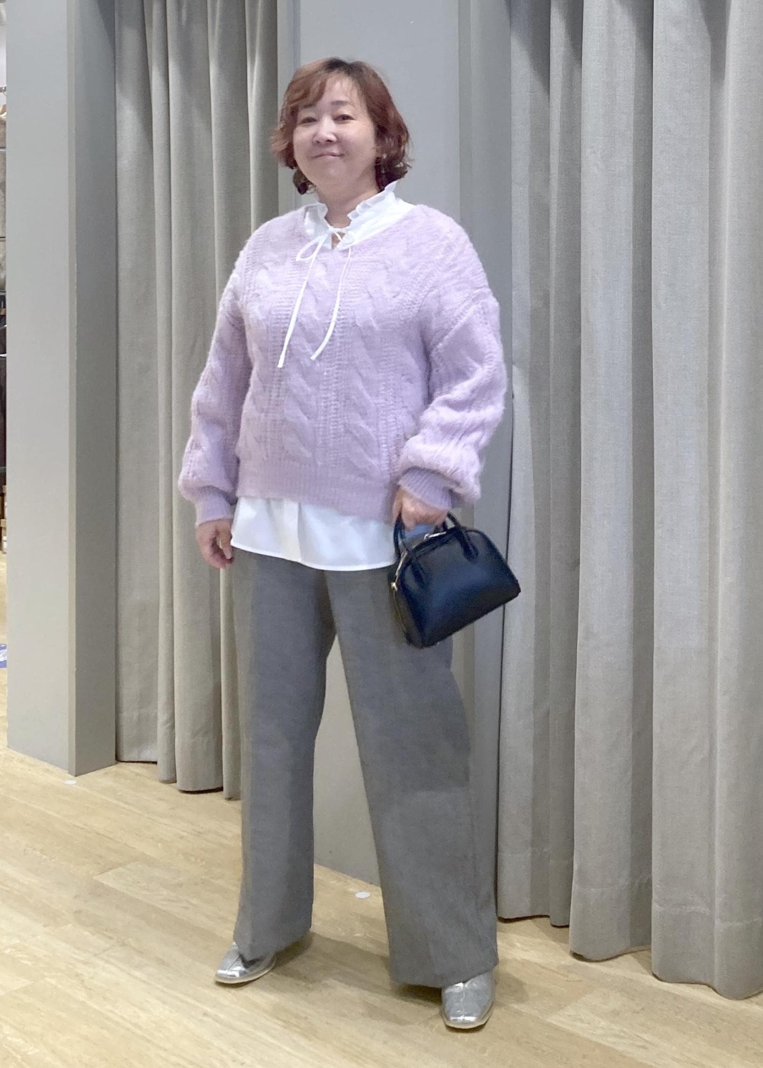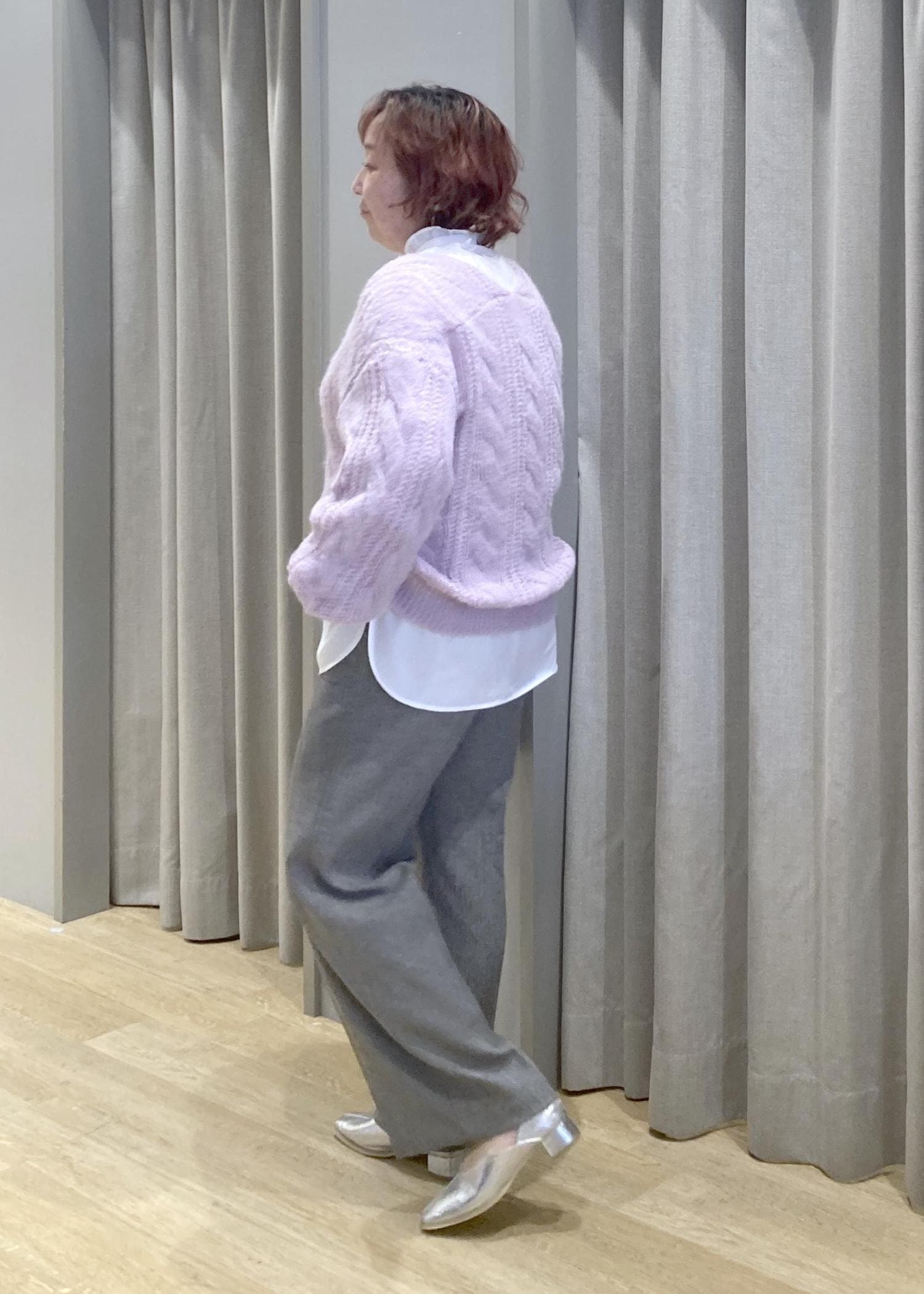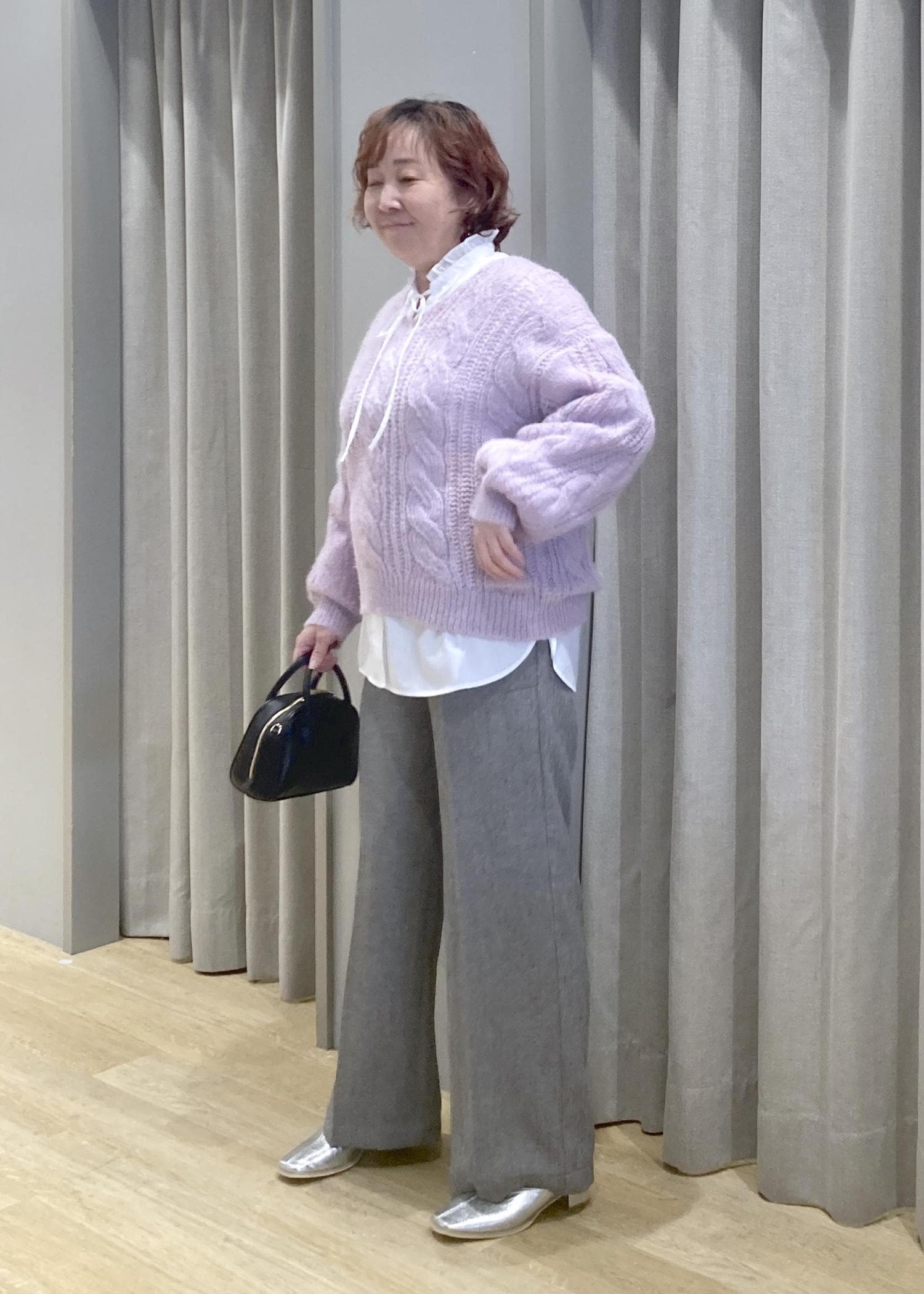 ラベンダーのゆるニットに白シャツをINするだけで、体型もふわっとカバー出来ます。