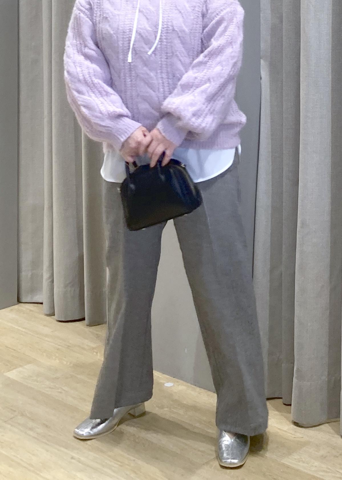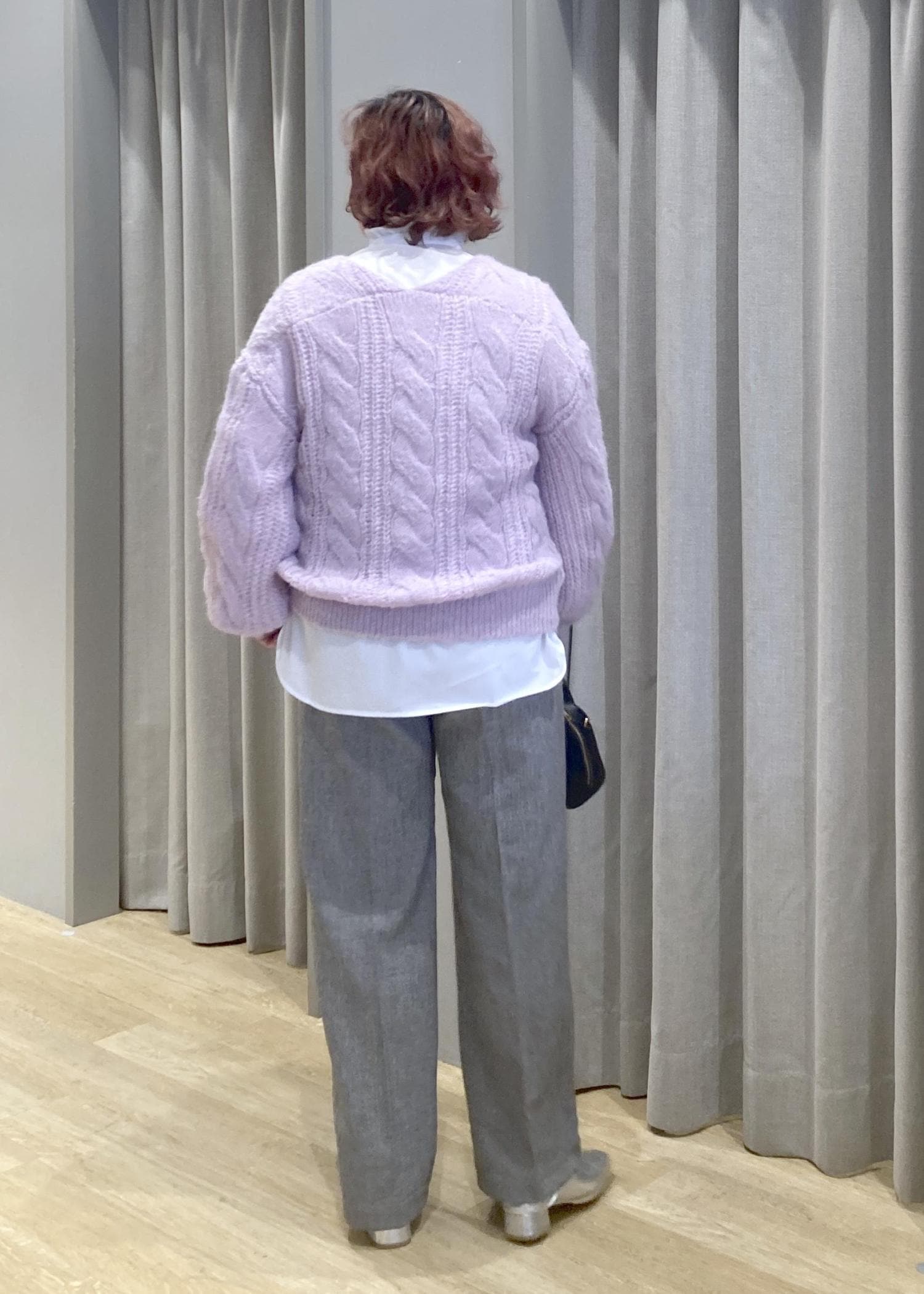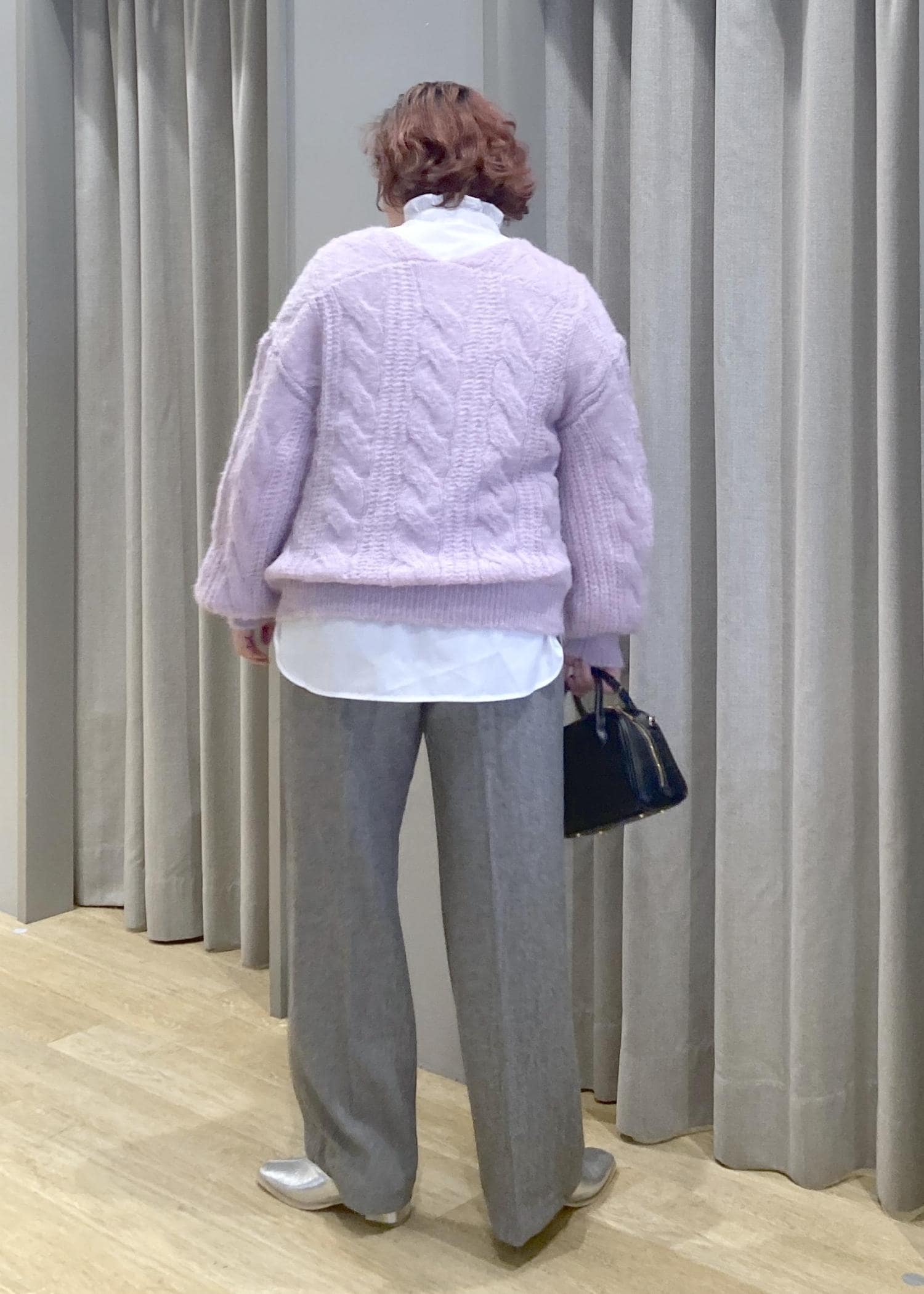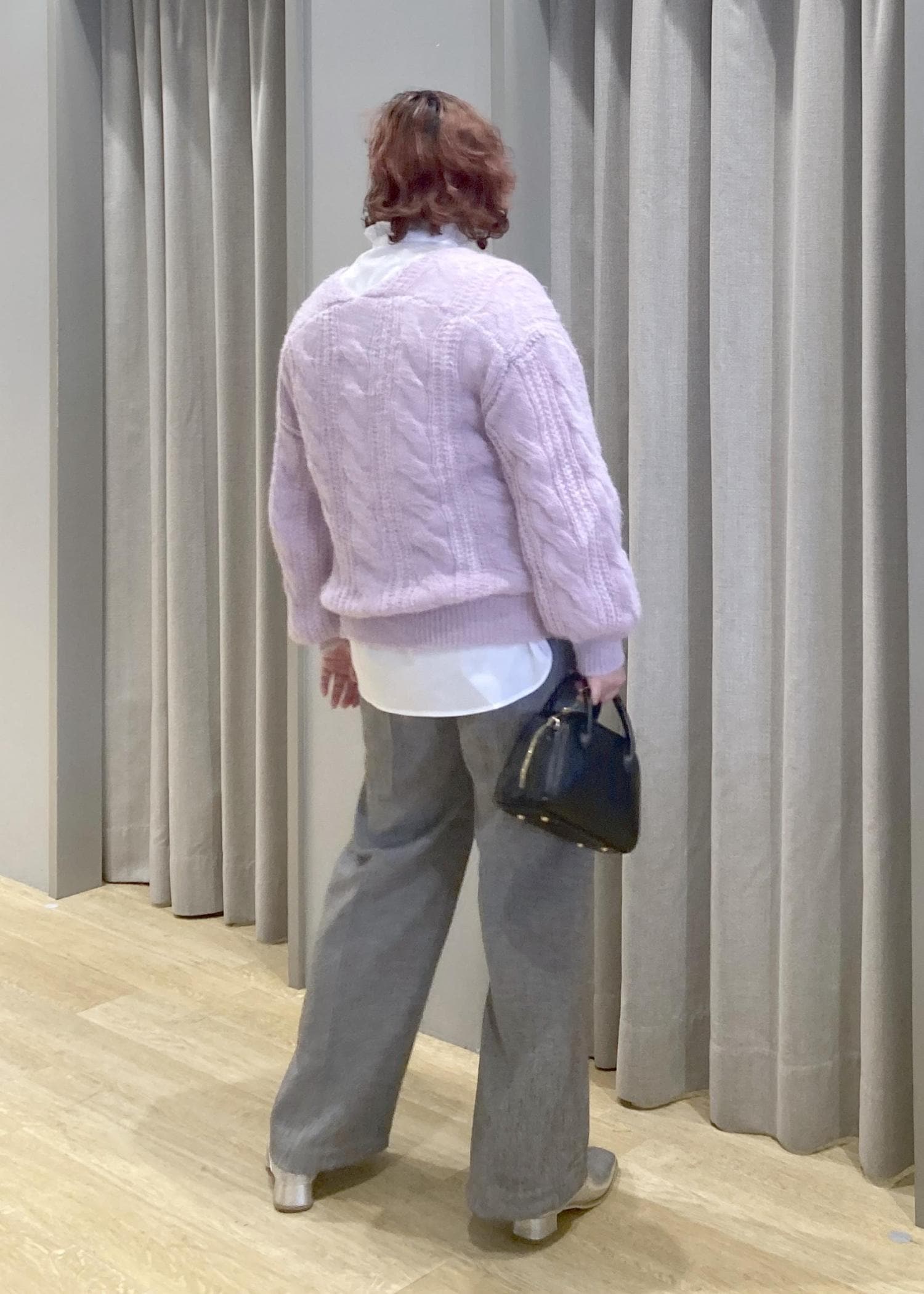 ラベンダーのゆるニットに白シャツをINするだけで、体型もふわっとカバー出来ます。