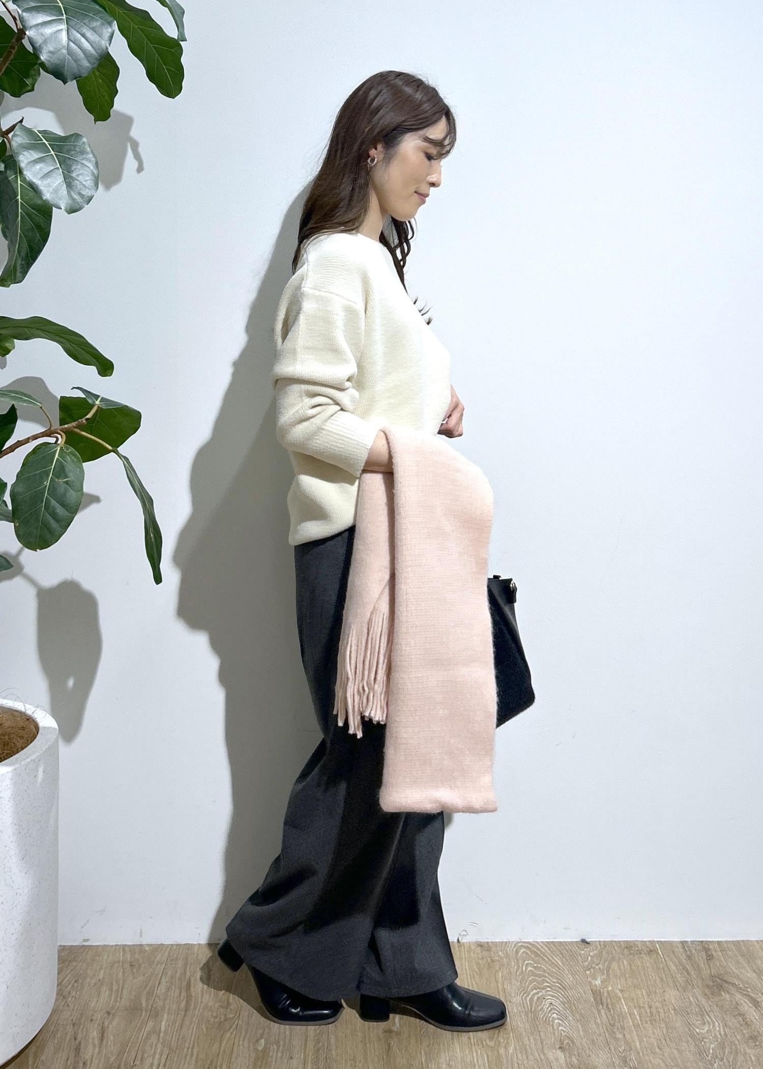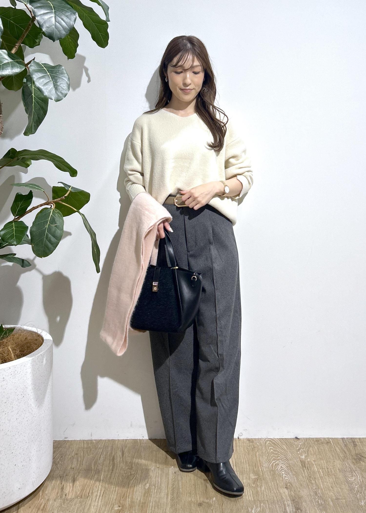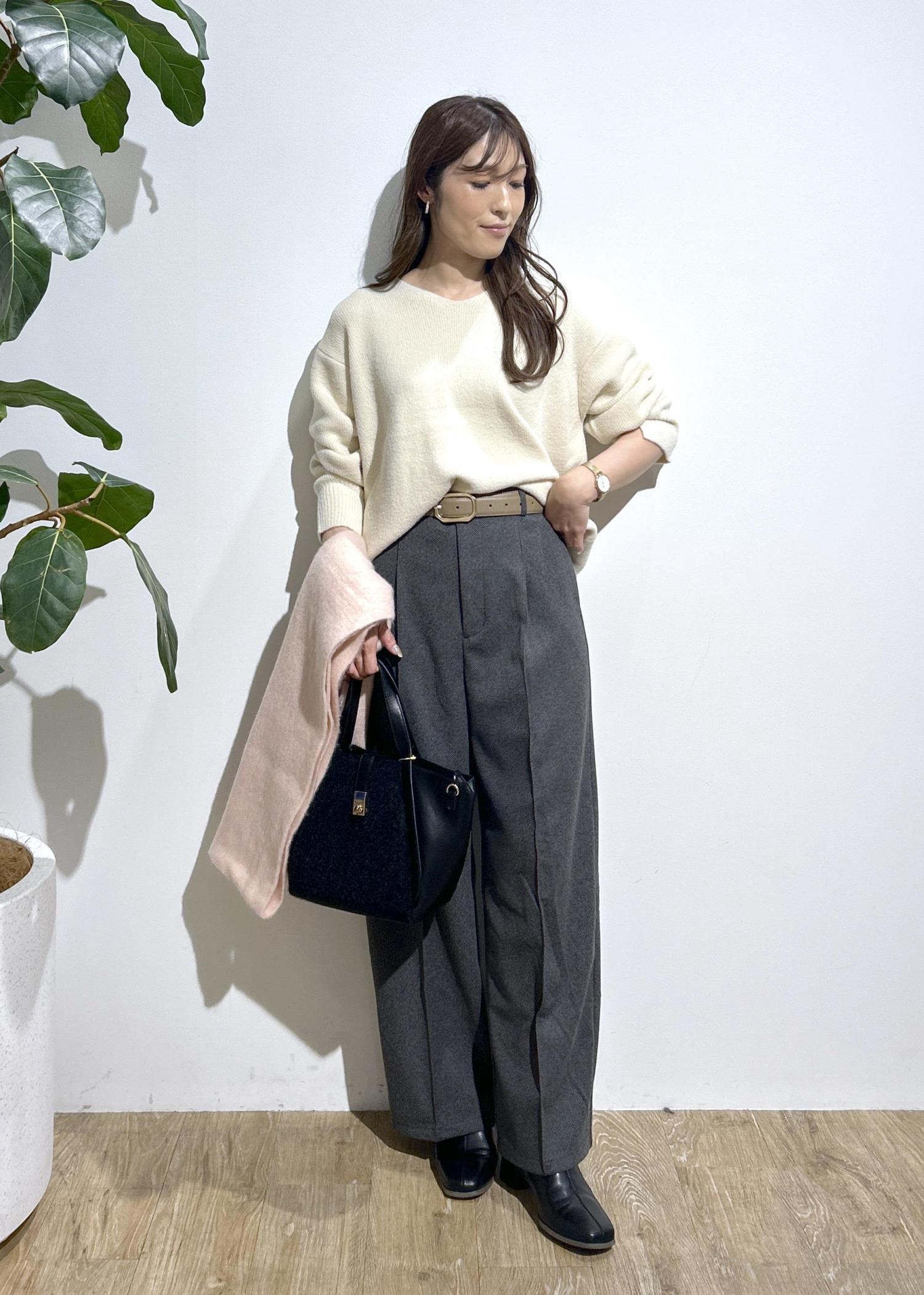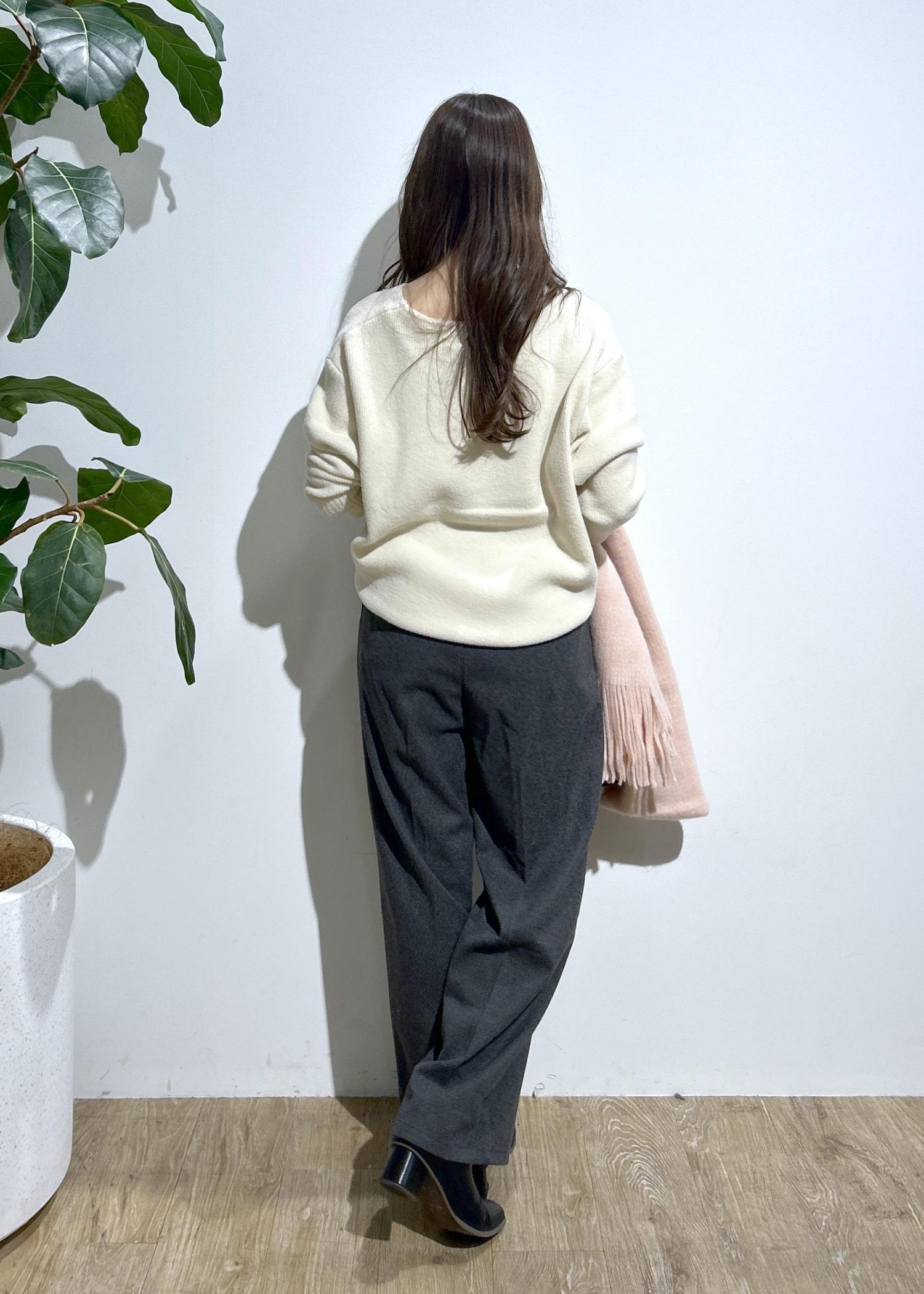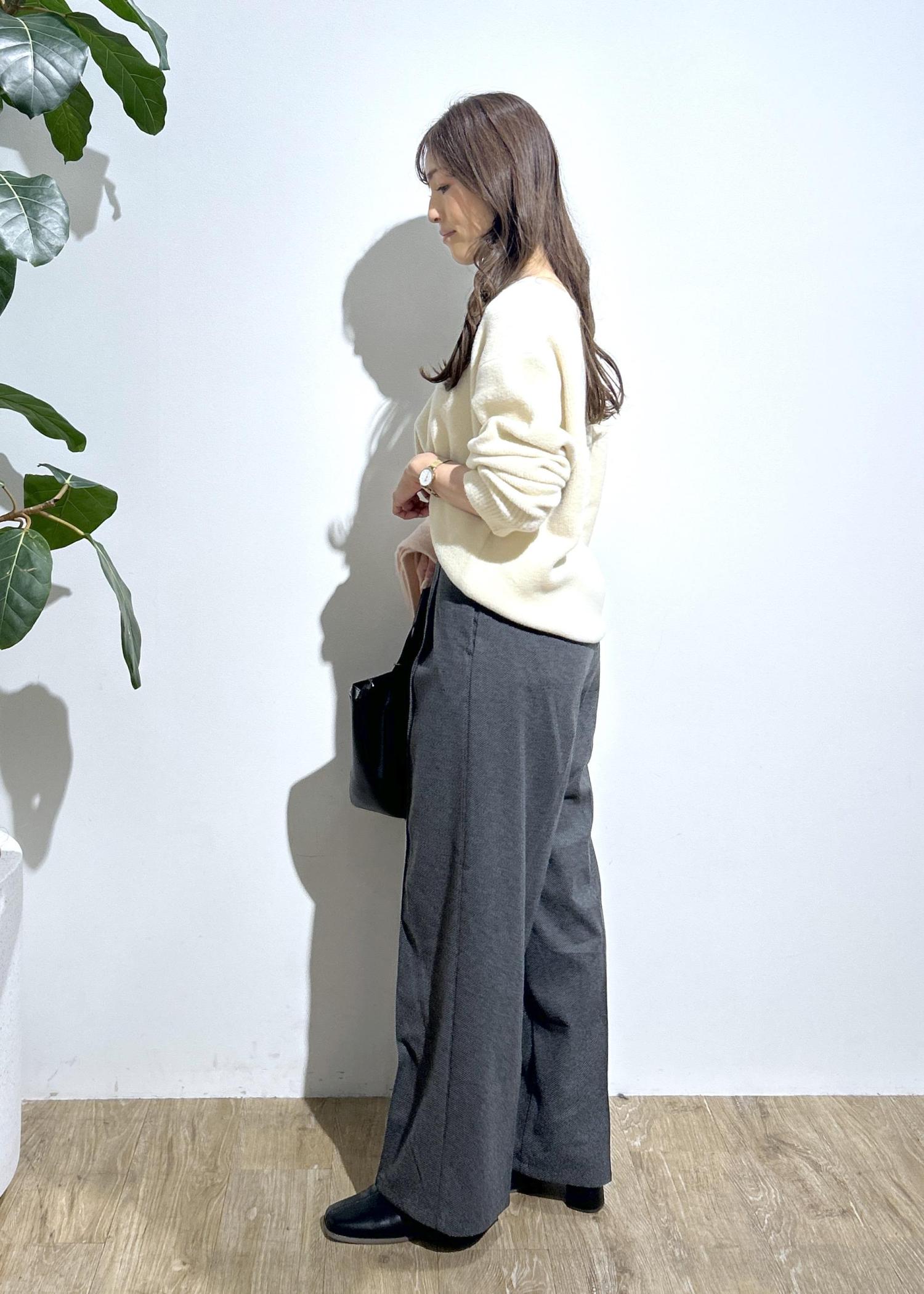 肌触りの良いふわもちニットとパンツを合わせたキレイめなスタイリング。