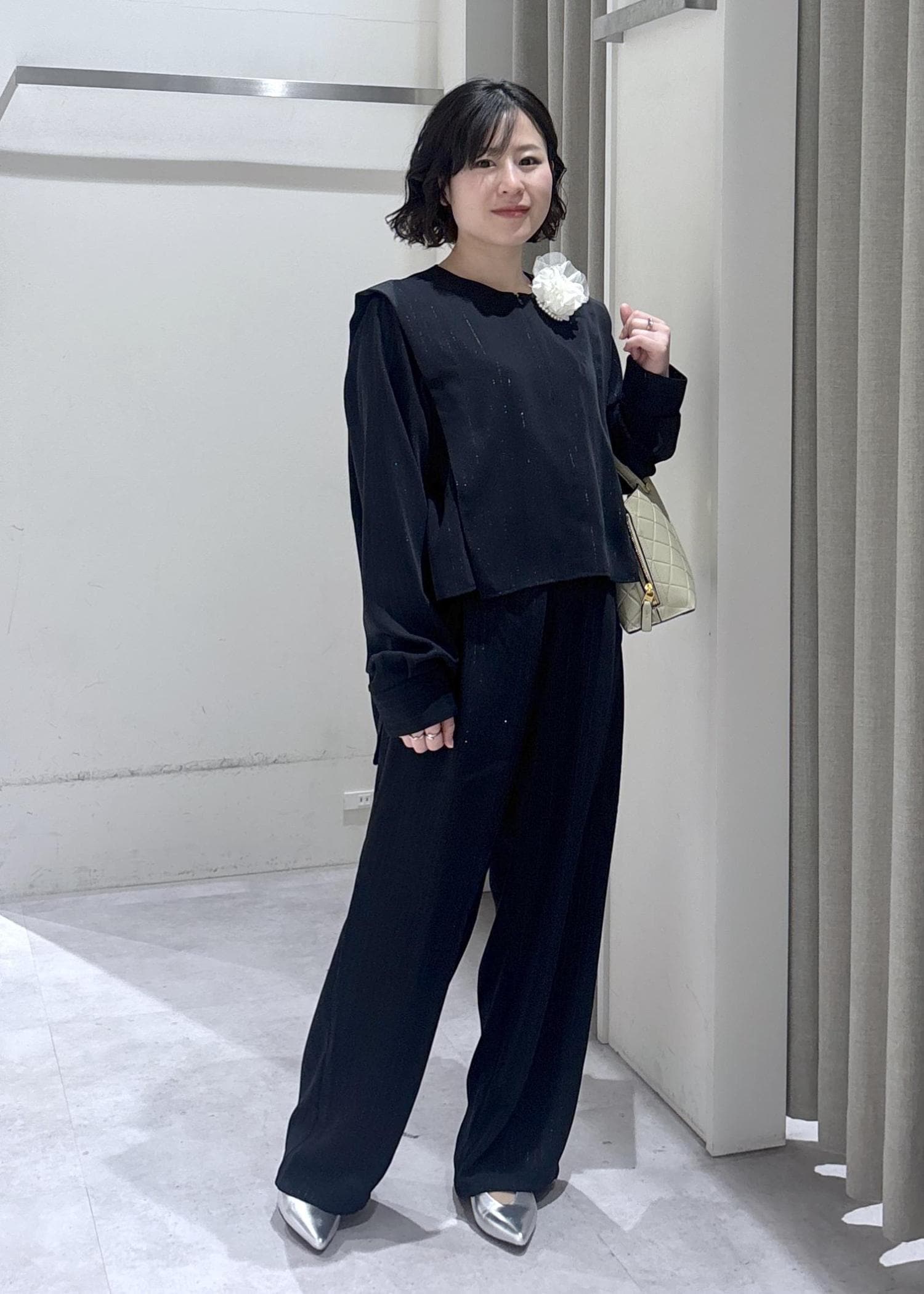 細見え抜群のシルエットのブラウスとパンツに