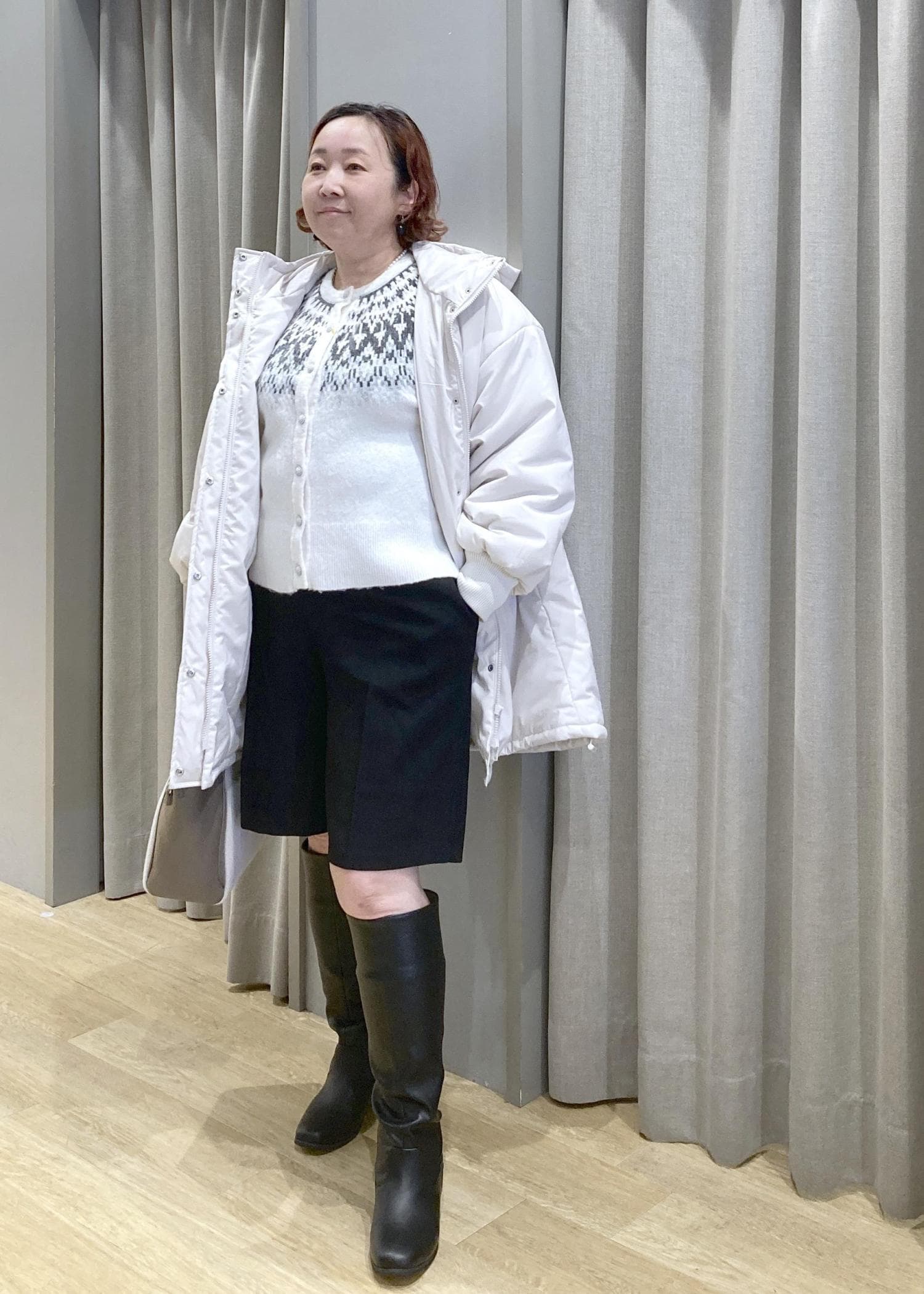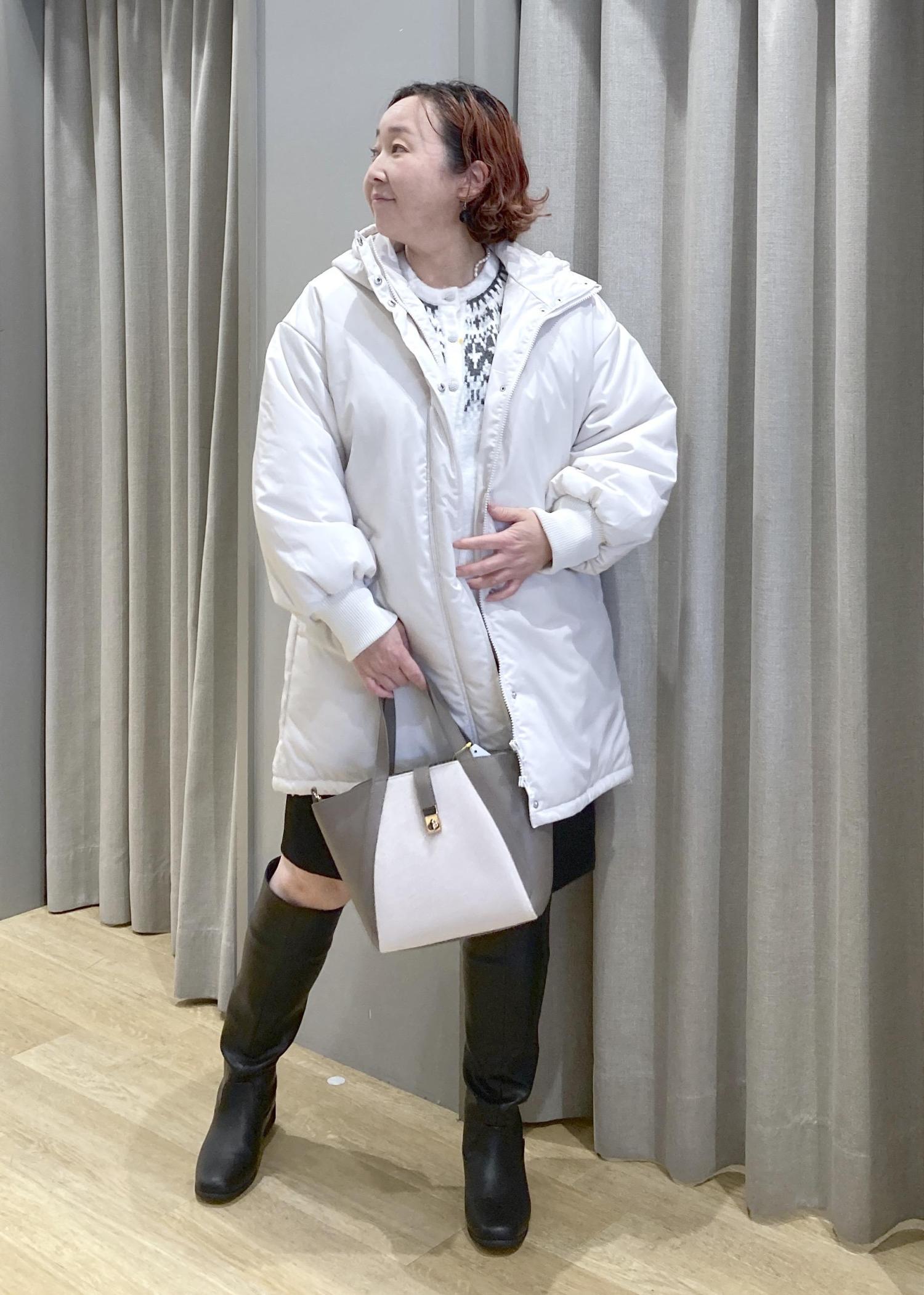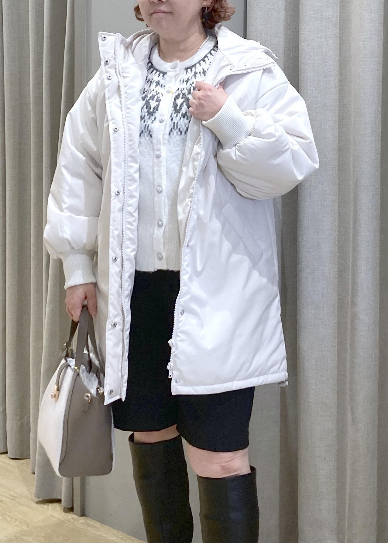 白ニット×白アウターでふんわり明るくしつつ、