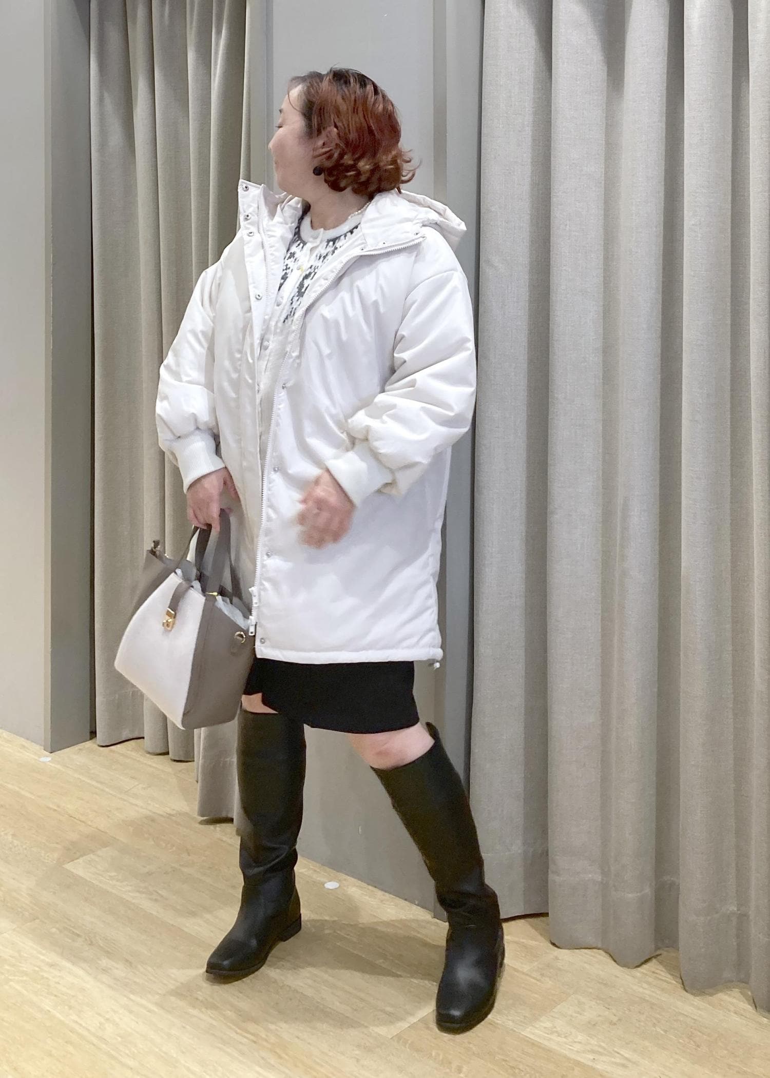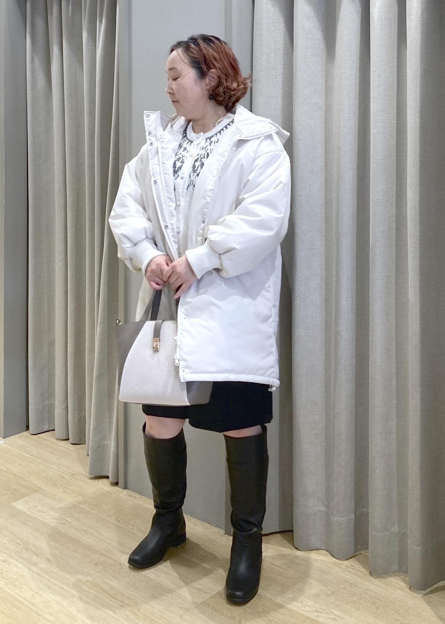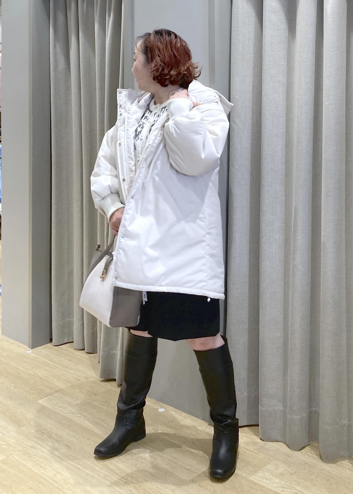 白ニット×白アウターでふんわり明るくしつつ、
