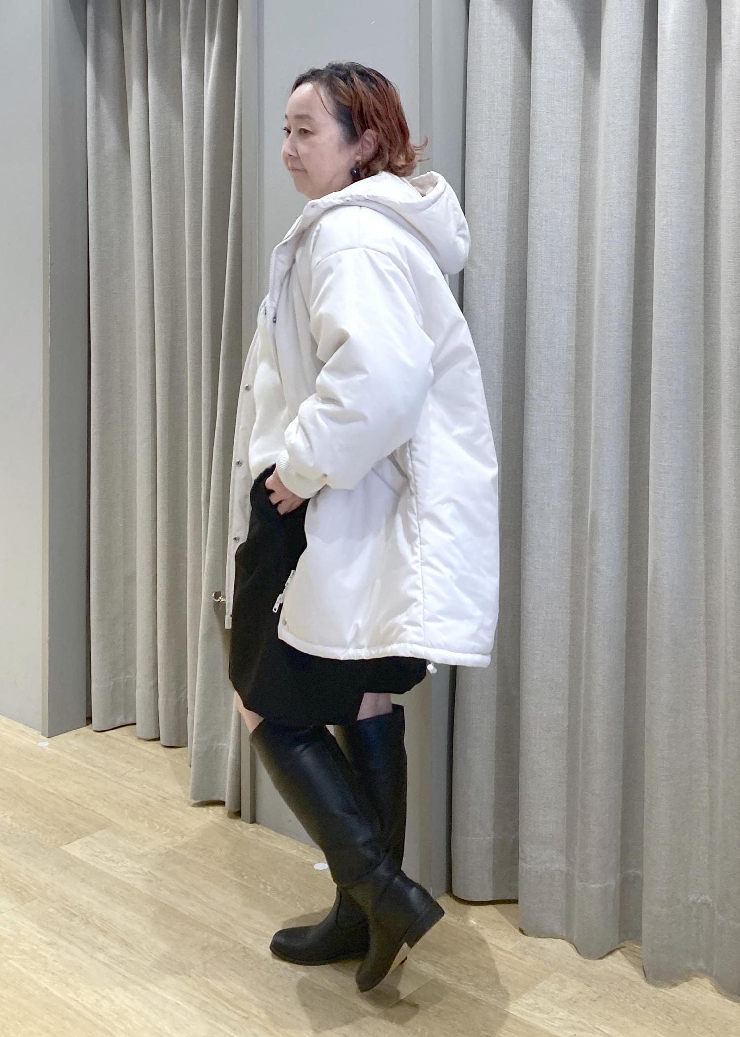 ロングブーツで脚のラインをまっすぐ見せることで、