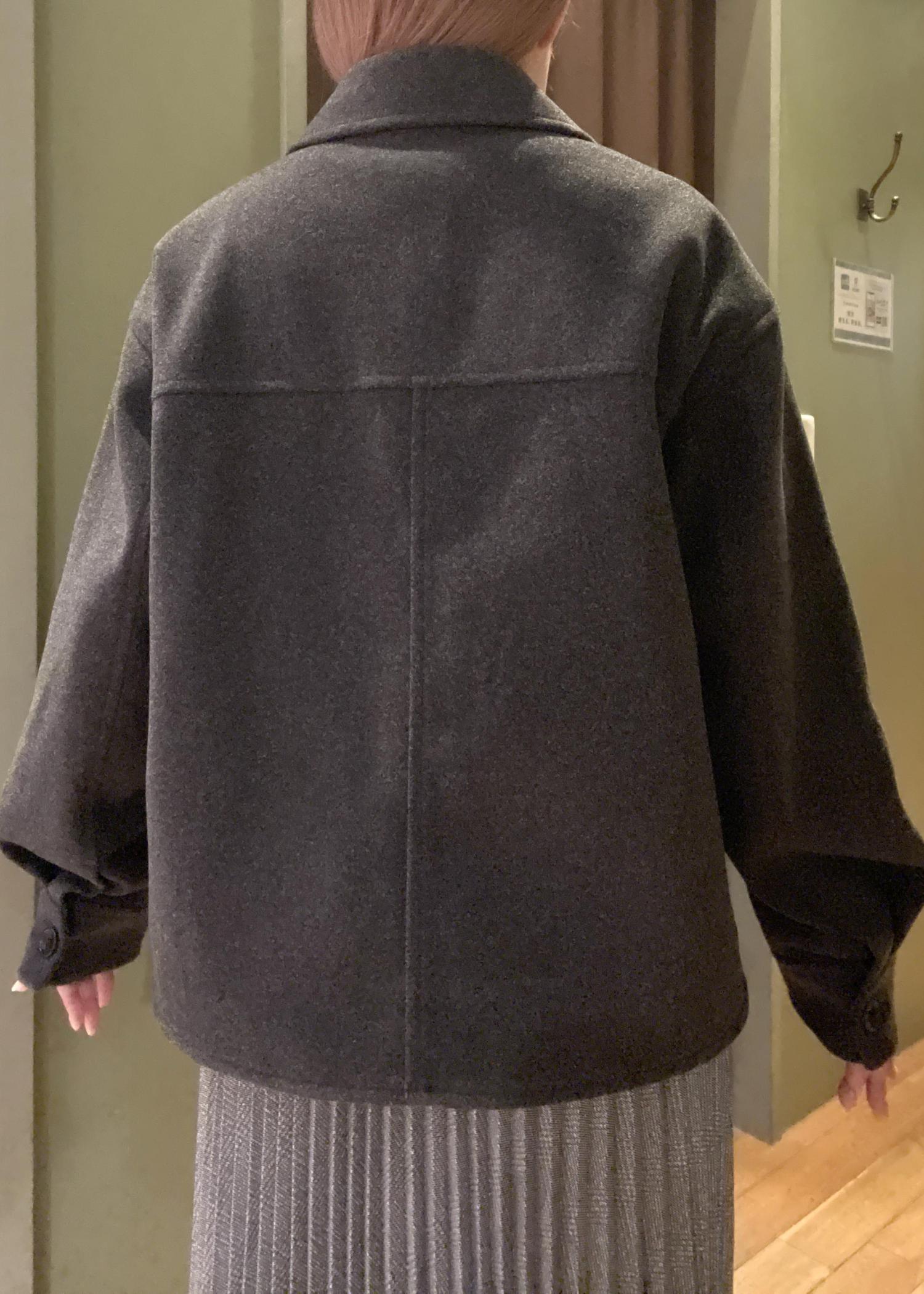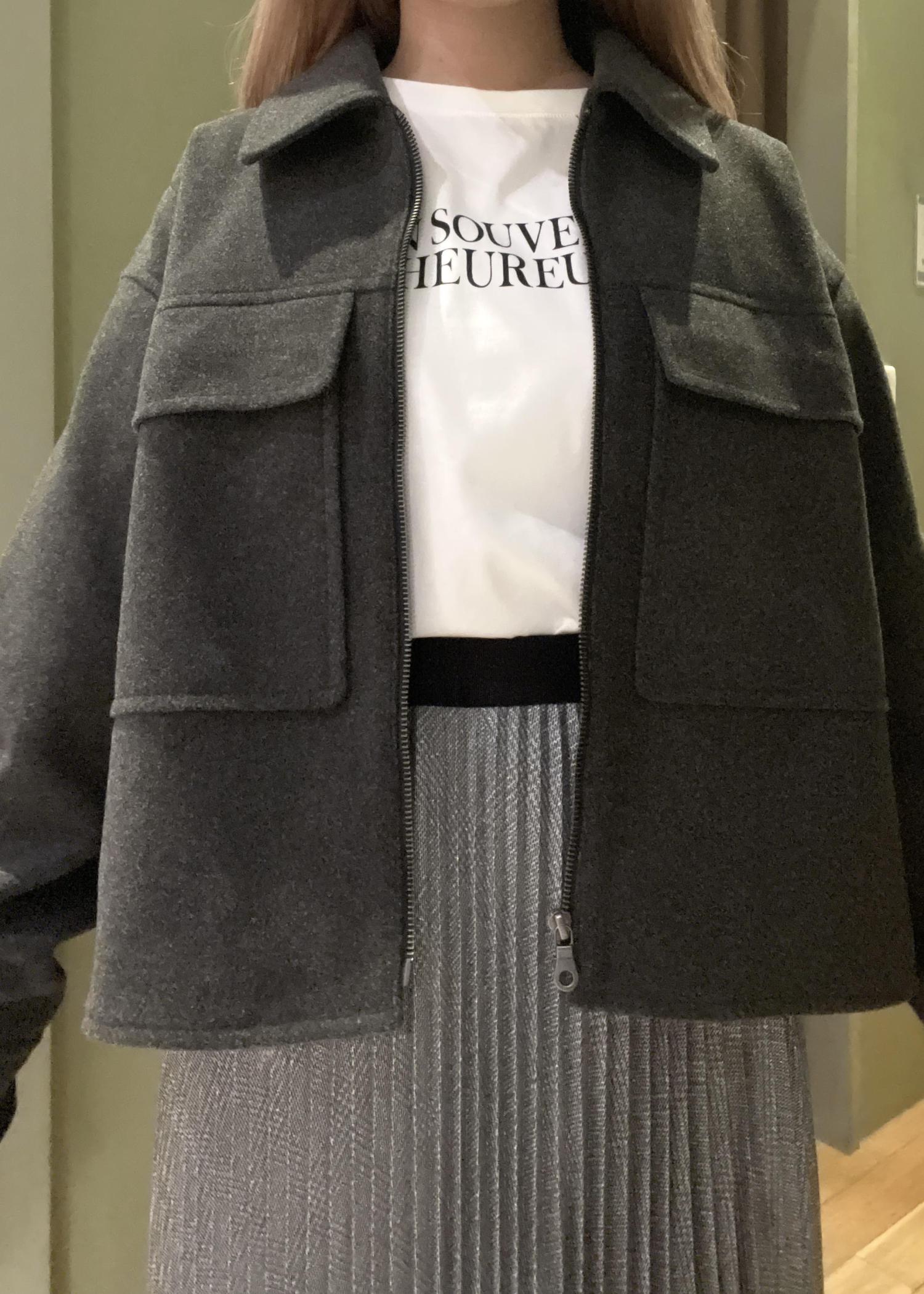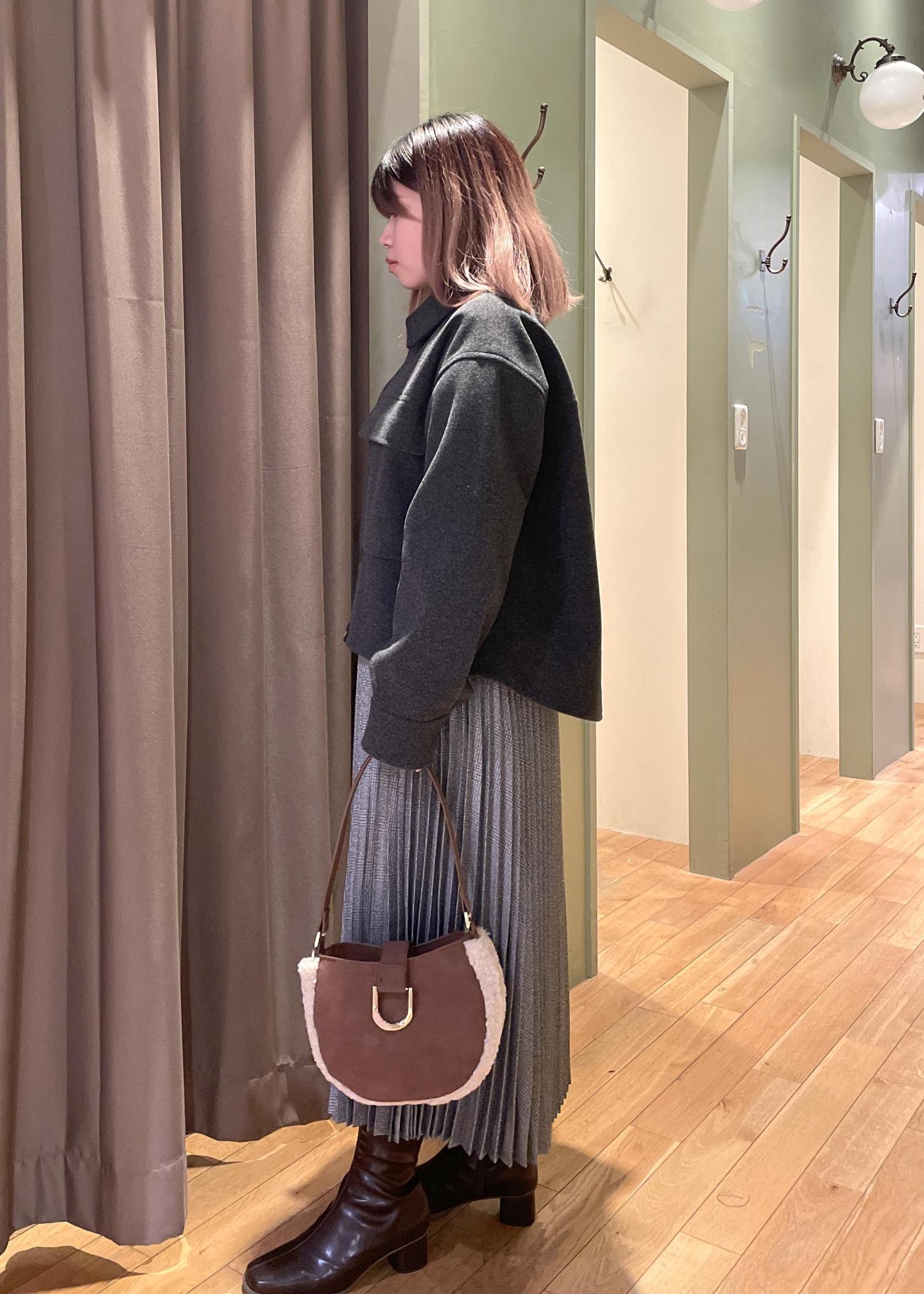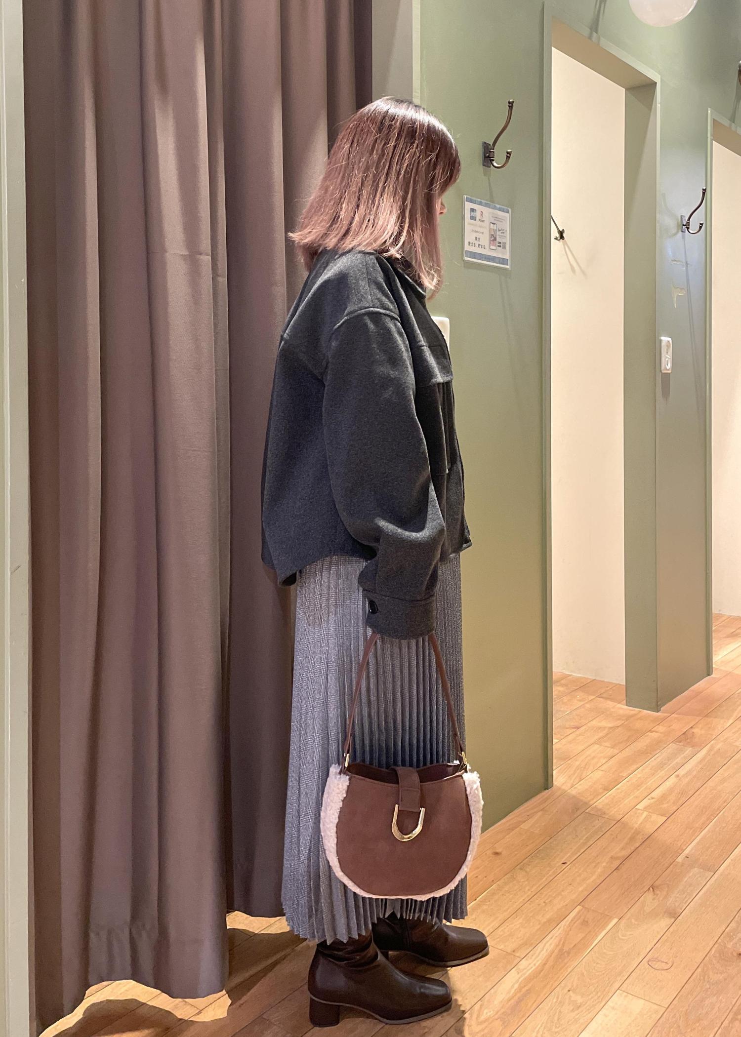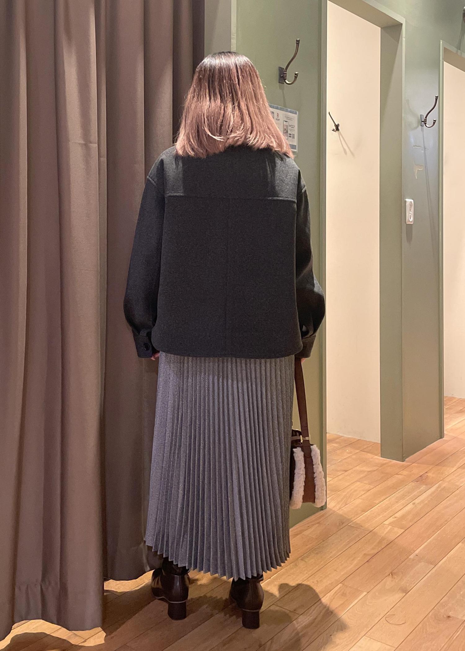 アウターをダークグレー、スカートをライトグレーで合わせ、グラデーションになるようなワントーンコーディネートにしてみました!