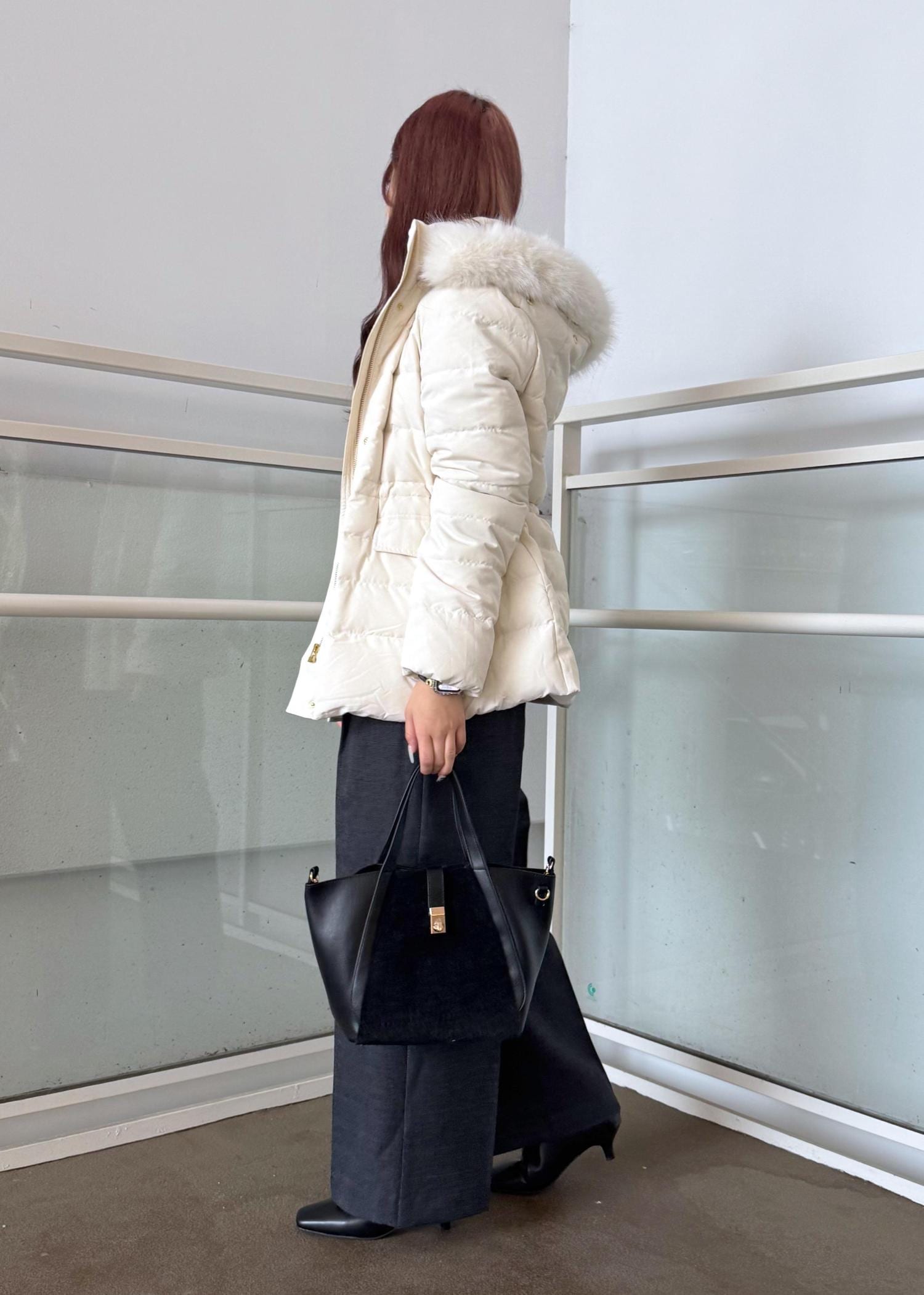 ミドル丈のダウンコートは、ファーとフードが取り外し可能になっていてオンオフで使いやすいシンプルなデザインです!