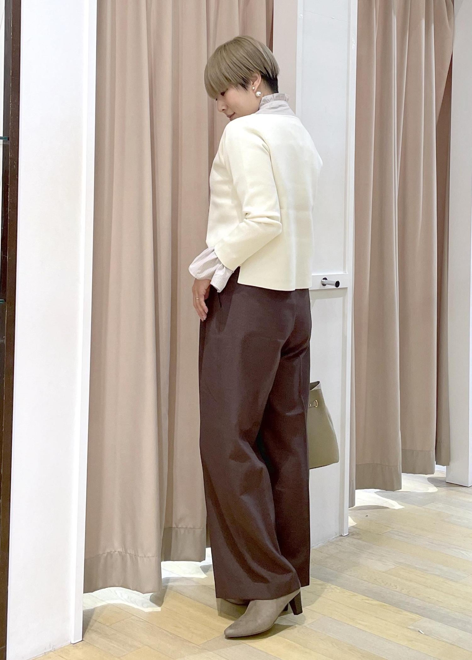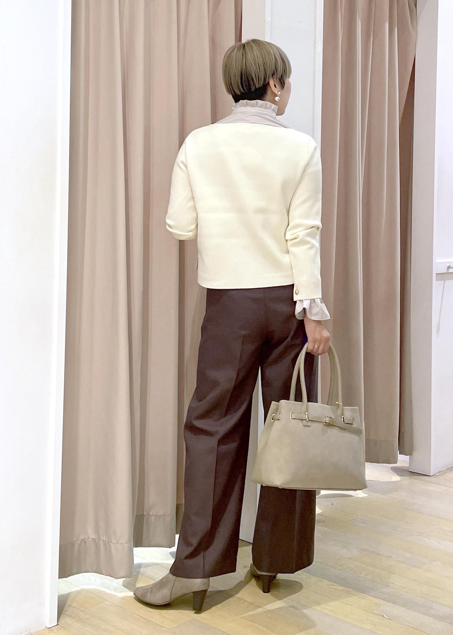 シンプルでベイシックな、ミラノリブニットに、フリルシャツをインした華やかコーデに、ブラウンのパンツを合わせたトレンドからーコーデです。