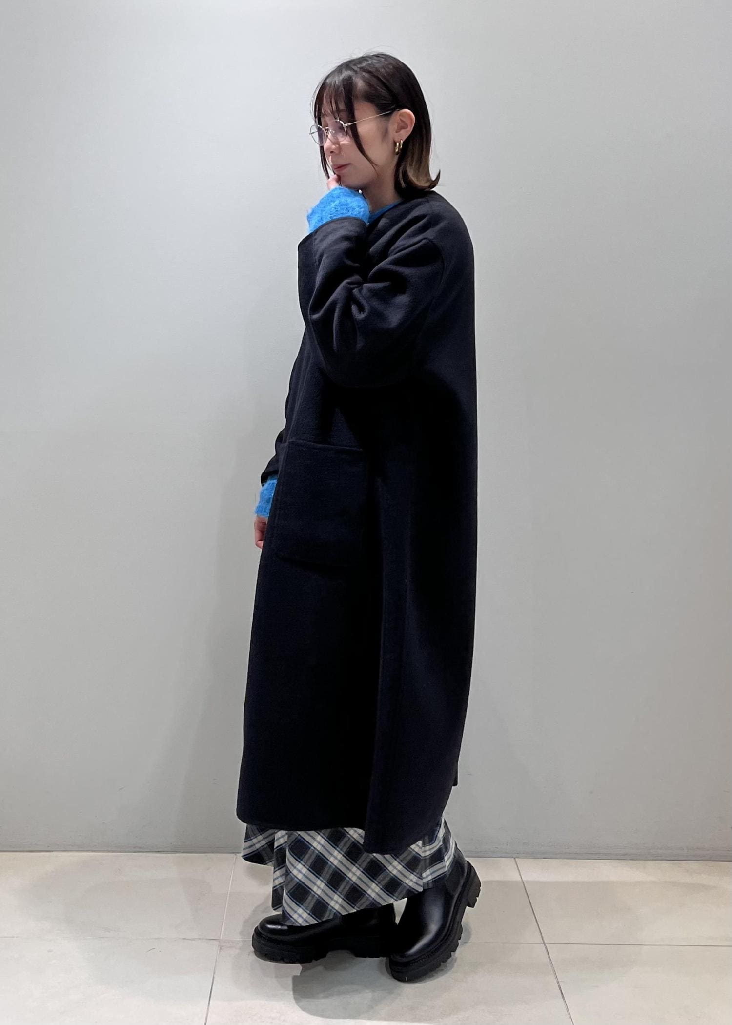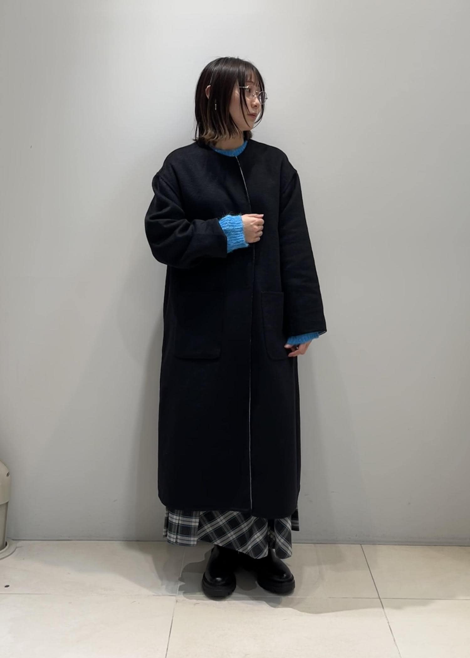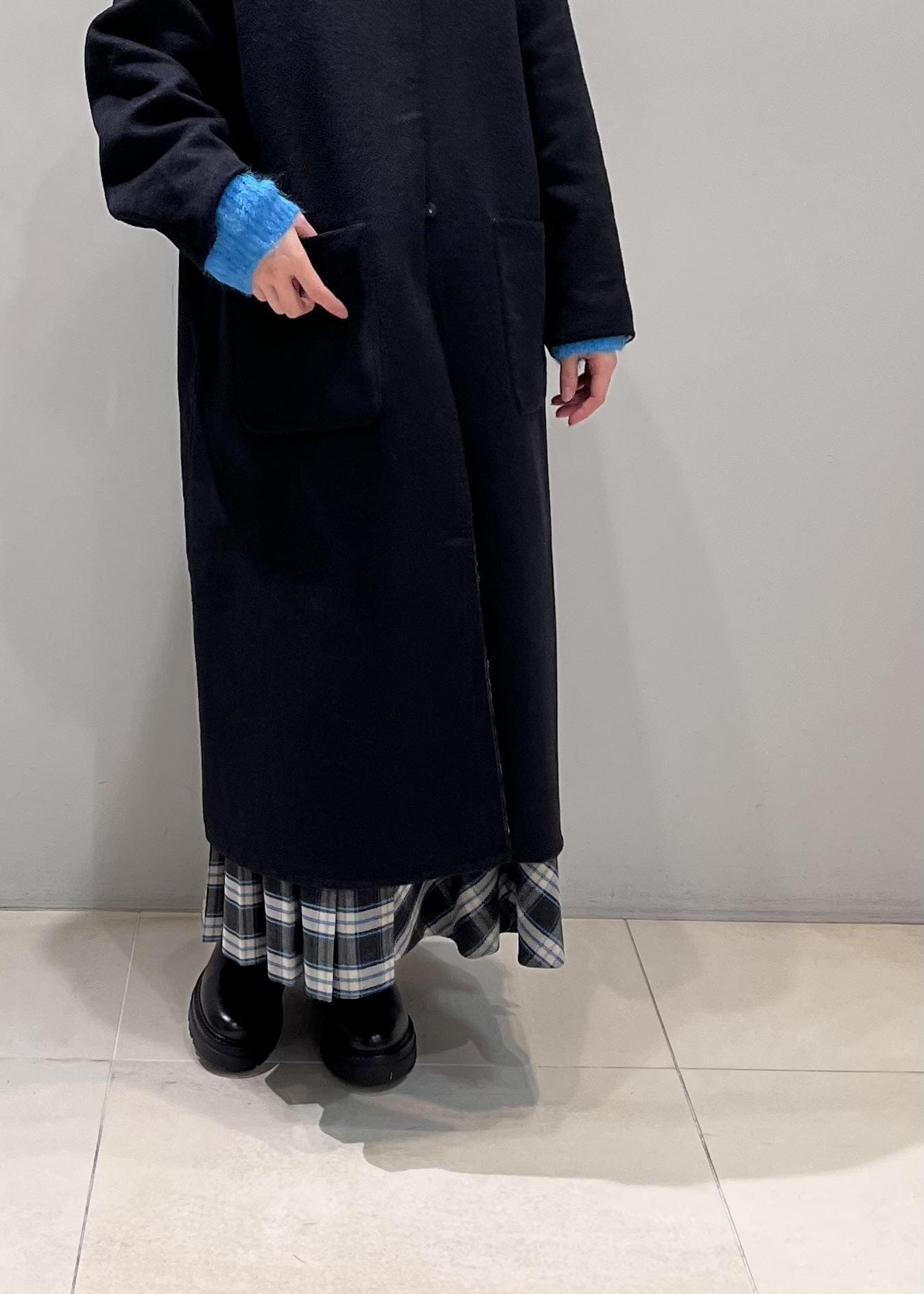 冬らしい黒のコートに鮮やかな水色を合わせ