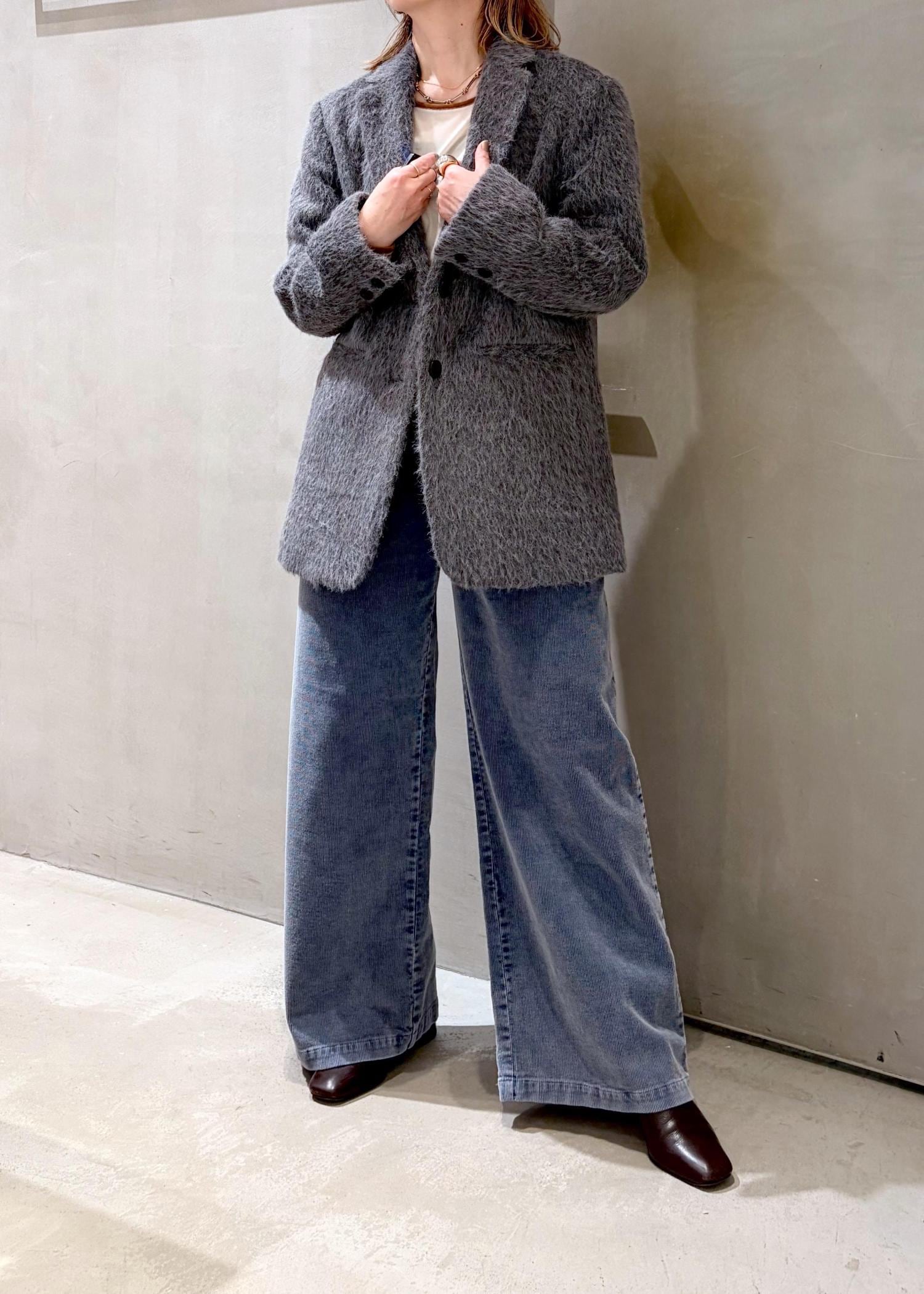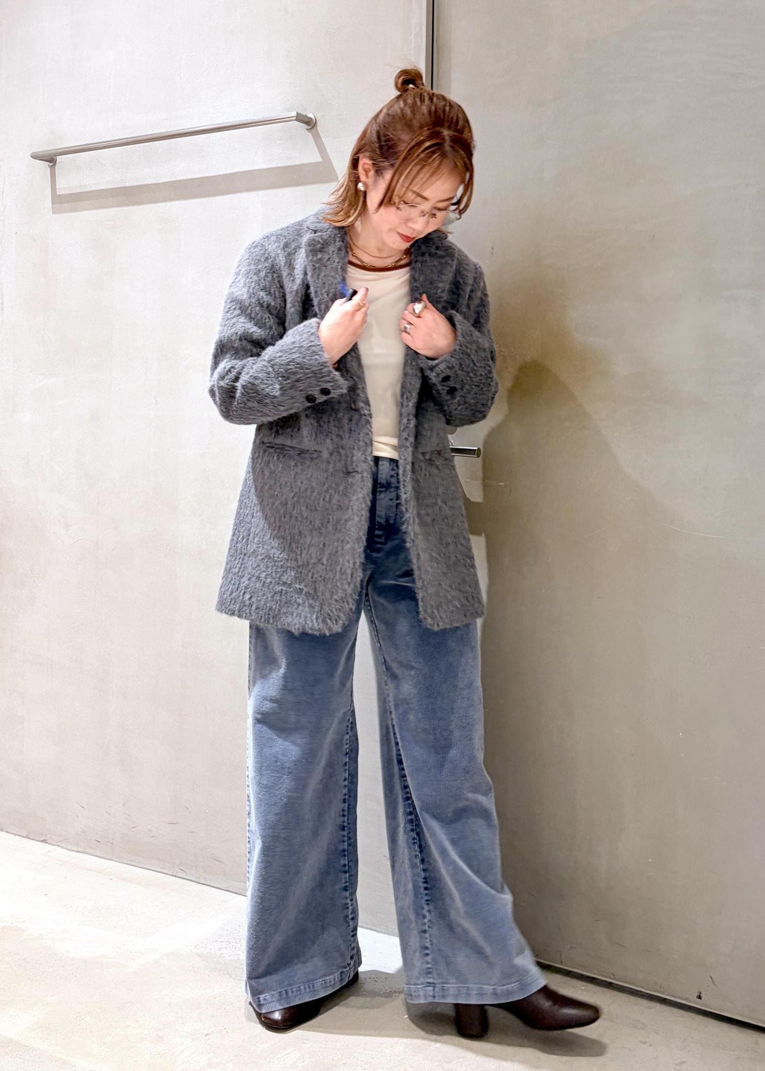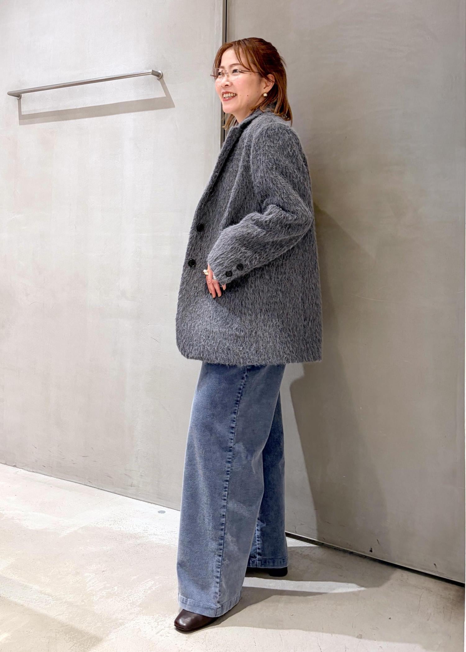 ウォーム感のあるシャギーが女性らしく、今回はビンテージ感のあるコーデュロイパンツに合わせて、少しメンズライクに着用してみました。