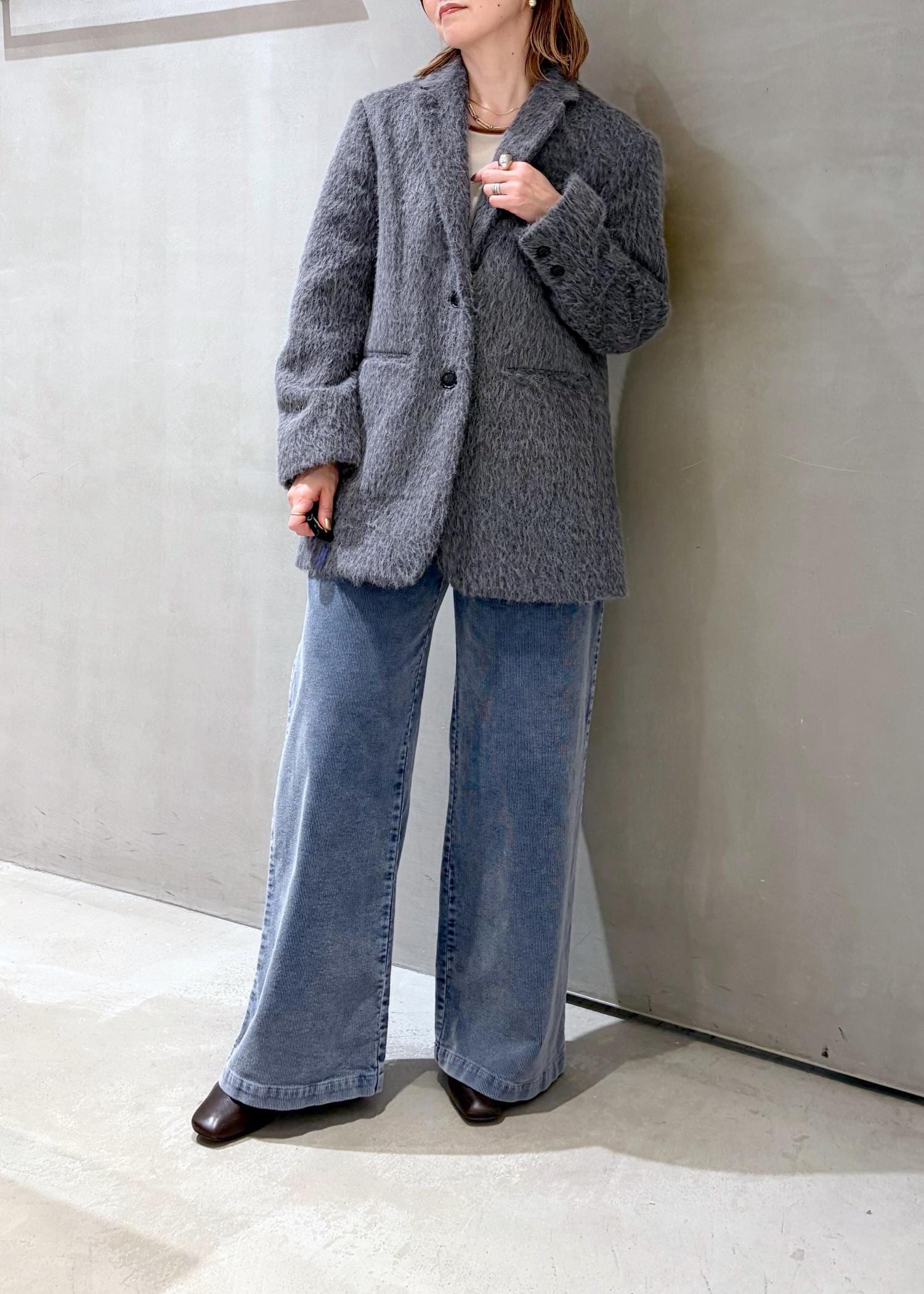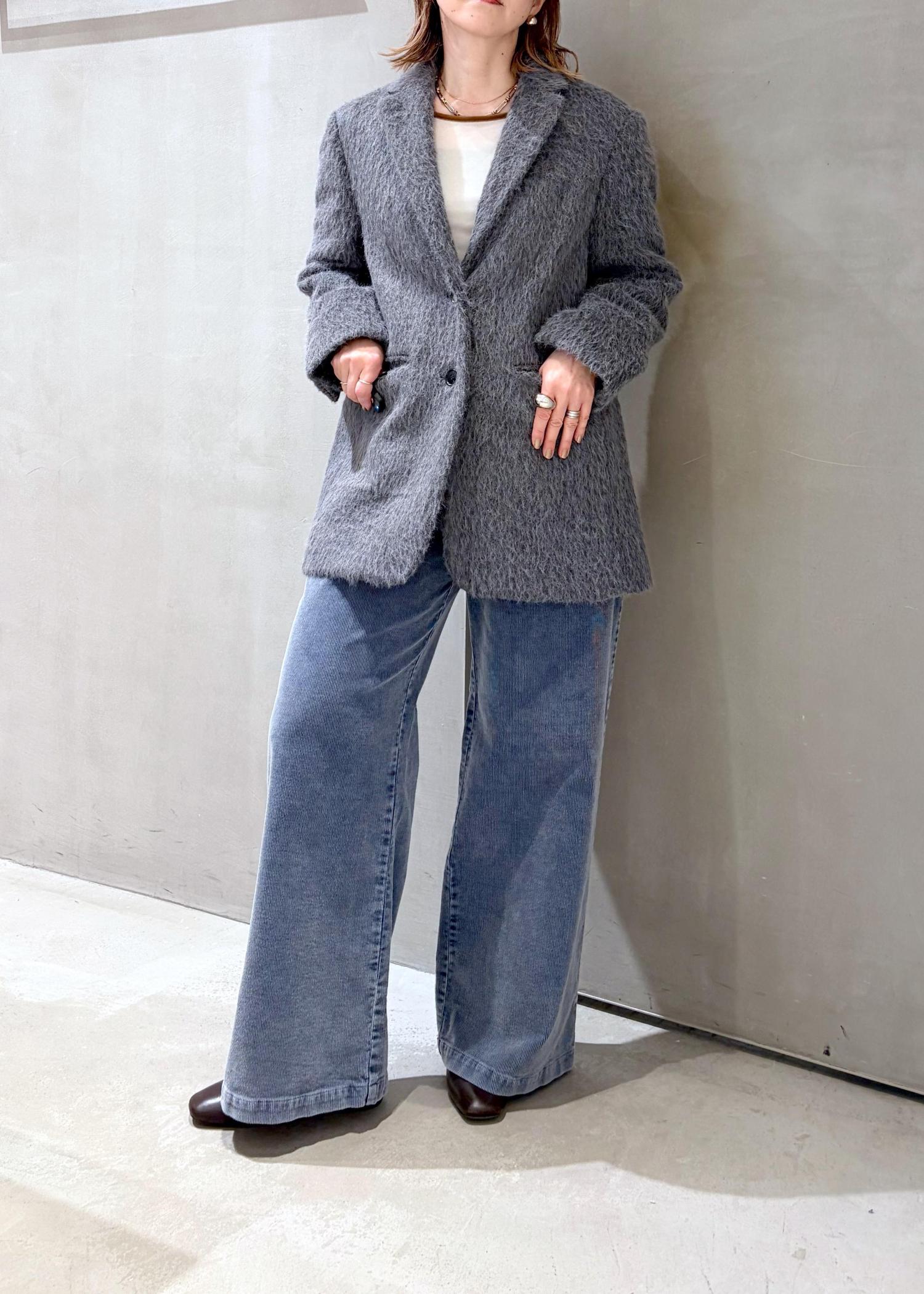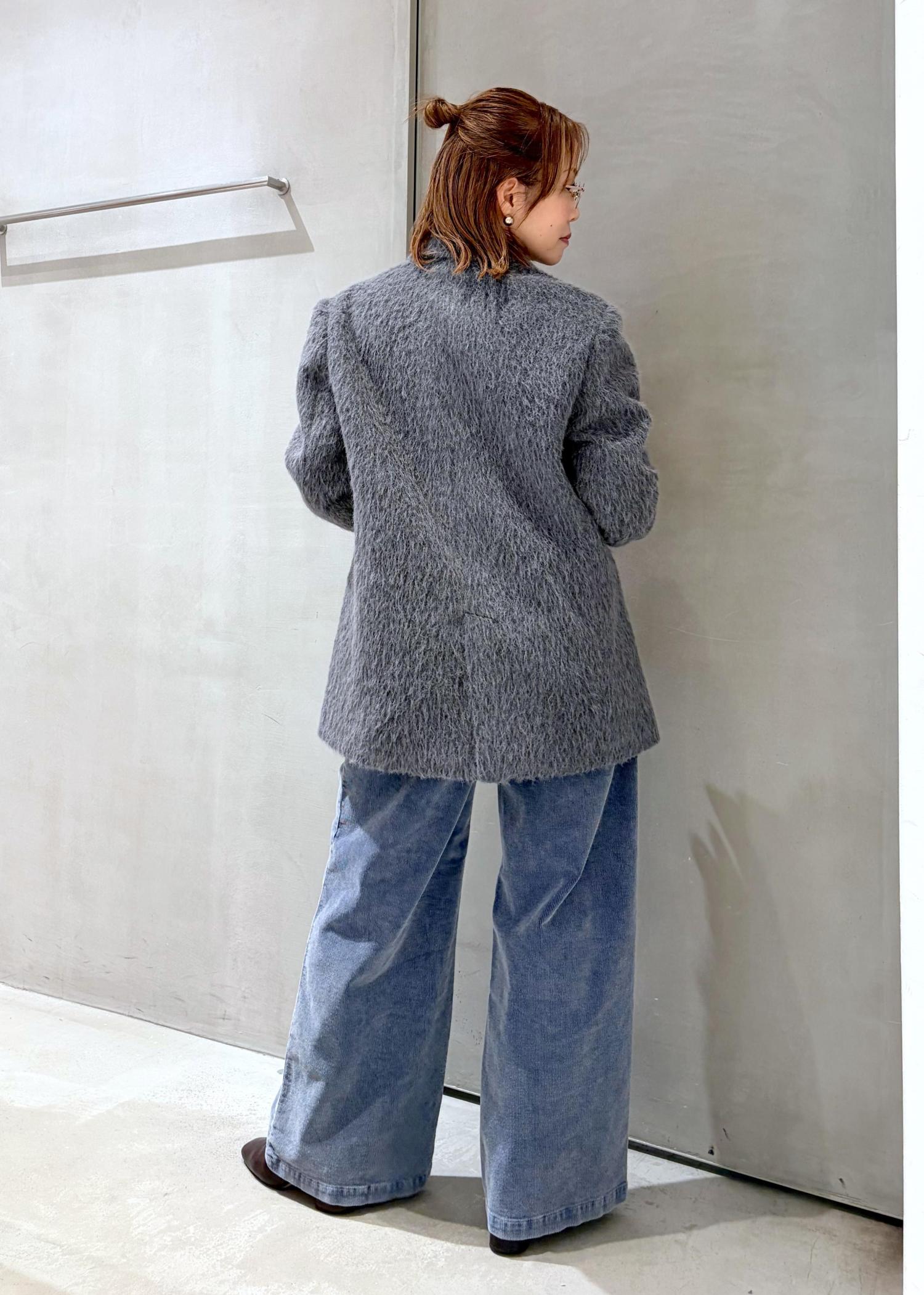 ウォーム感のあるシャギーが女性らしく、今回はビンテージ感のあるコーデュロイパンツに合わせて、少しメンズライクに着用してみました。
