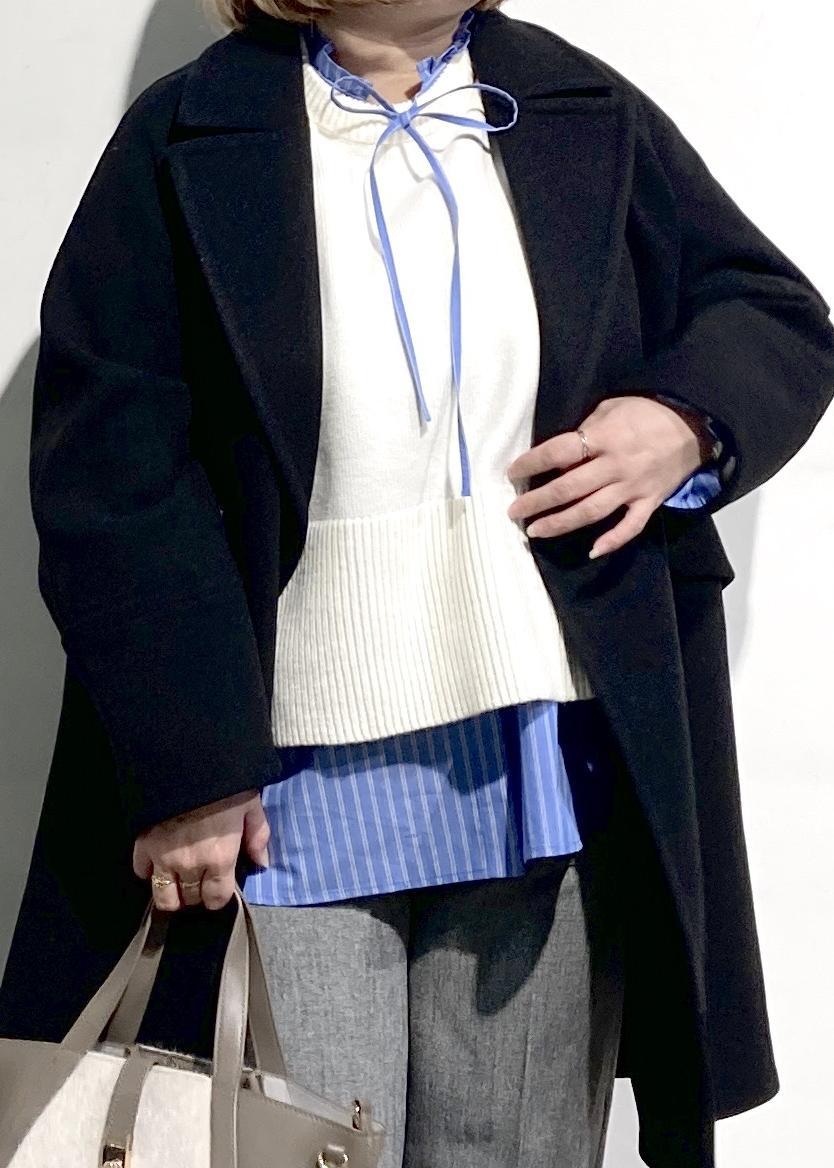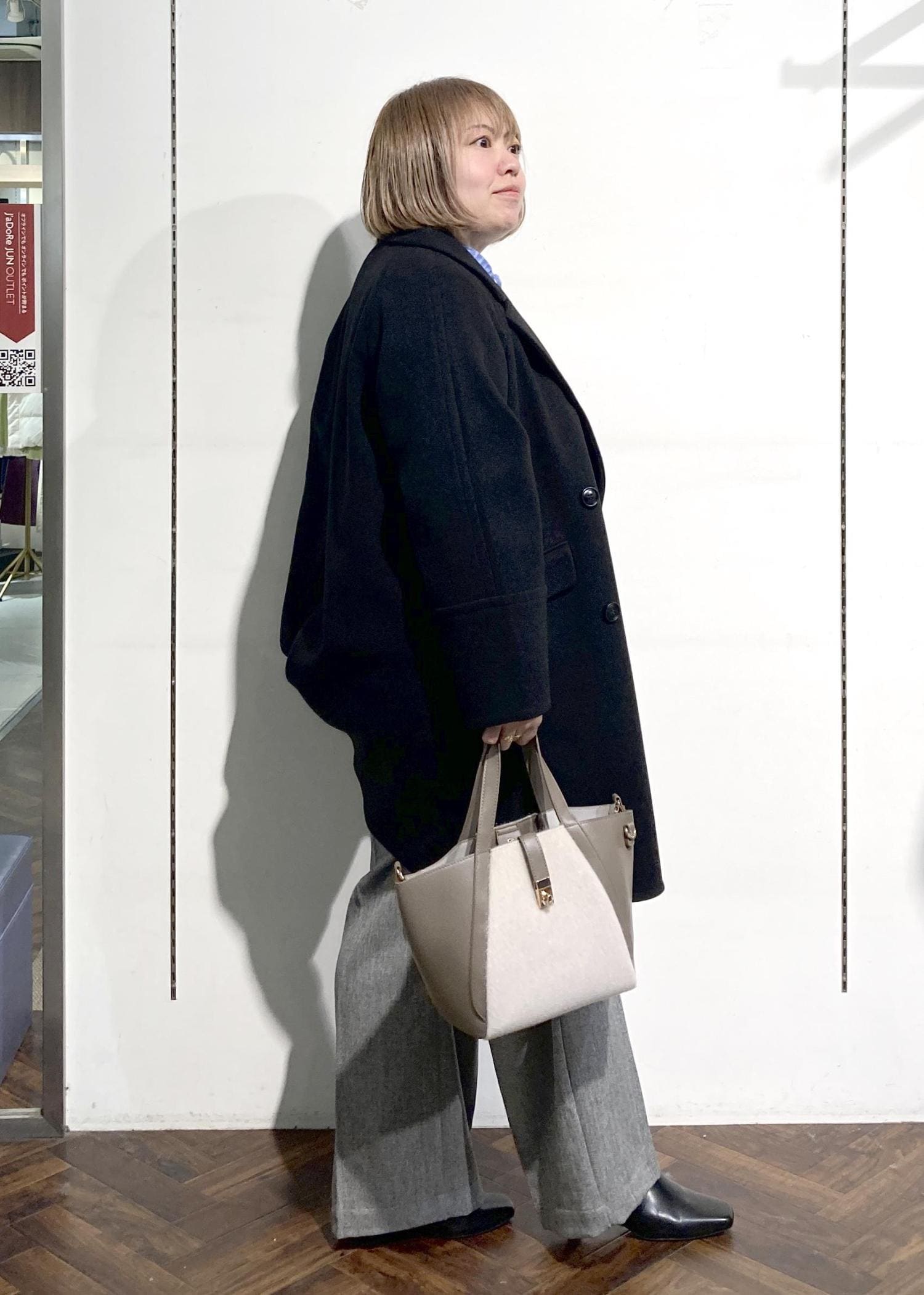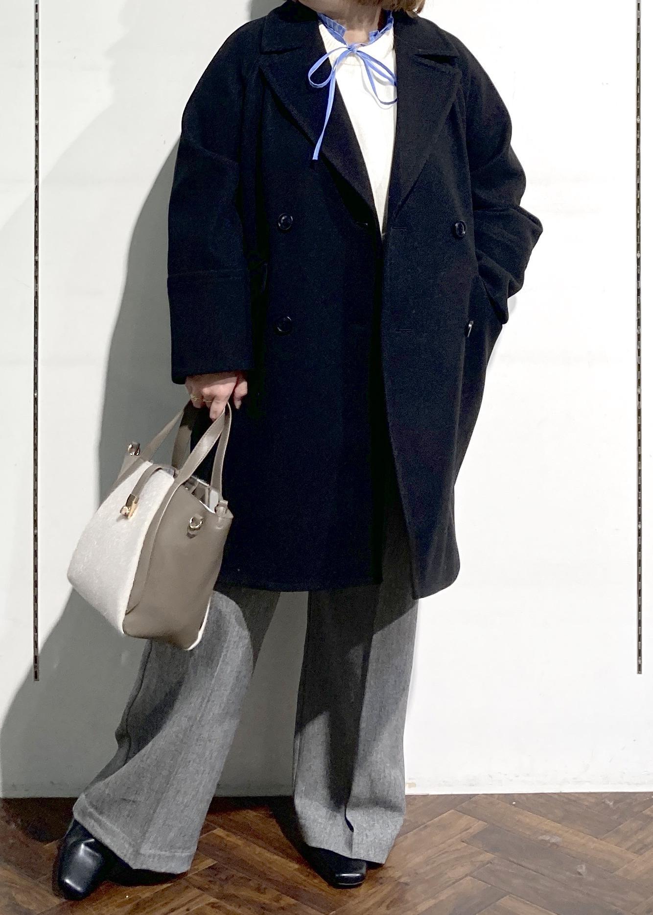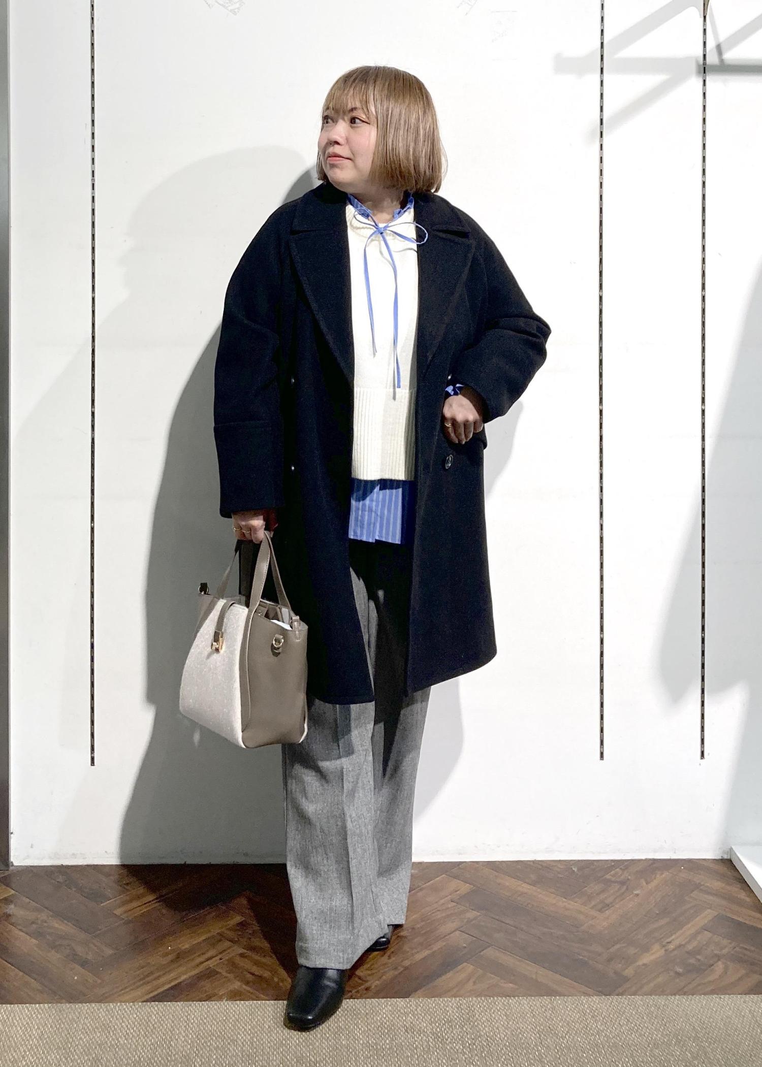 ゆとりのあるサイズ感のコートなので、カジュアルスタイルにも◎