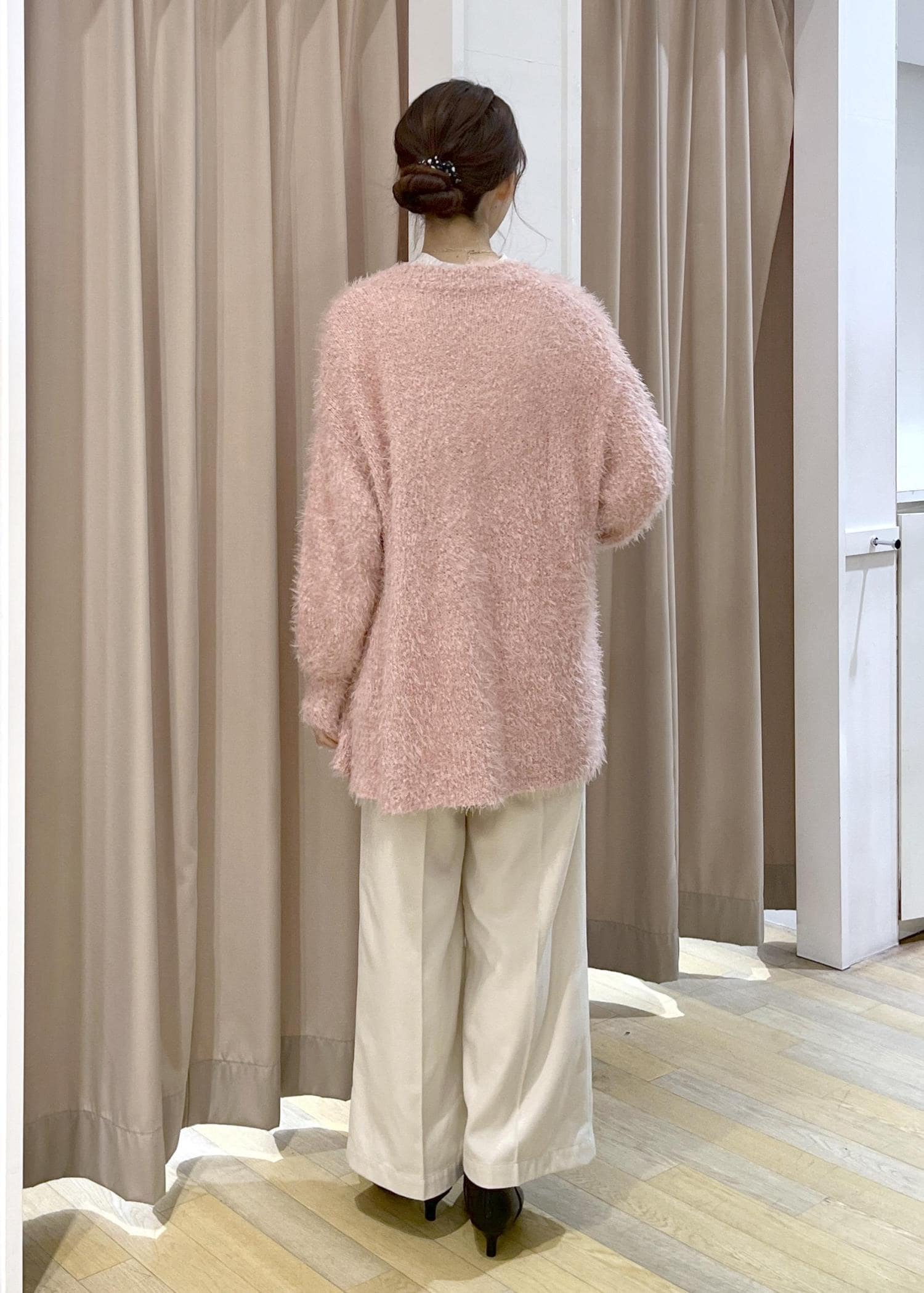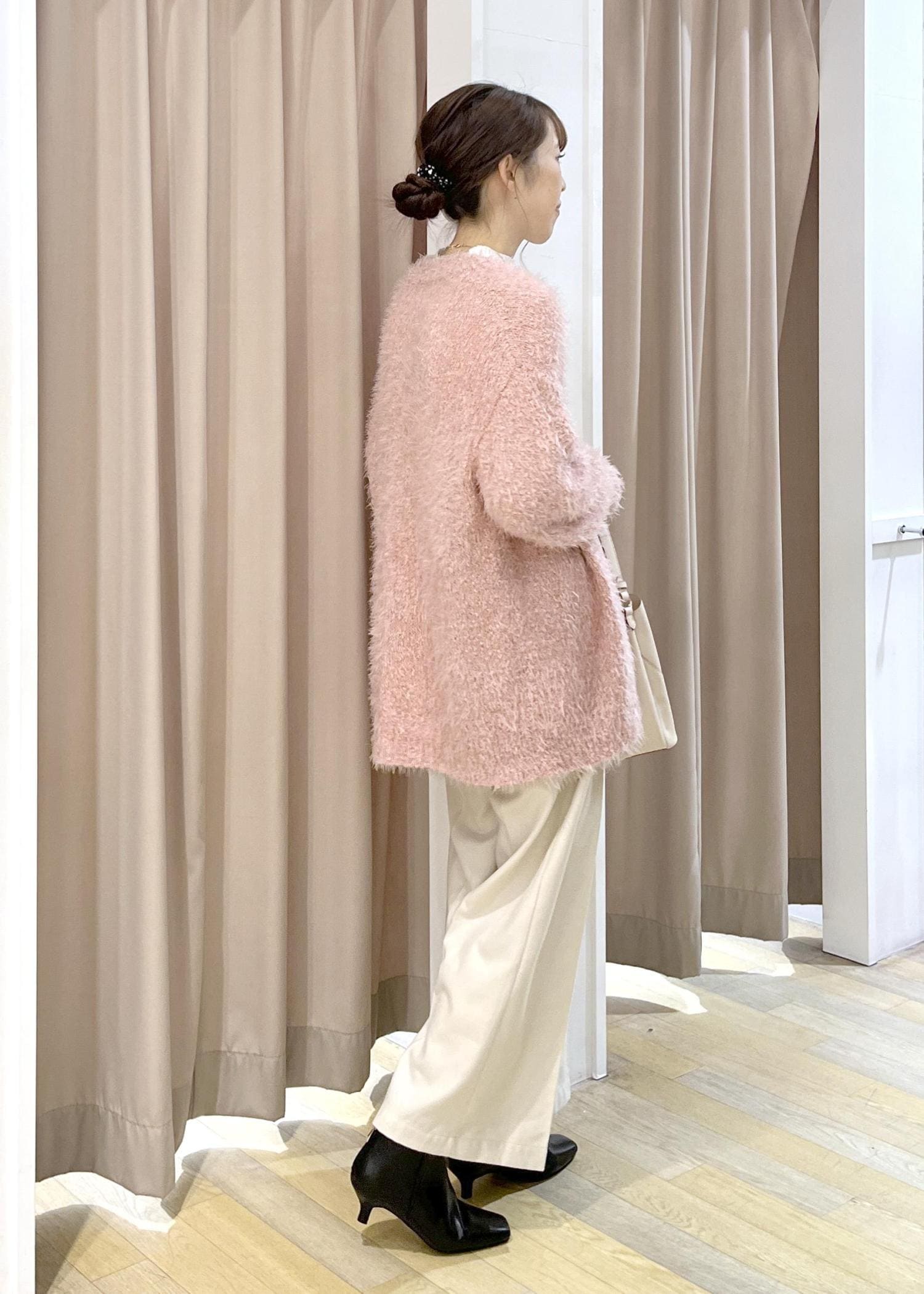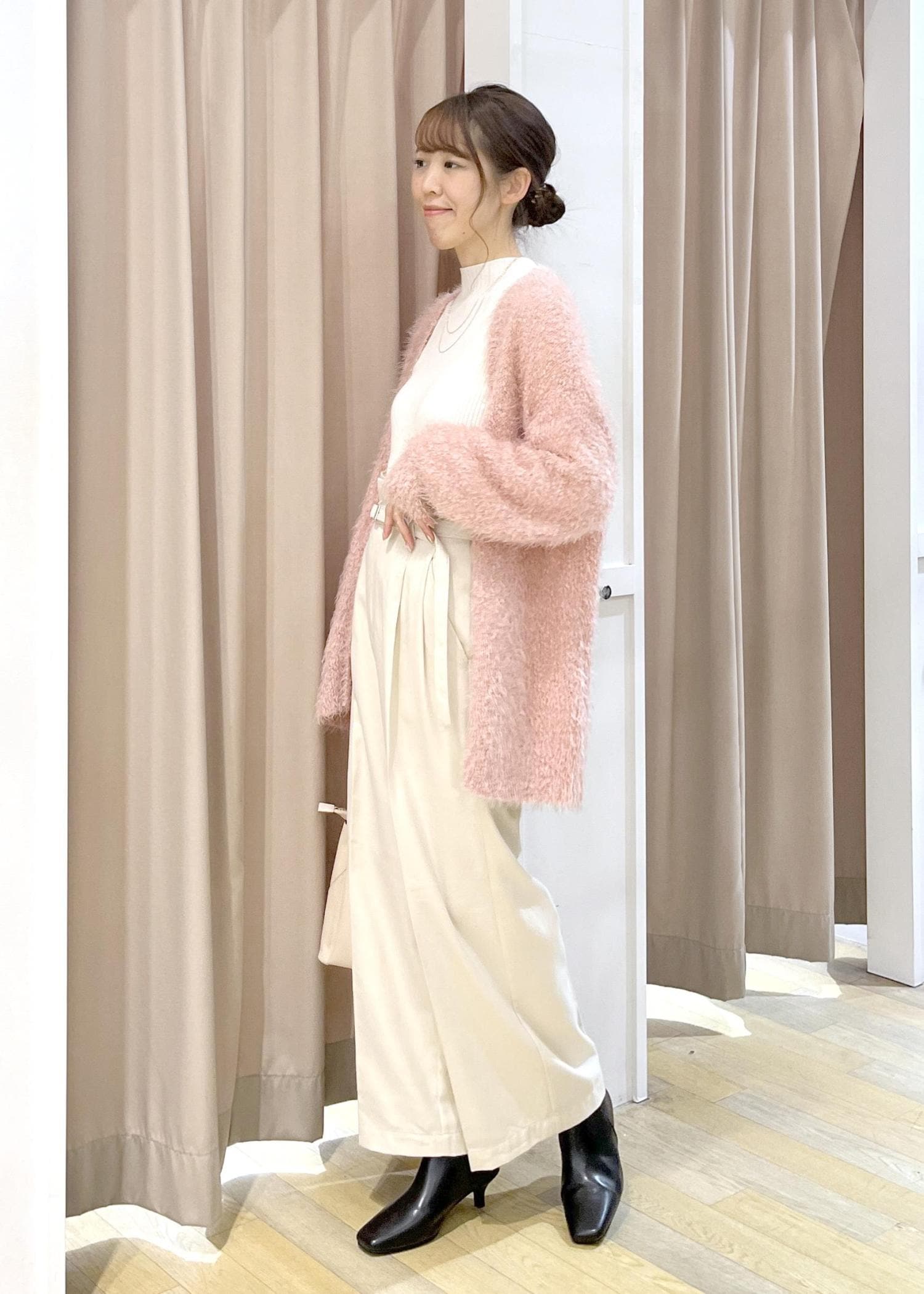 ピンクのポップコーンヤーンラメフェザーニットカーディガンと白コーデ
