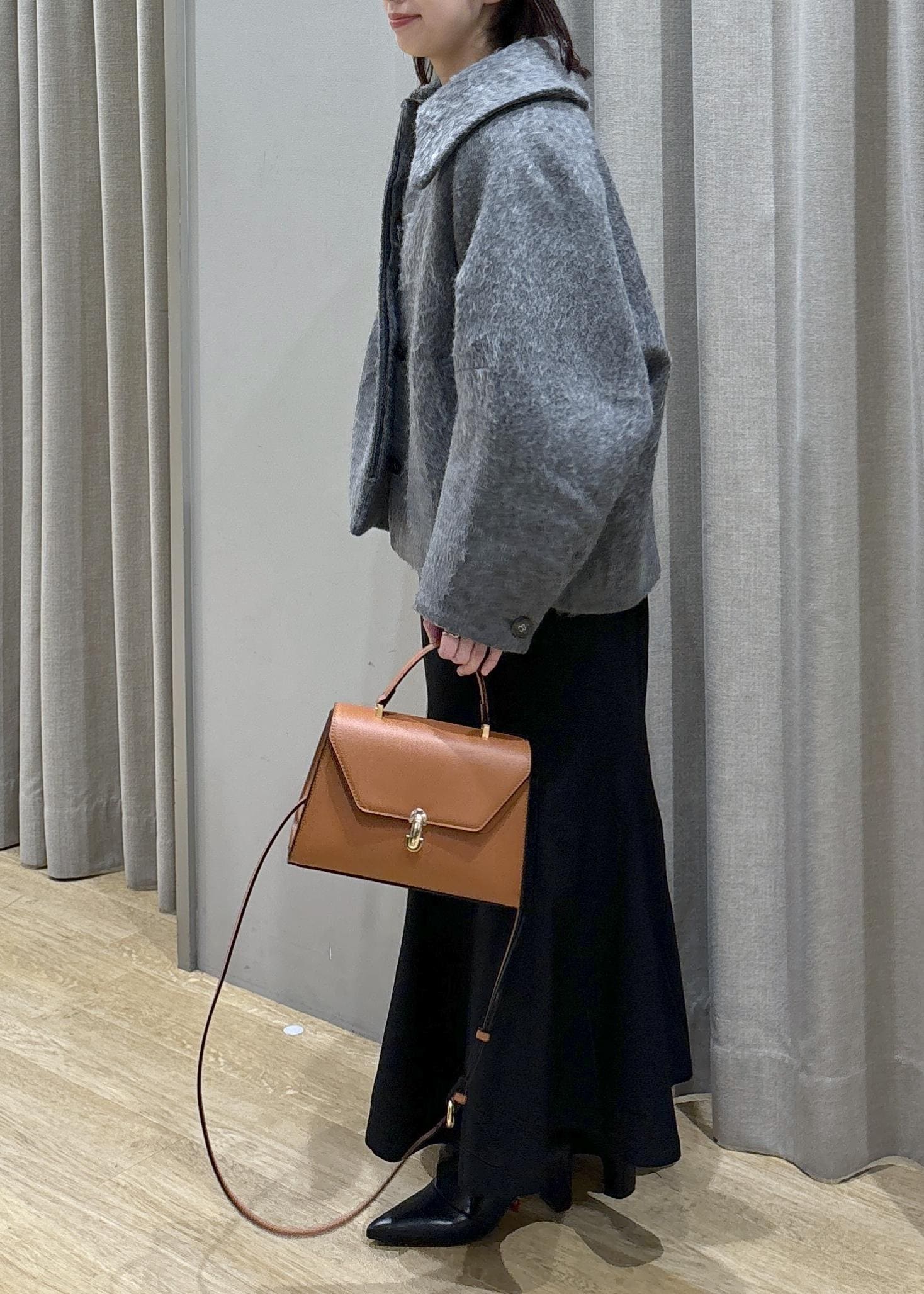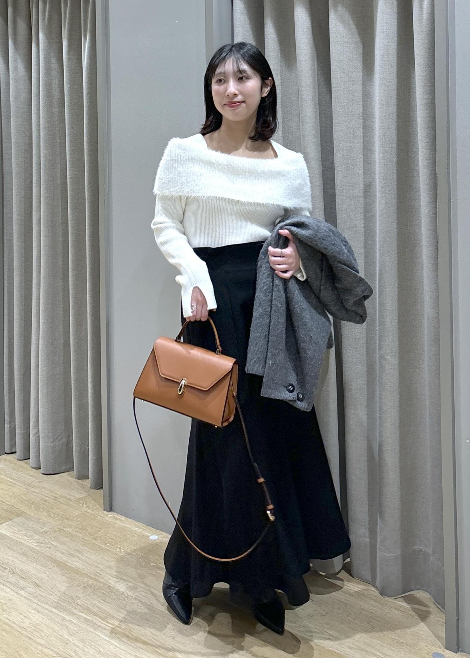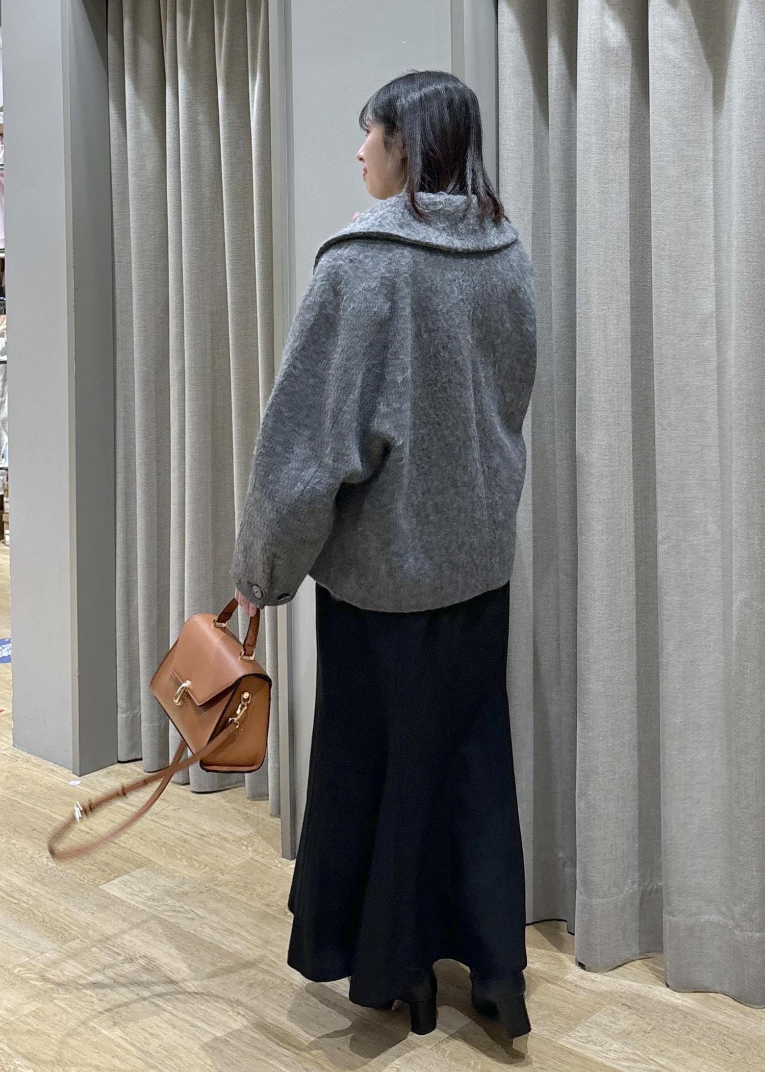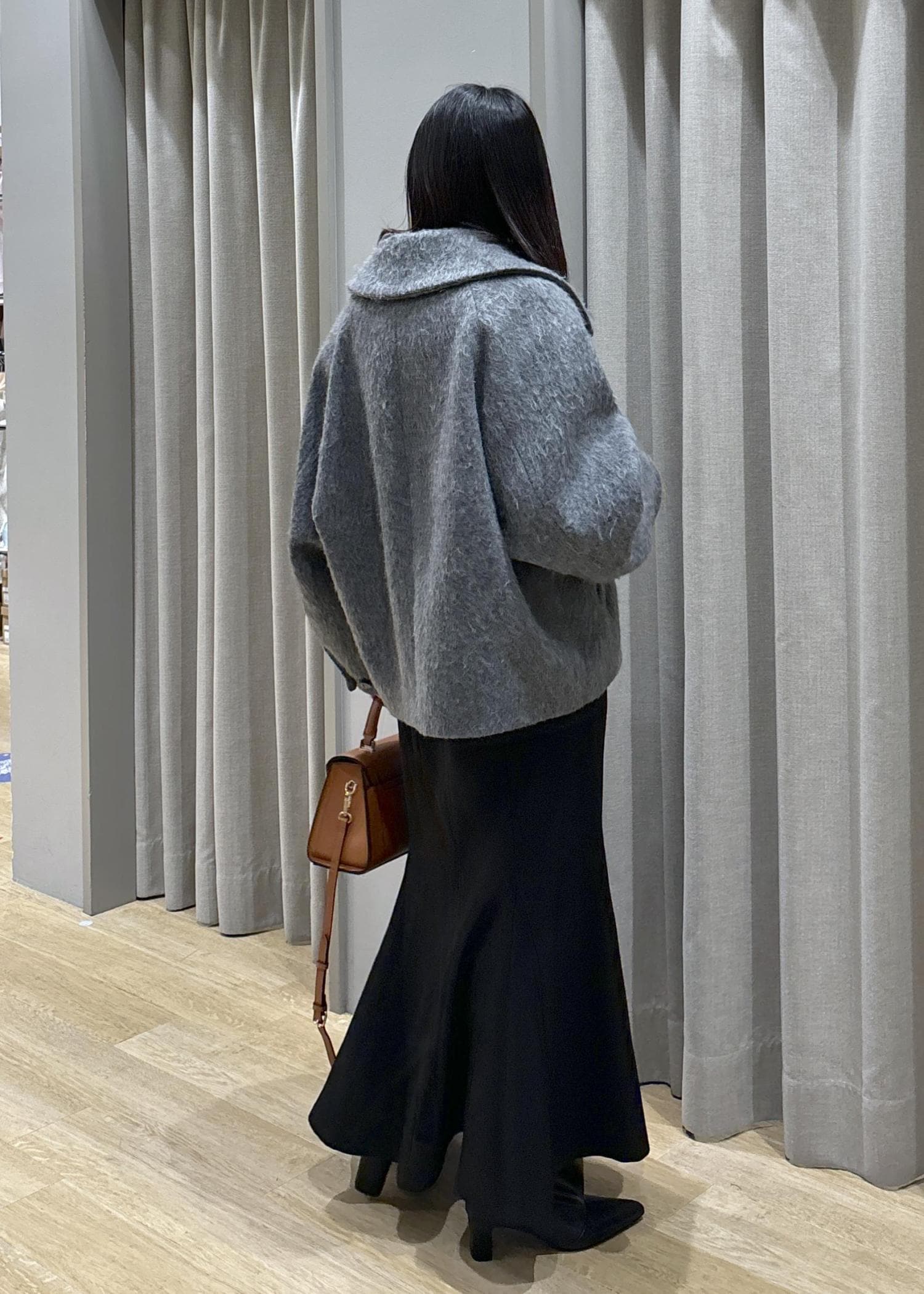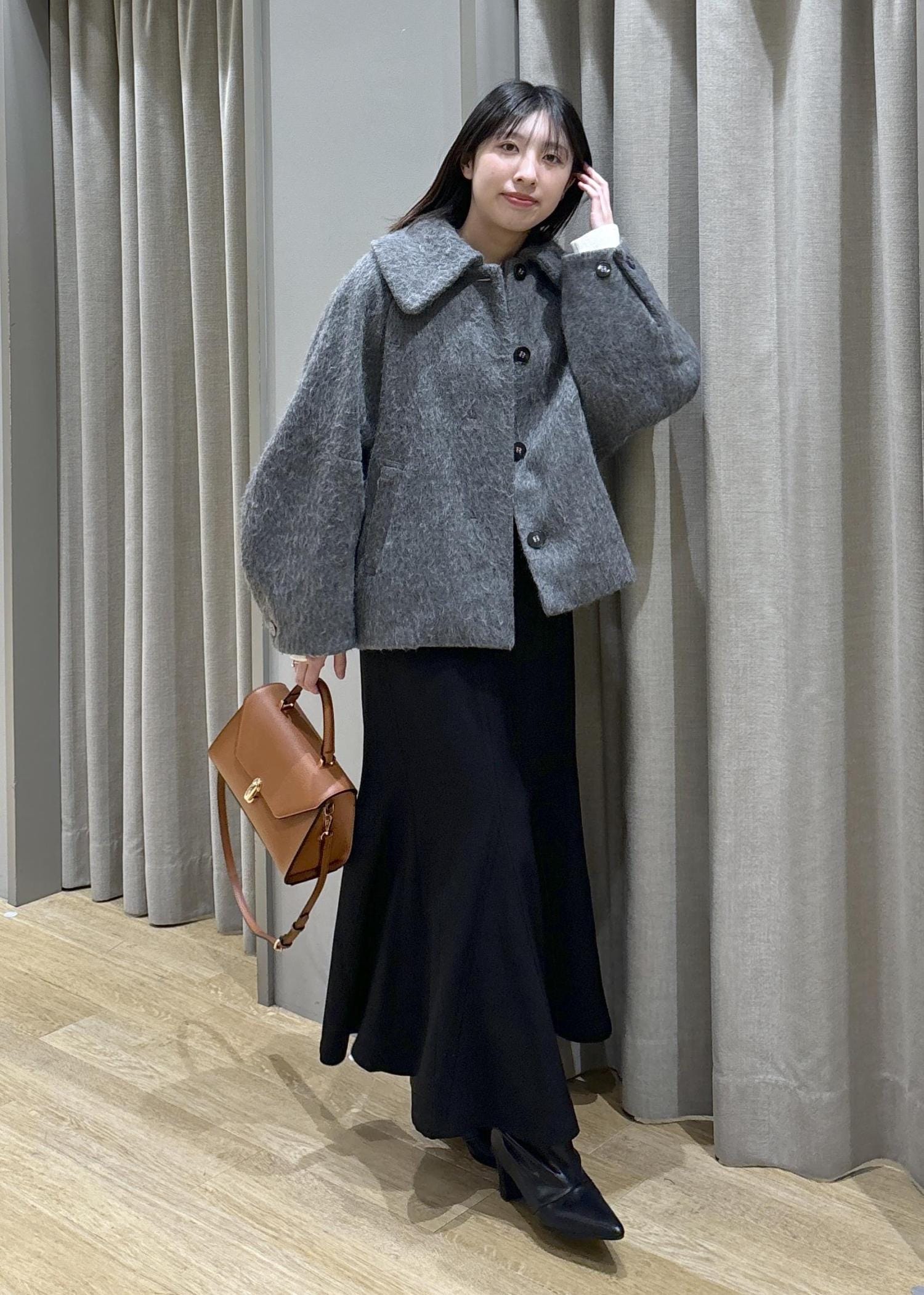 モモンガショートコート×フェザーヤーンオフショルニット×マーメイドスカート