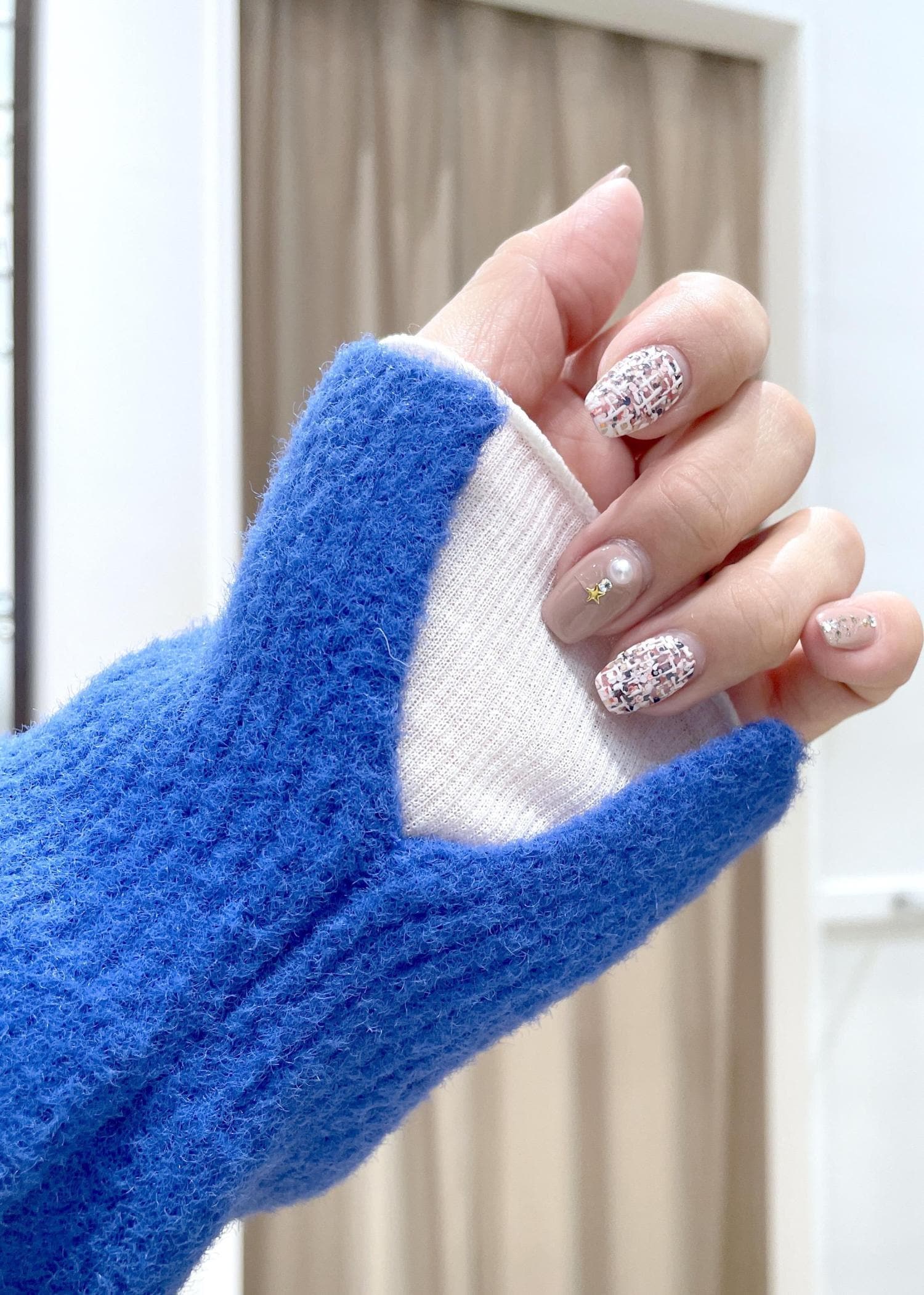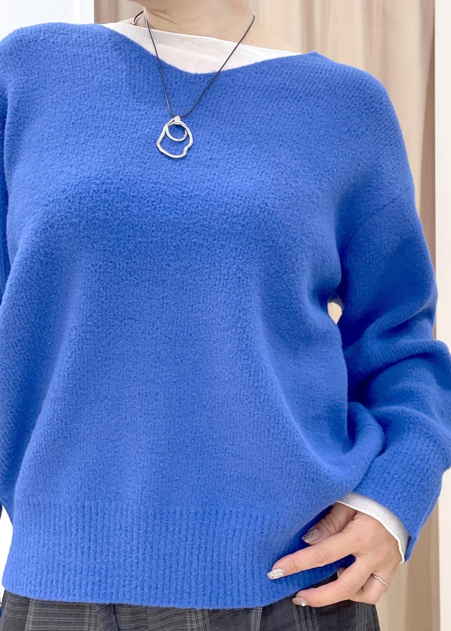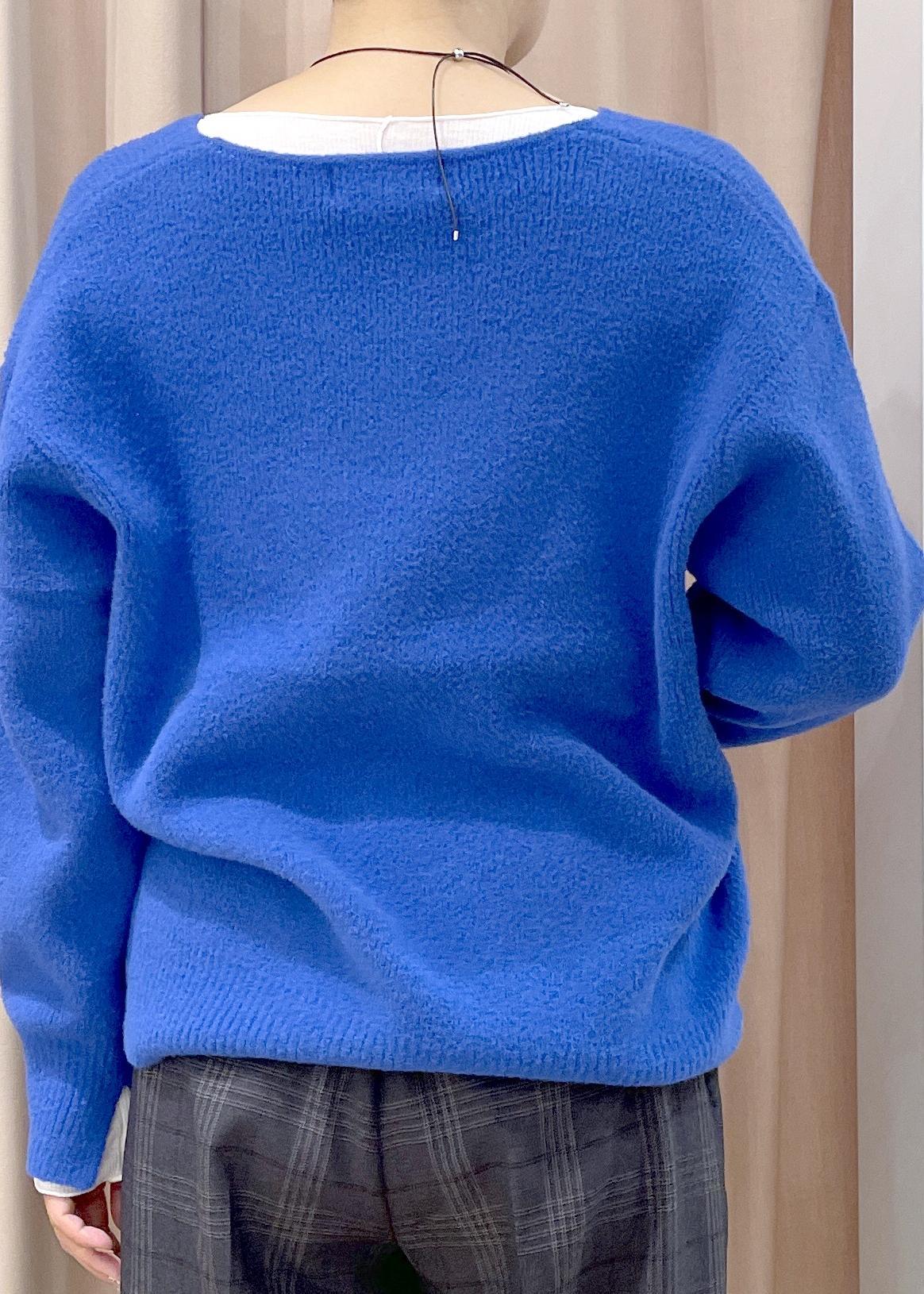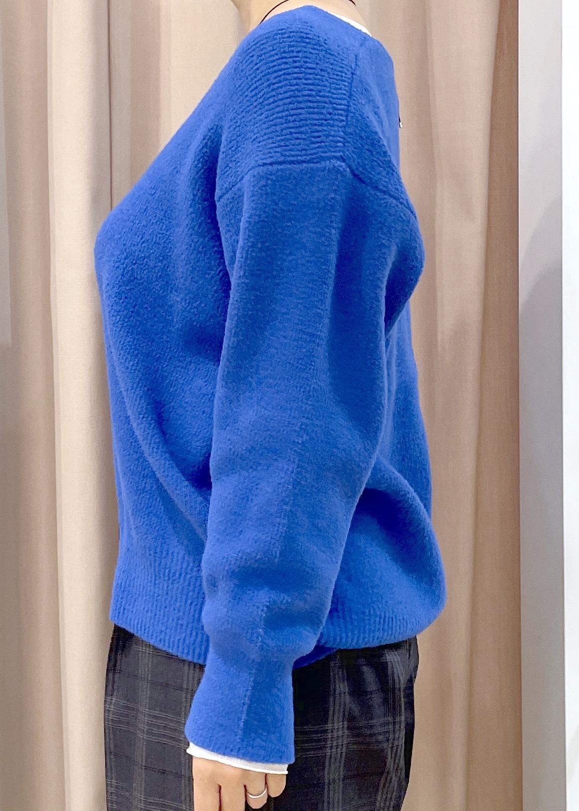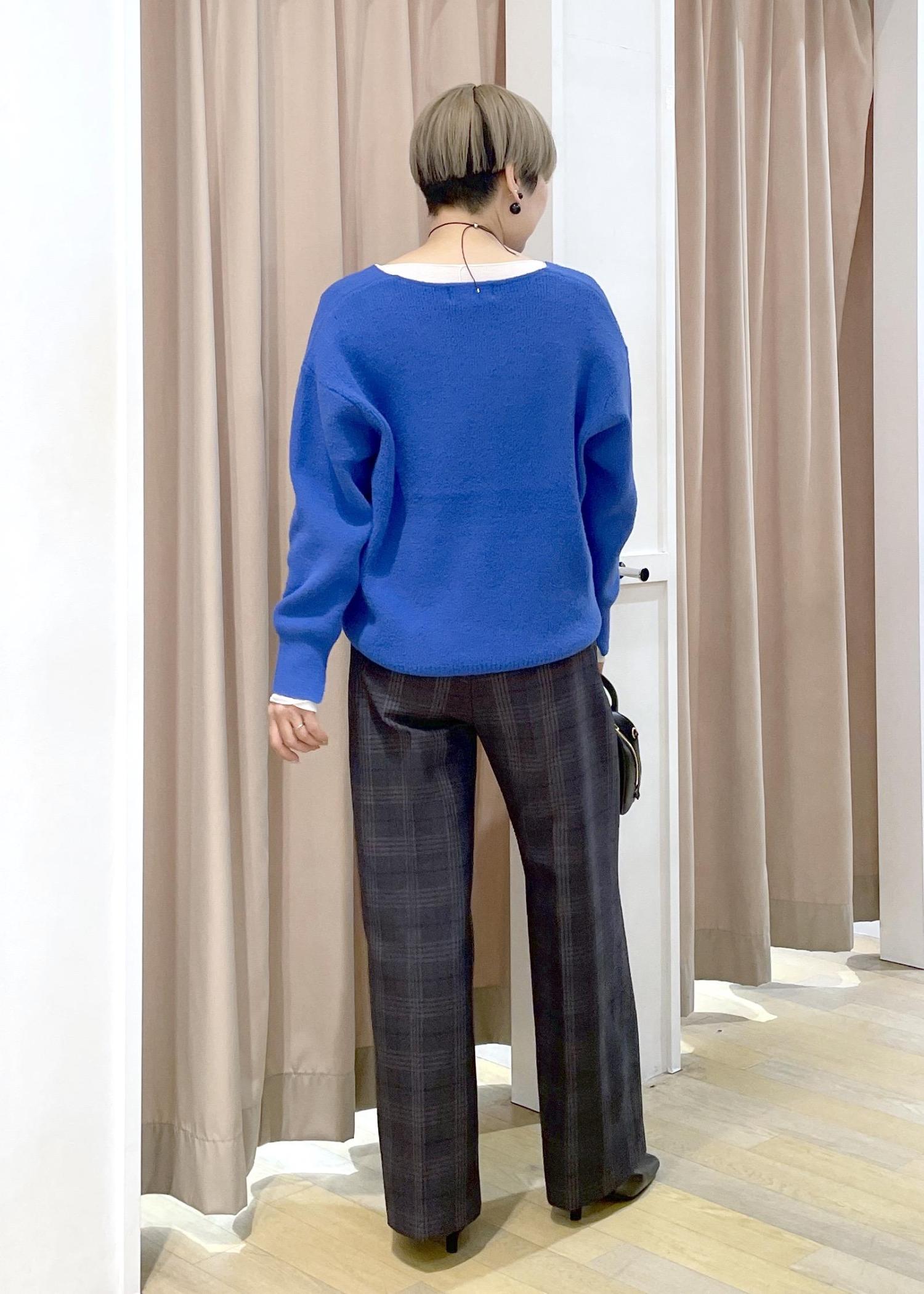 キレイなロイヤルブルーが目を引くふわもちニットに、チャコールのグレンチェックパンツを合わせた大人コーデです。