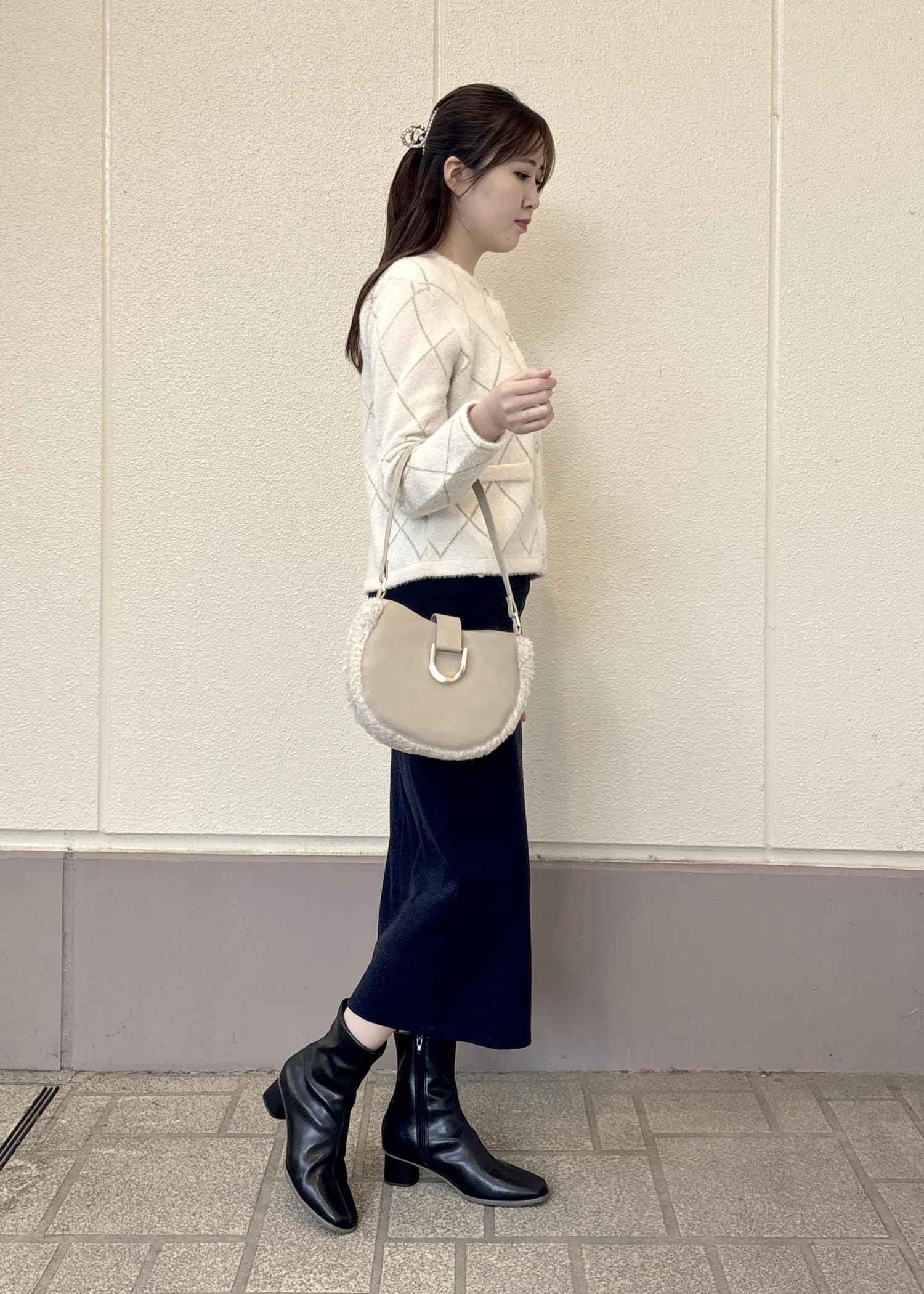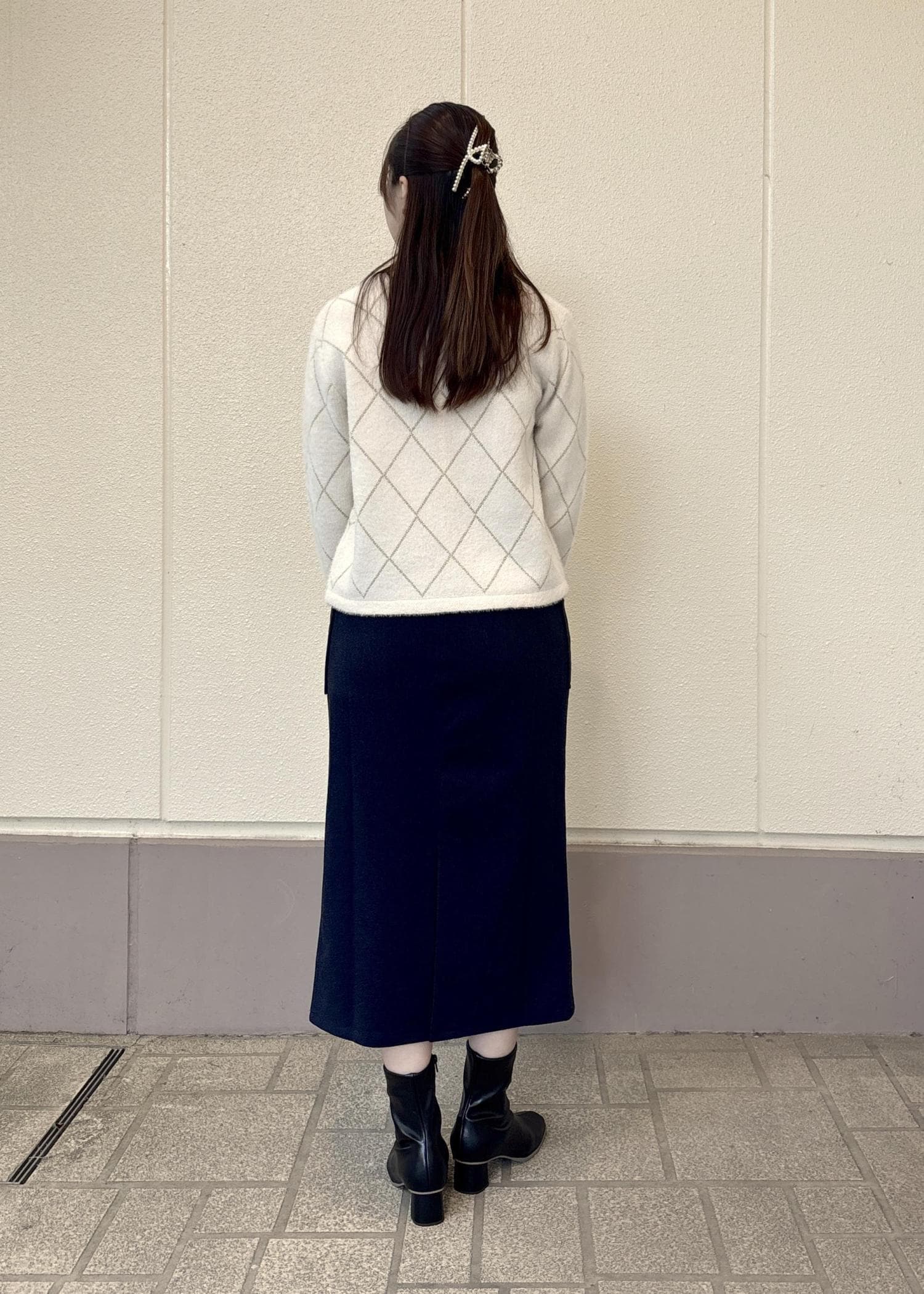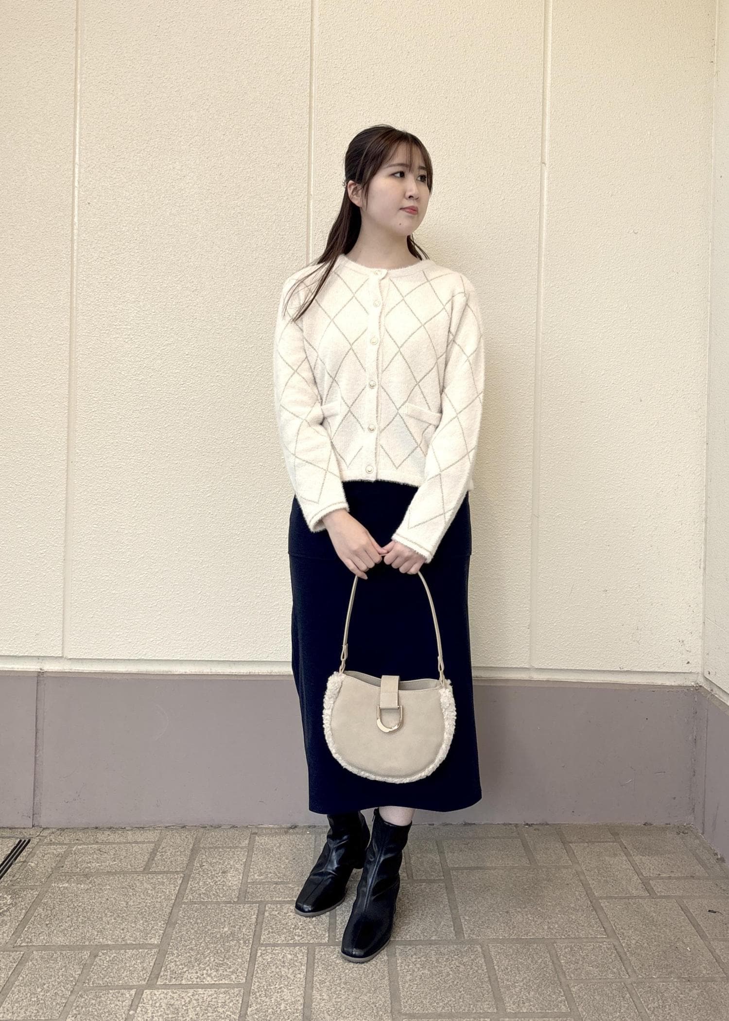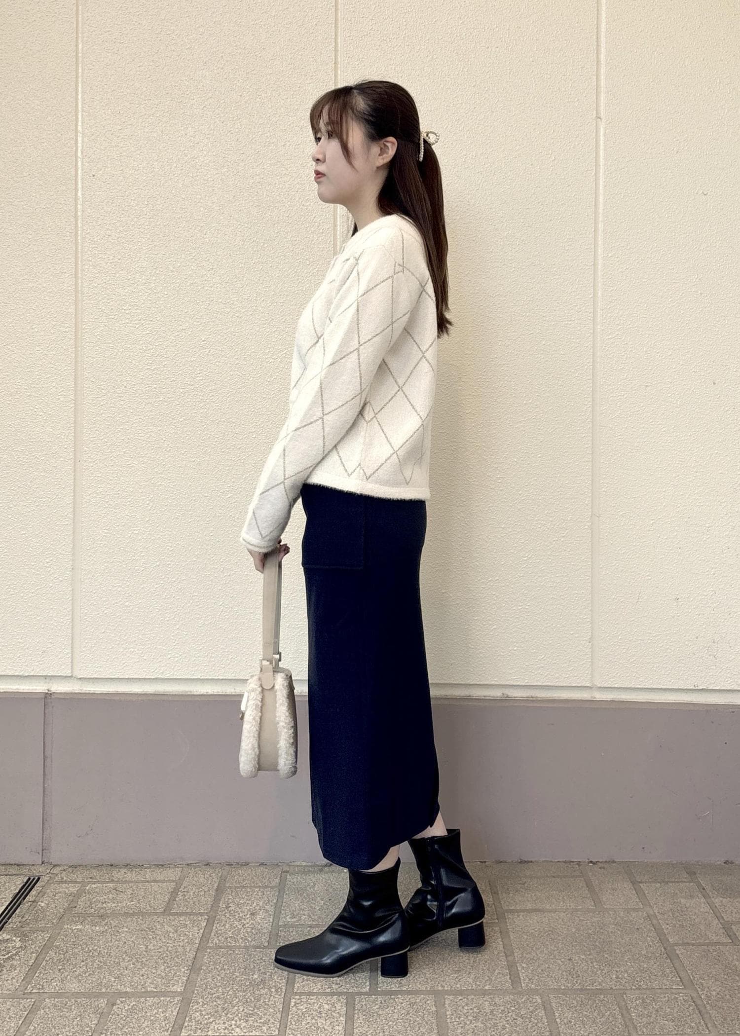 カーディガンが白なので、スカートは体型がぼやけないネイビーのタイトめなスカートで合わせてみました!