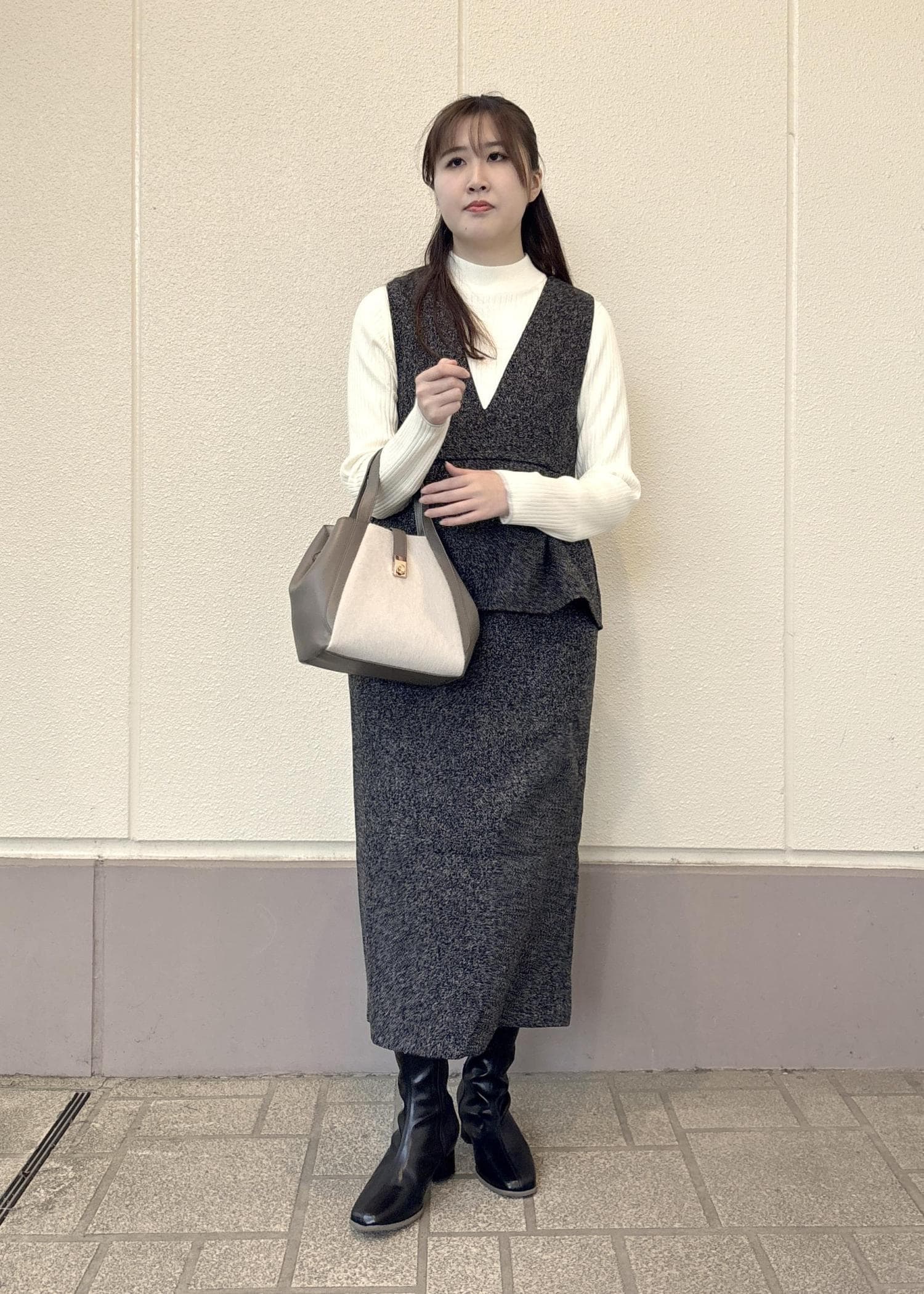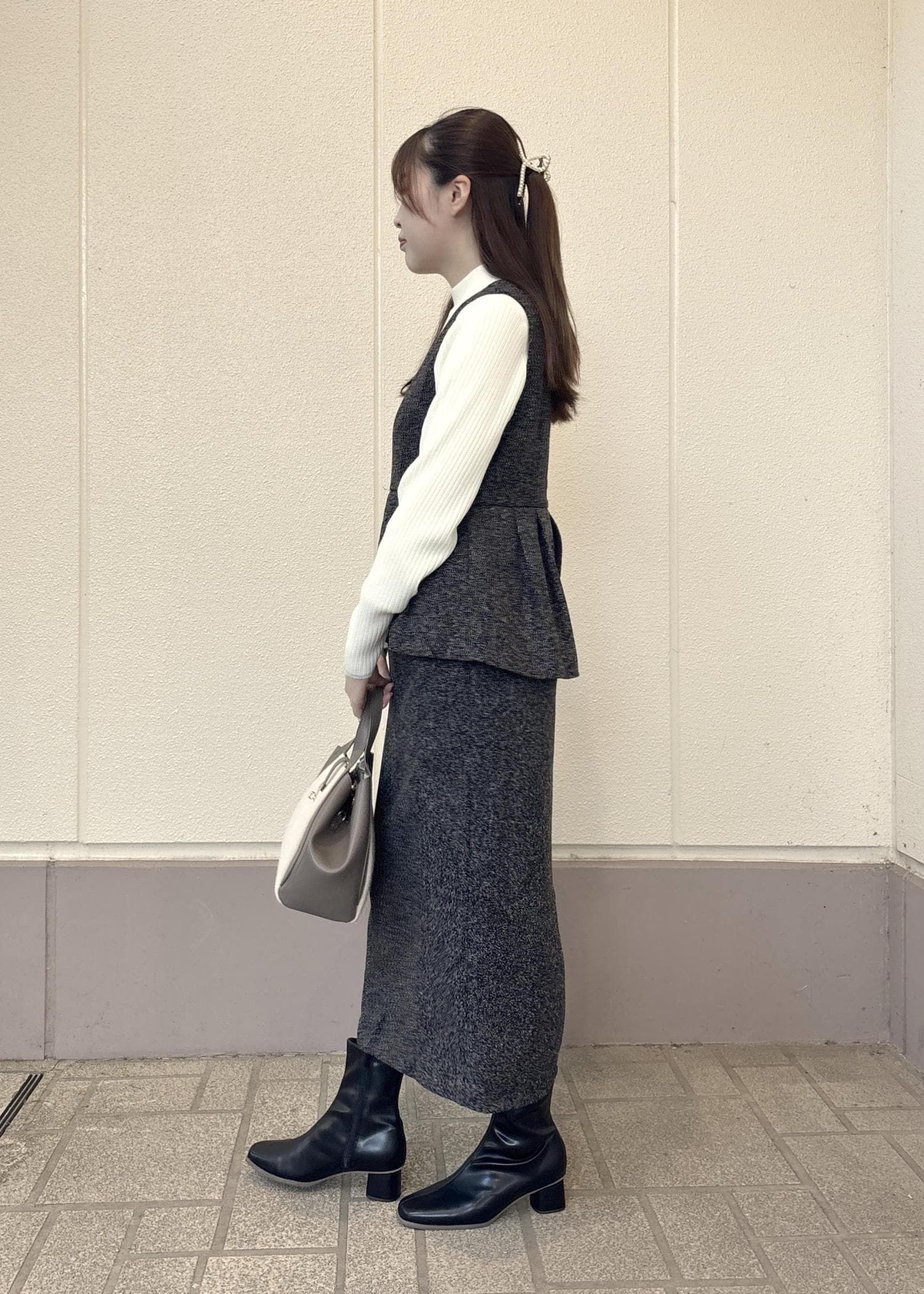 インナーにはスリムフィットなニットを合わせることでバランスをとっています。