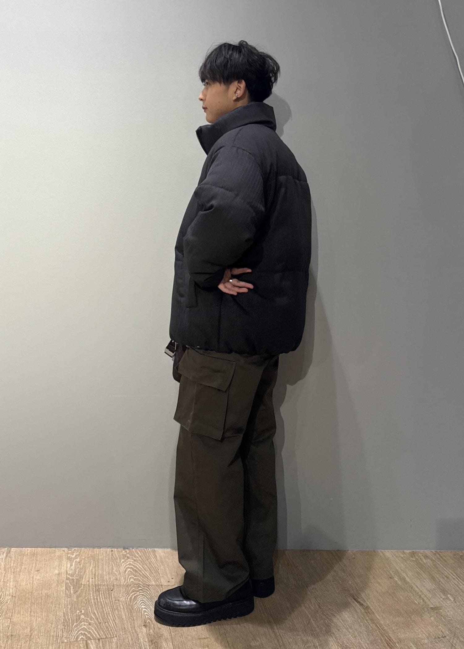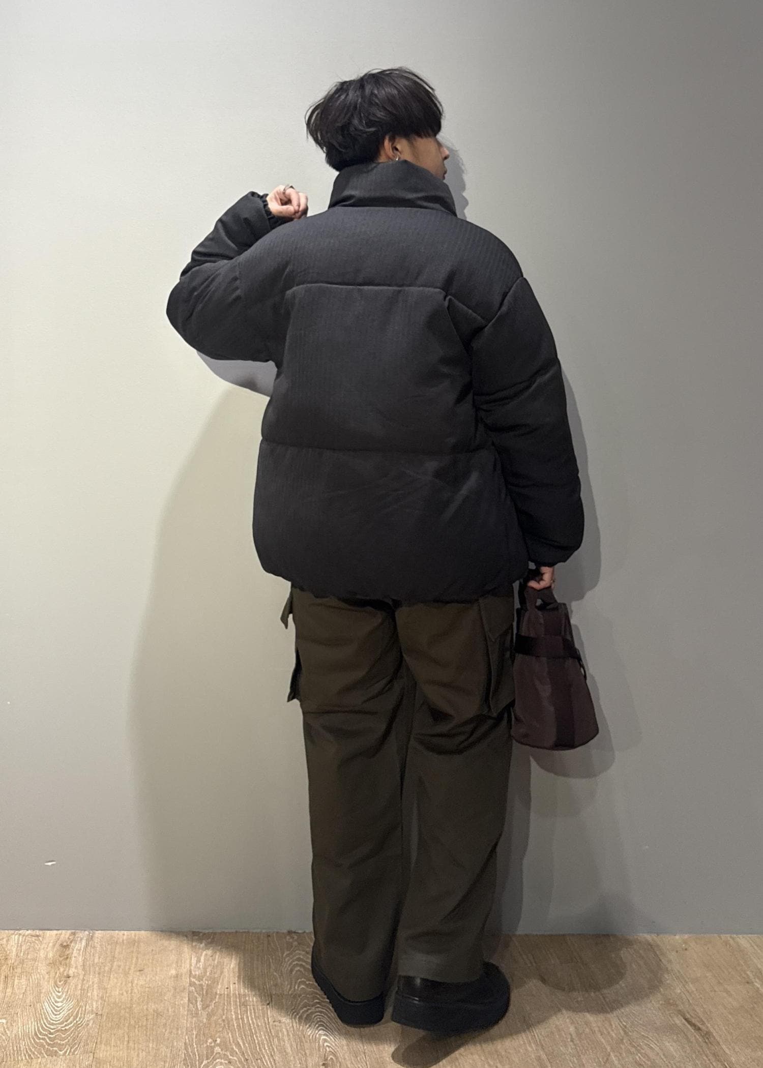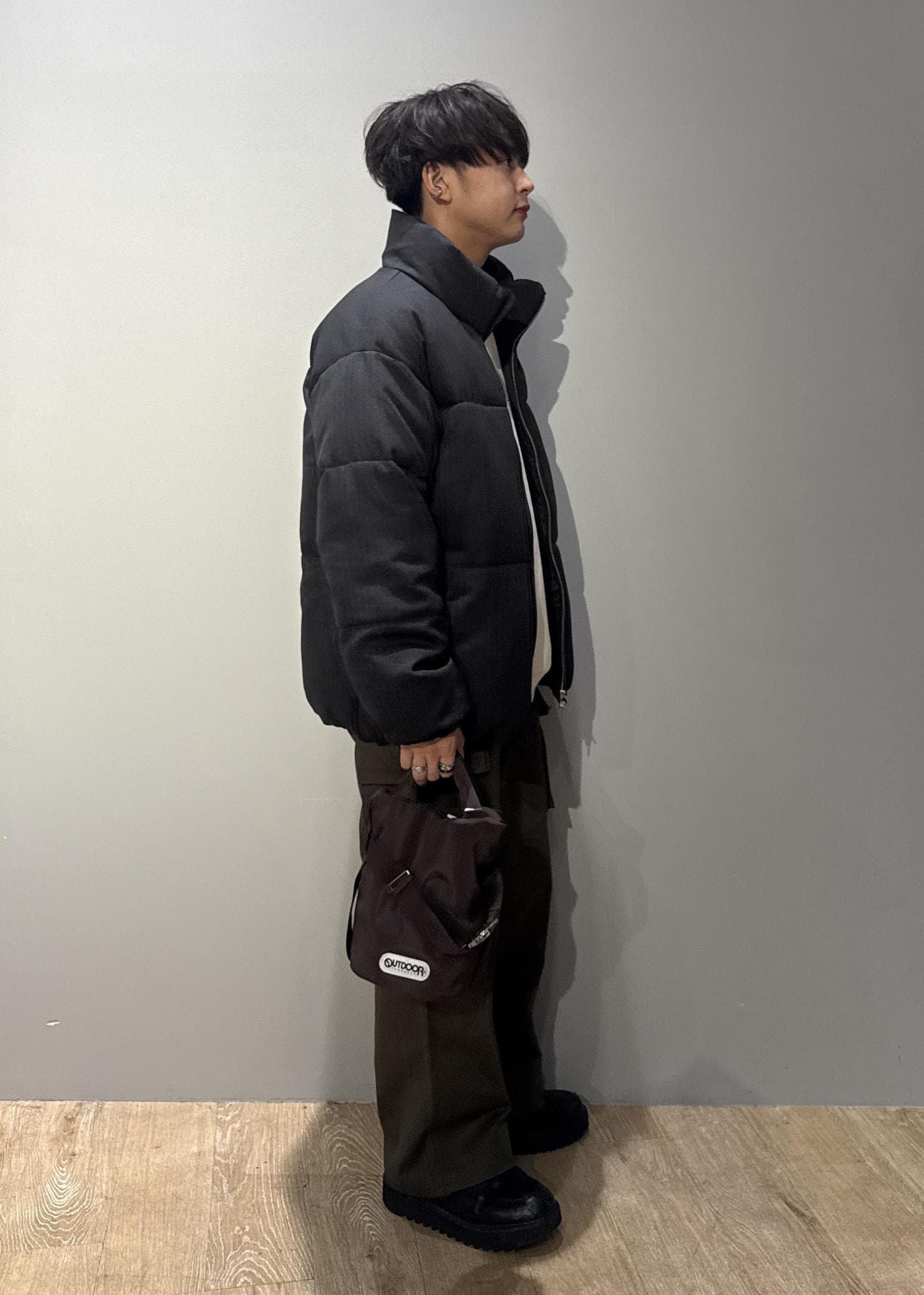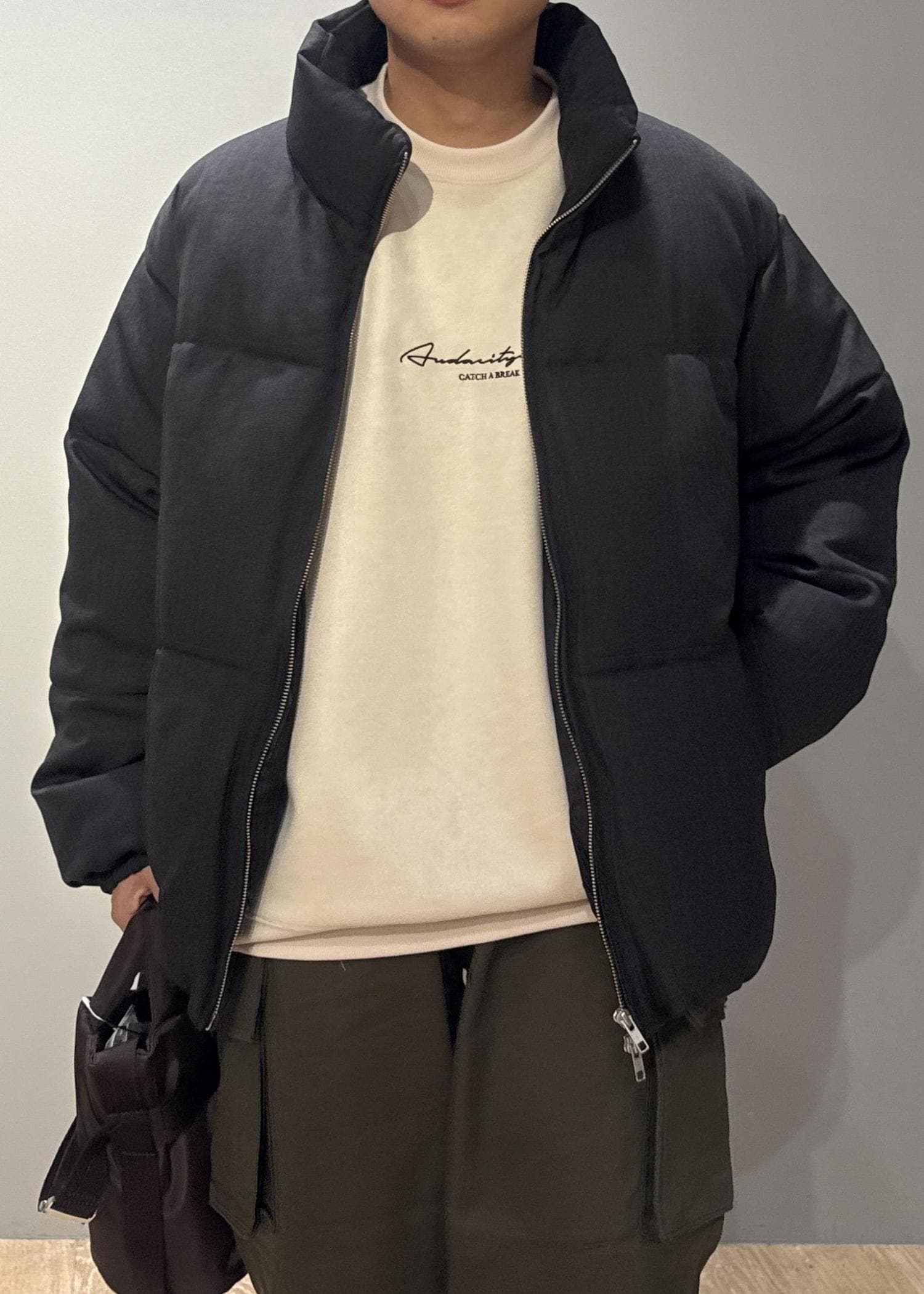 今回はウールライク中綿ブルゾンを使ったコーデです。明日カラーでまとめモードなスタイリングにしつつも季節感も取り入れたコーデにしています。