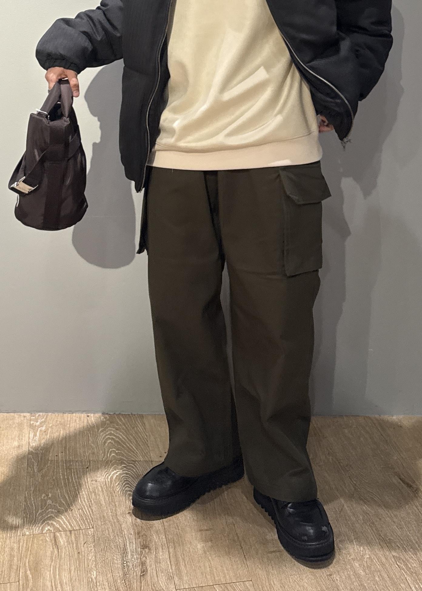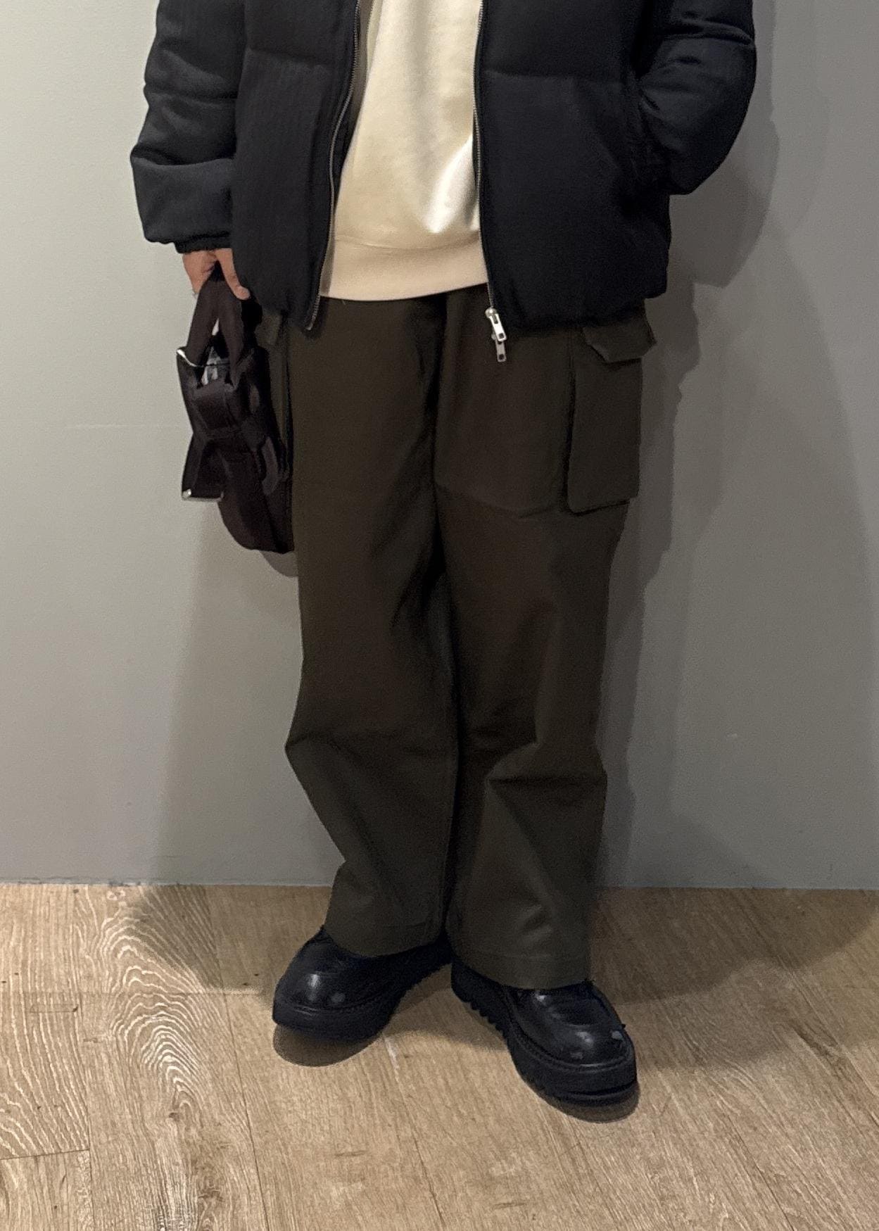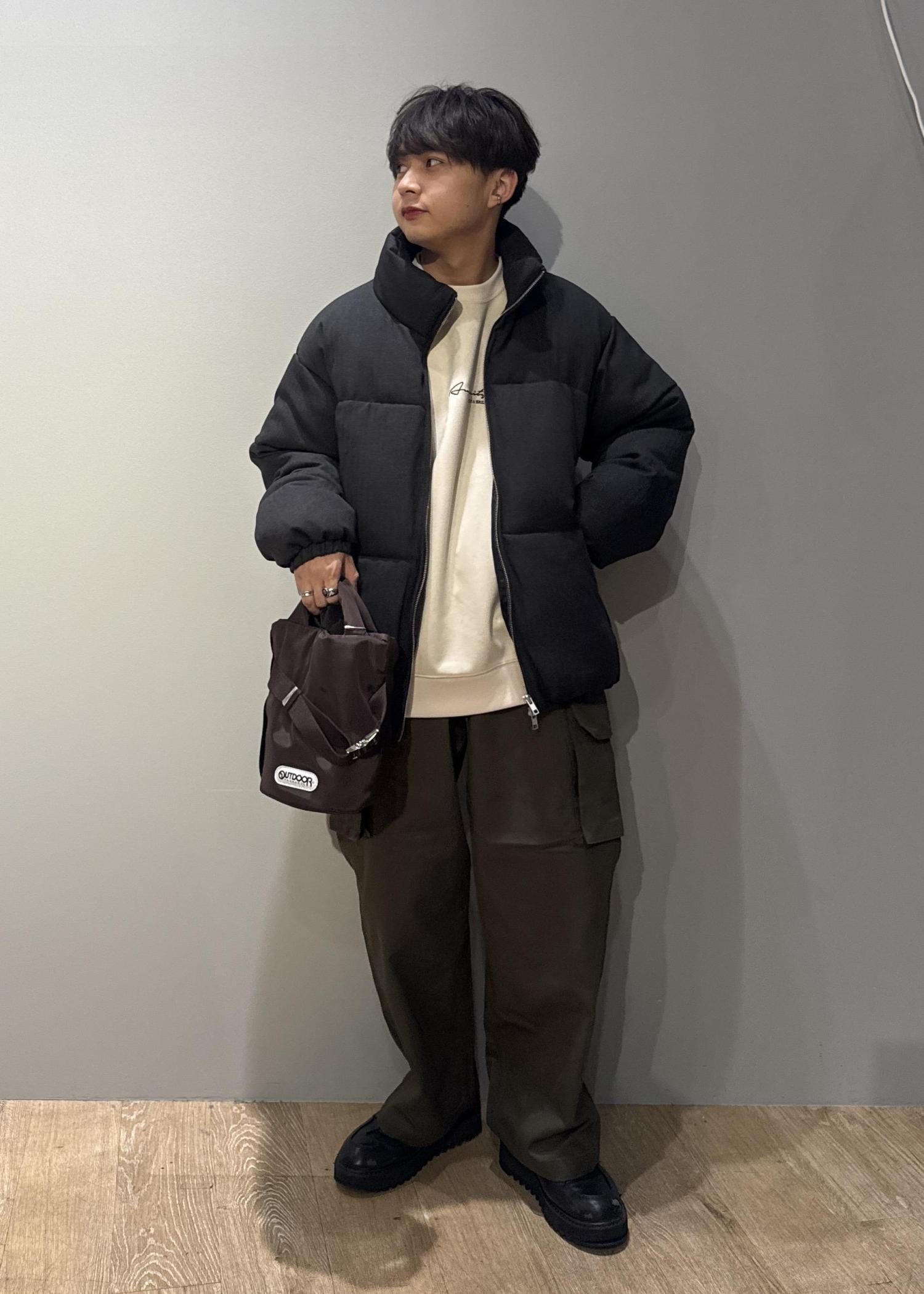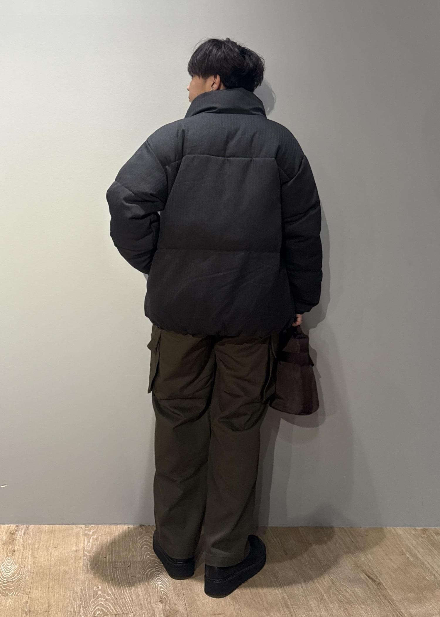 今回はウールライク中綿ブルゾンを使ったコーデです。明日カラーでまとめモードなスタイリングにしつつも季節感も取り入れたコーデにしています。