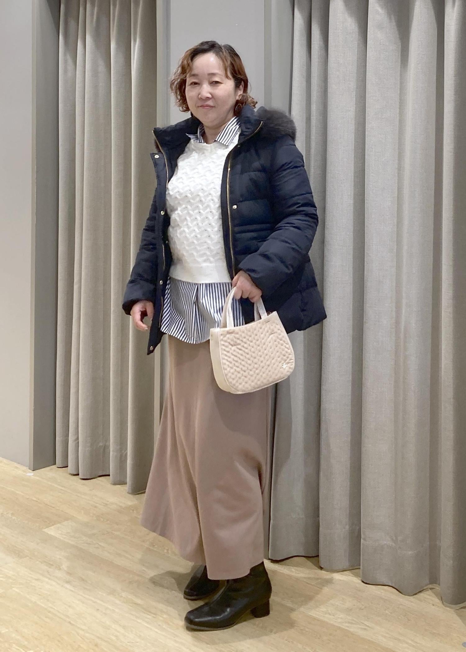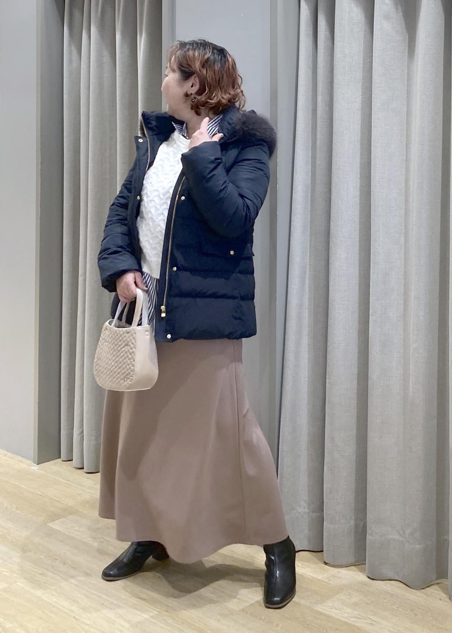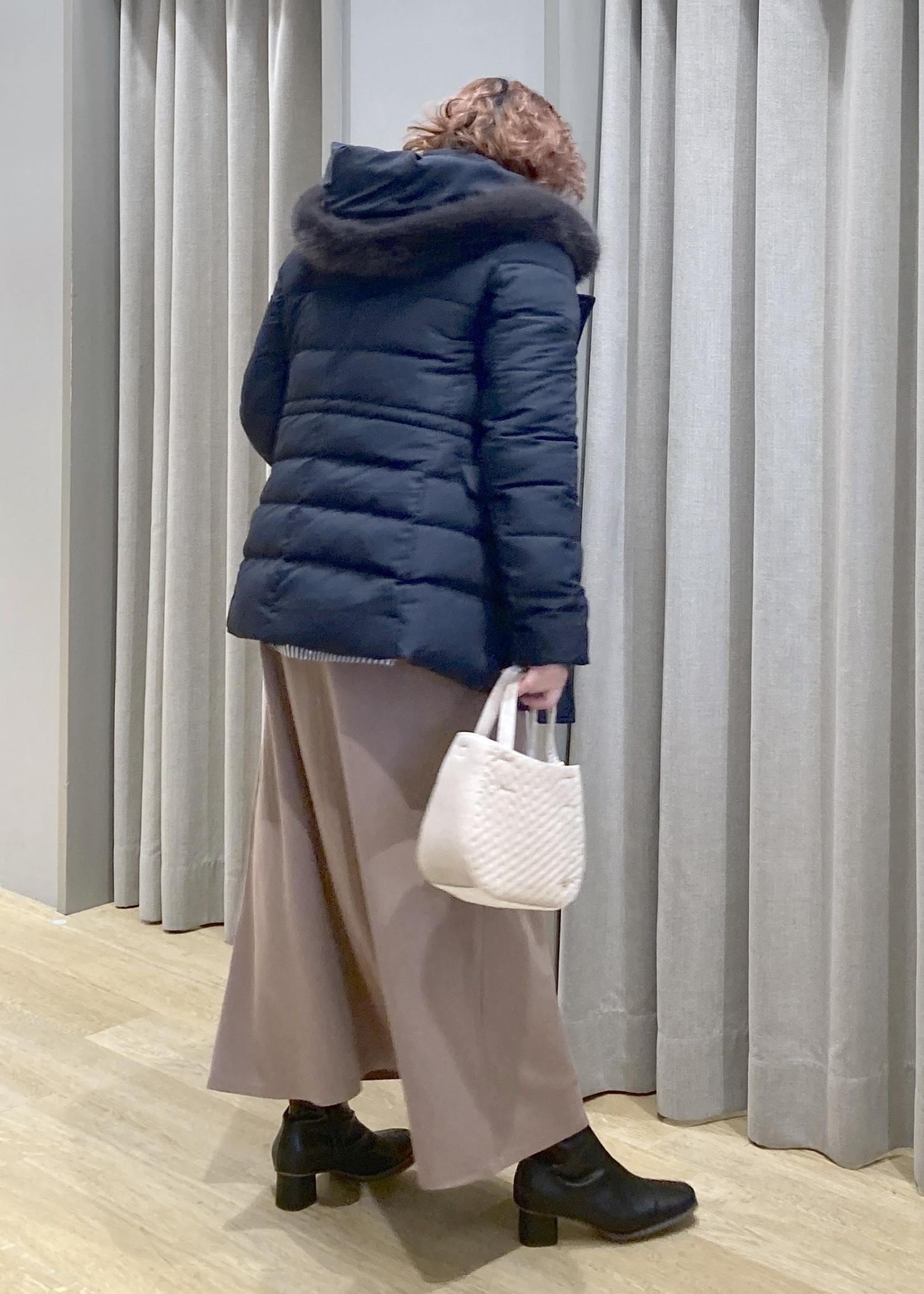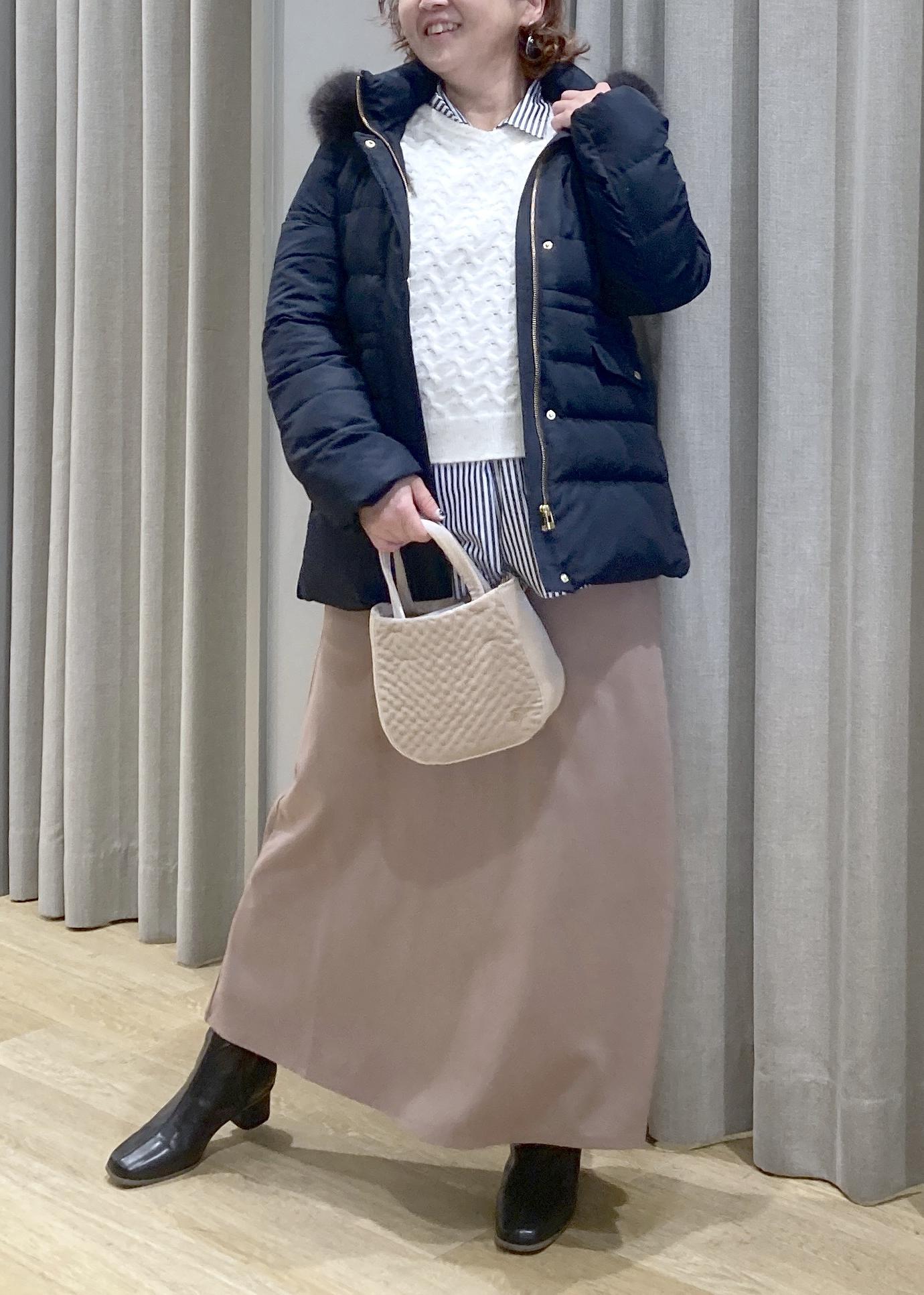 あえて、着ぶくれしない、キレイ目なダウンコートで、上品なカジュアルお出かけスタイルにしてみました。