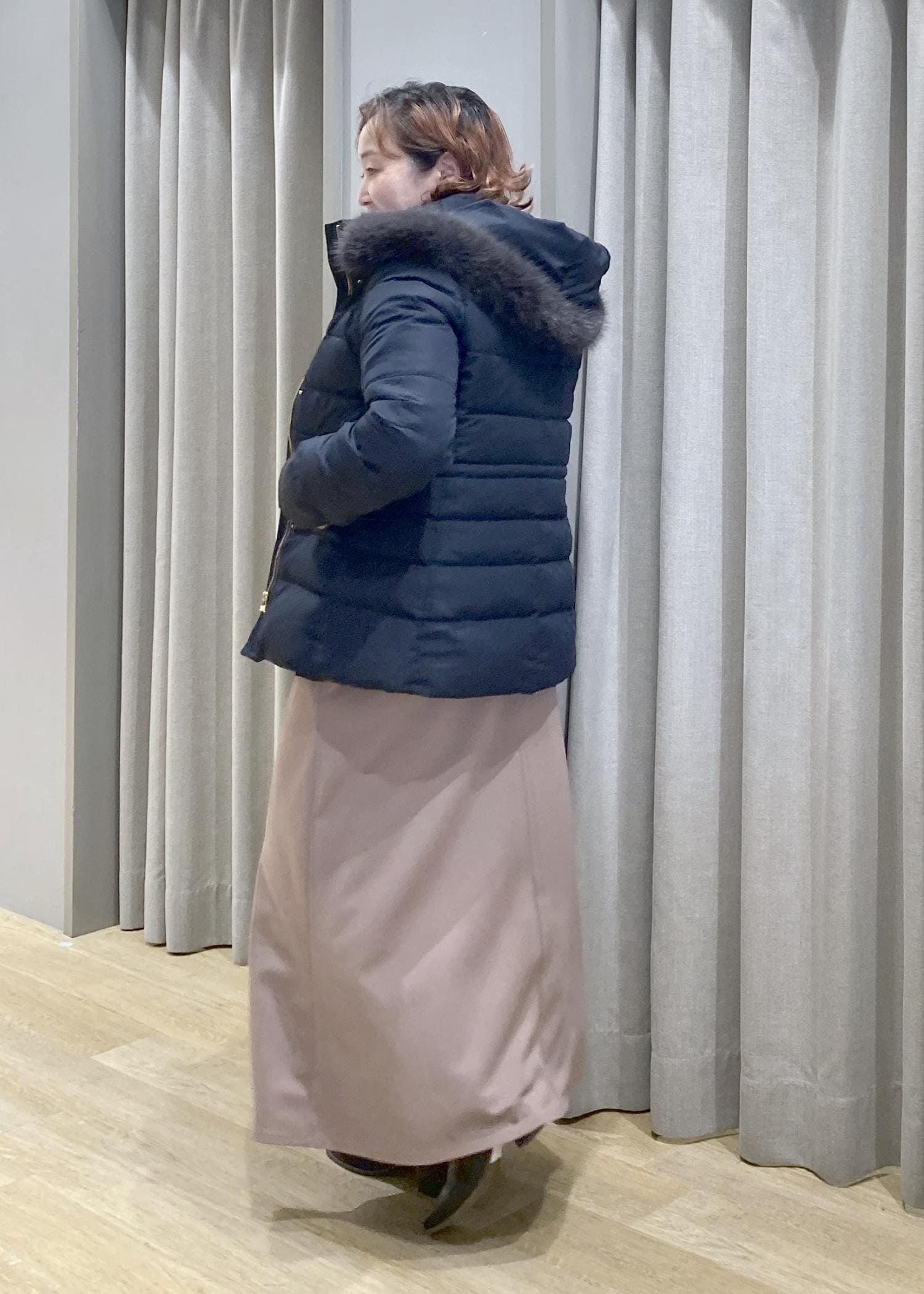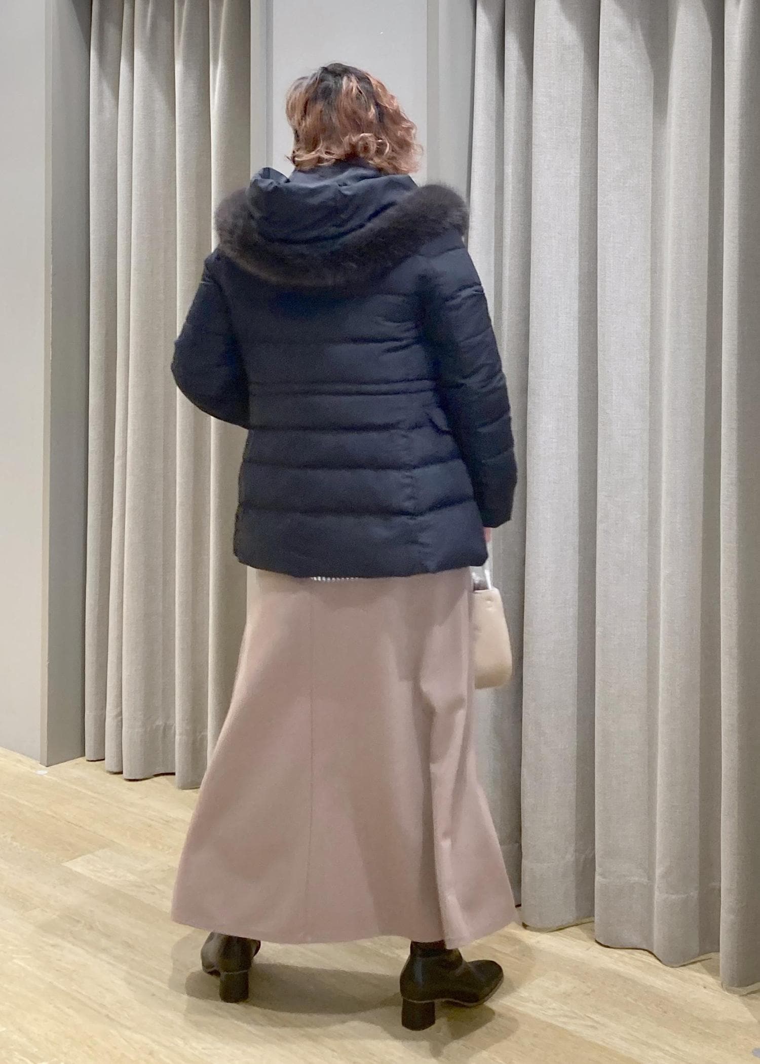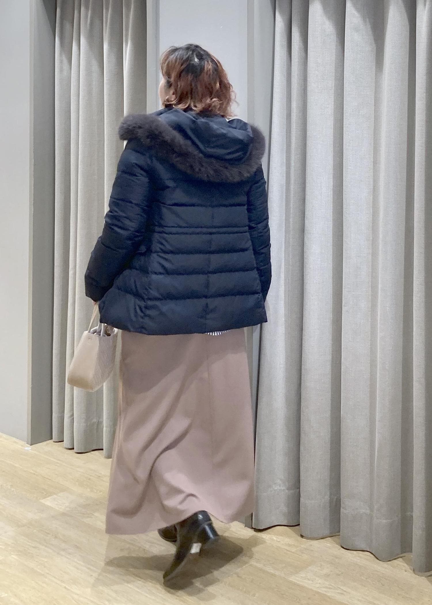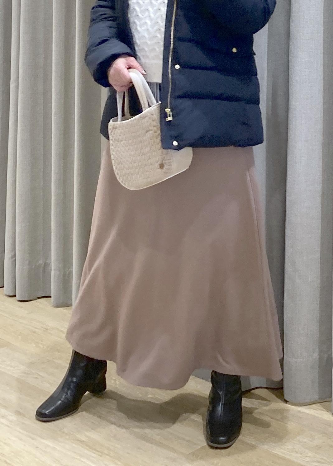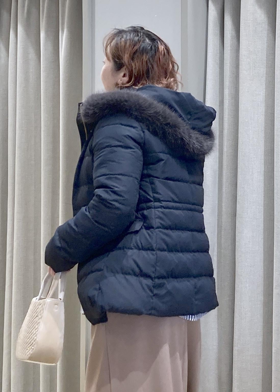 あえて、着ぶくれしない、キレイ目なダウンコートで、上品なカジュアルお出かけスタイルにしてみました。