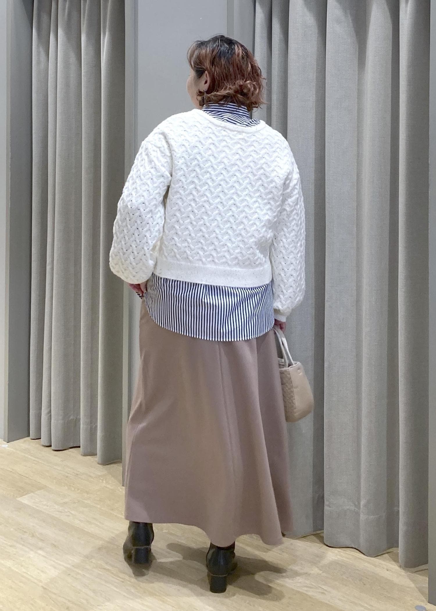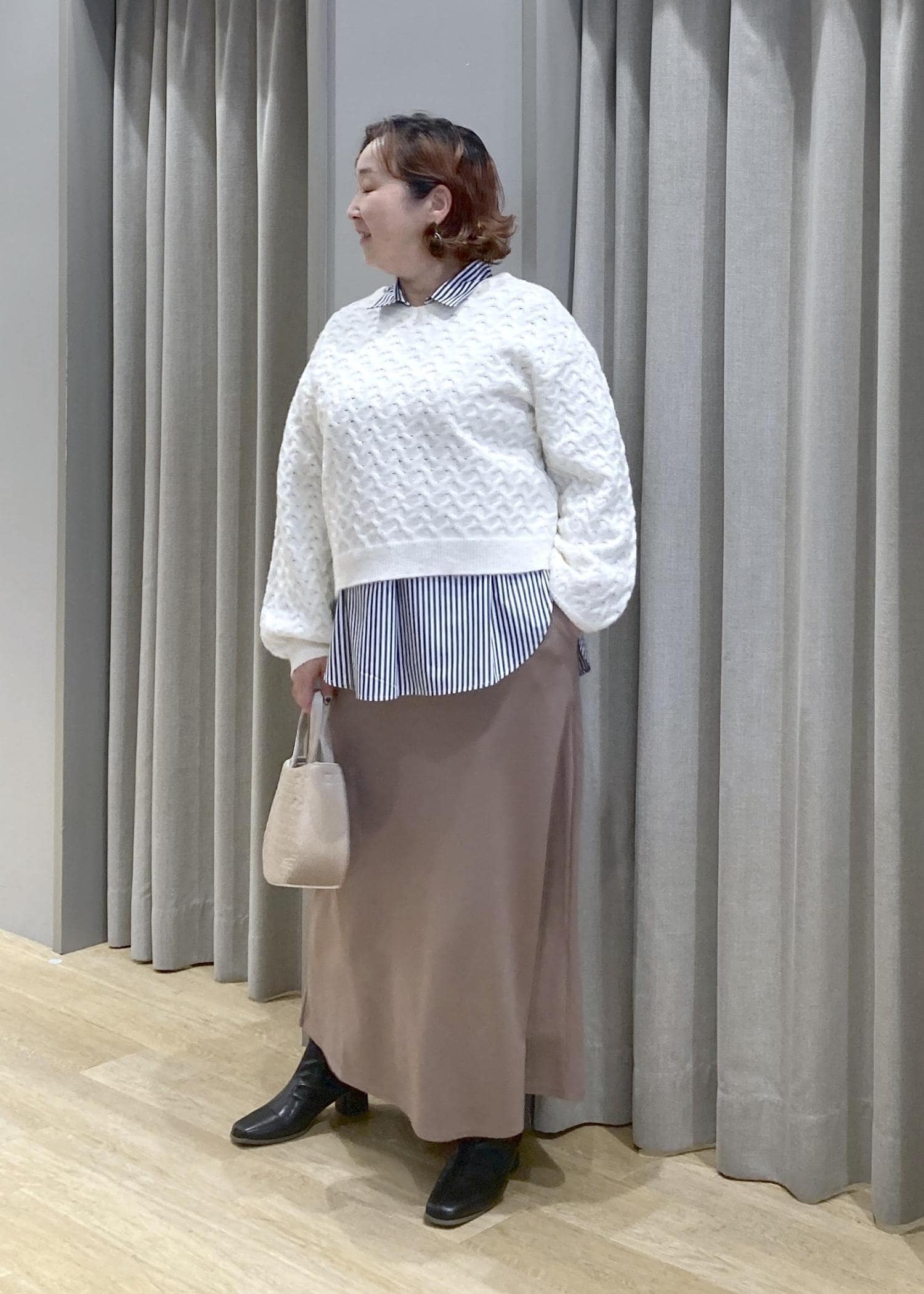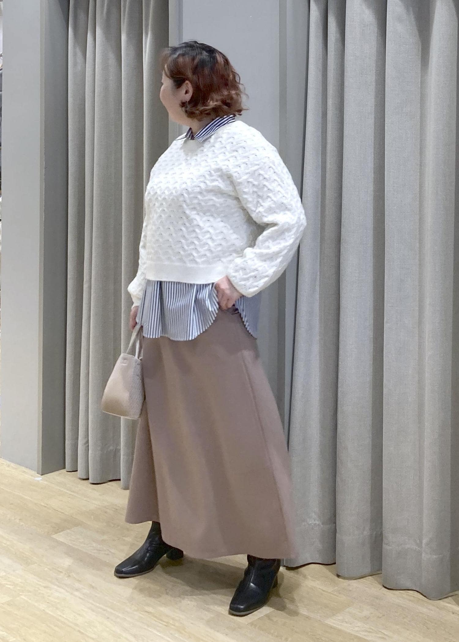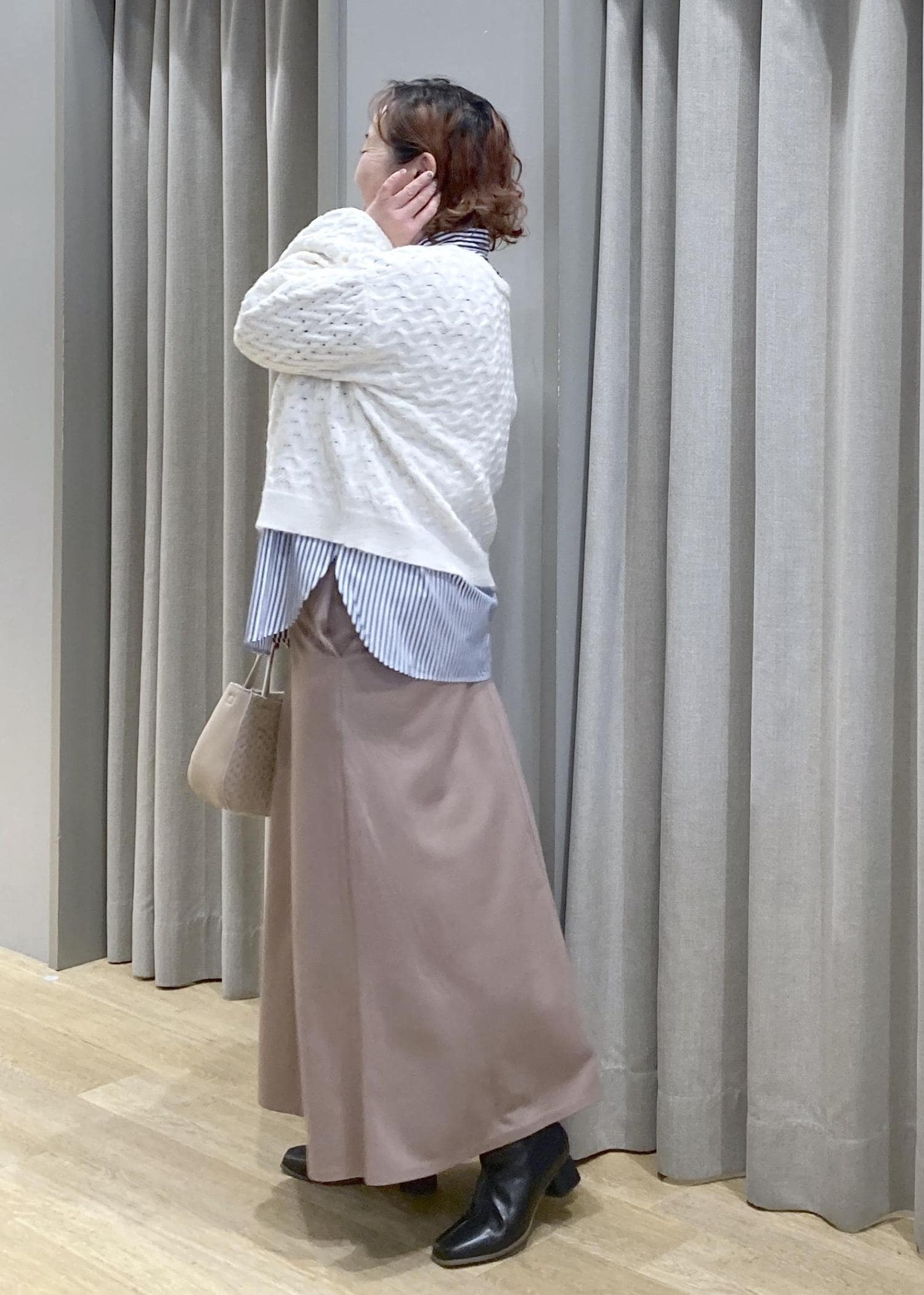 ニット✕スカートだと、ベーシックすぎる時には、アクセントにブラウスをインしてレイヤードスタイリングにしてみました。