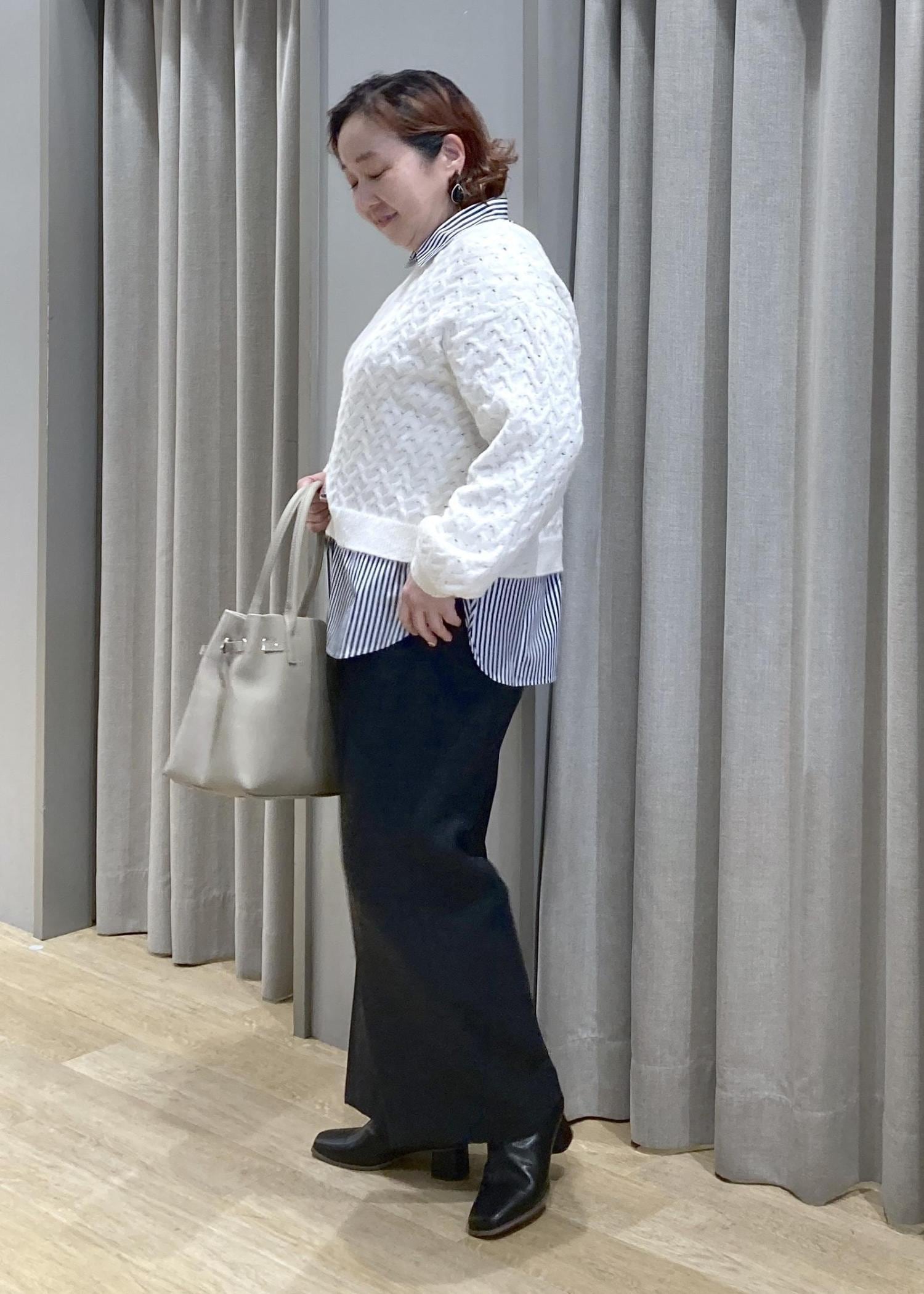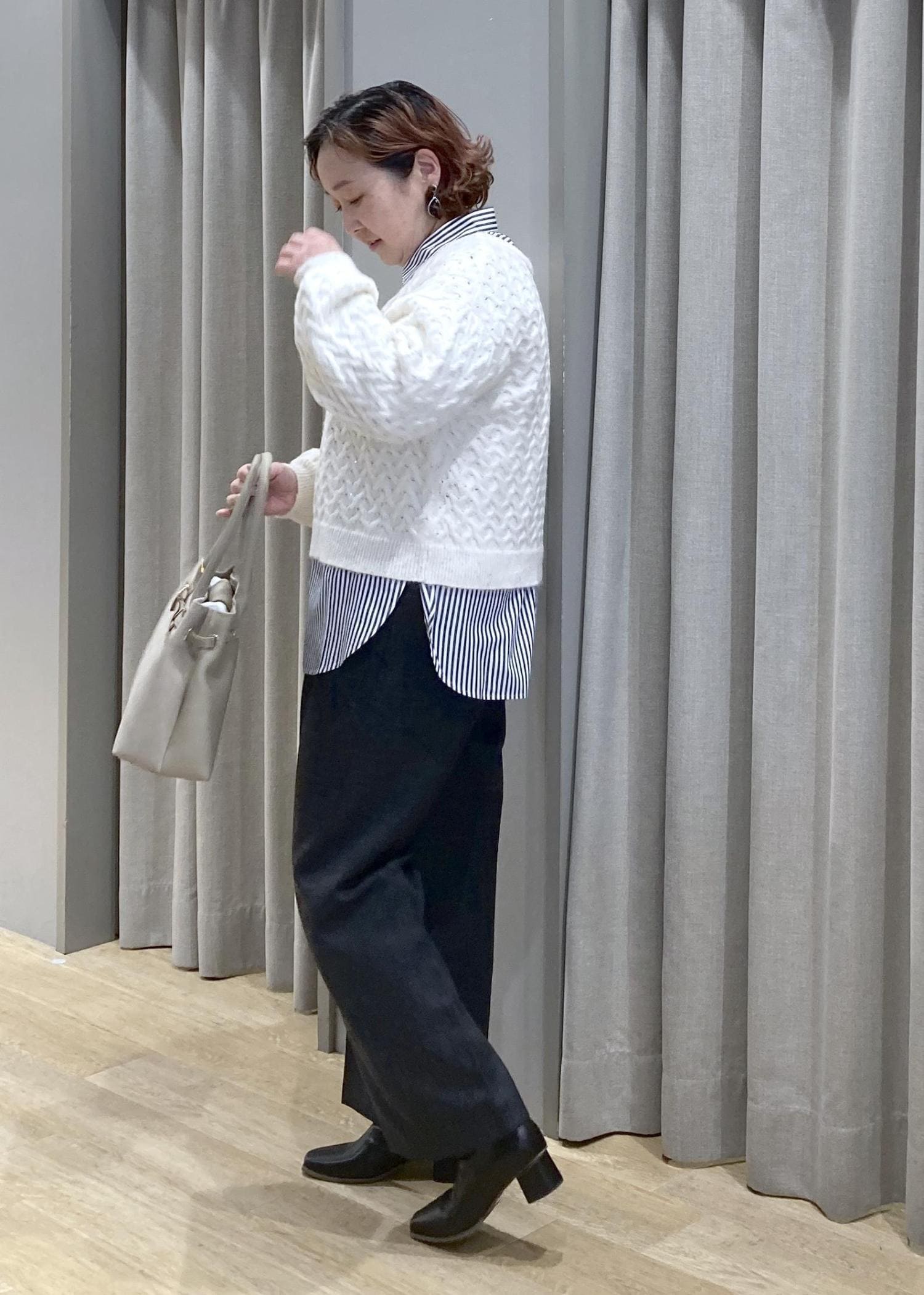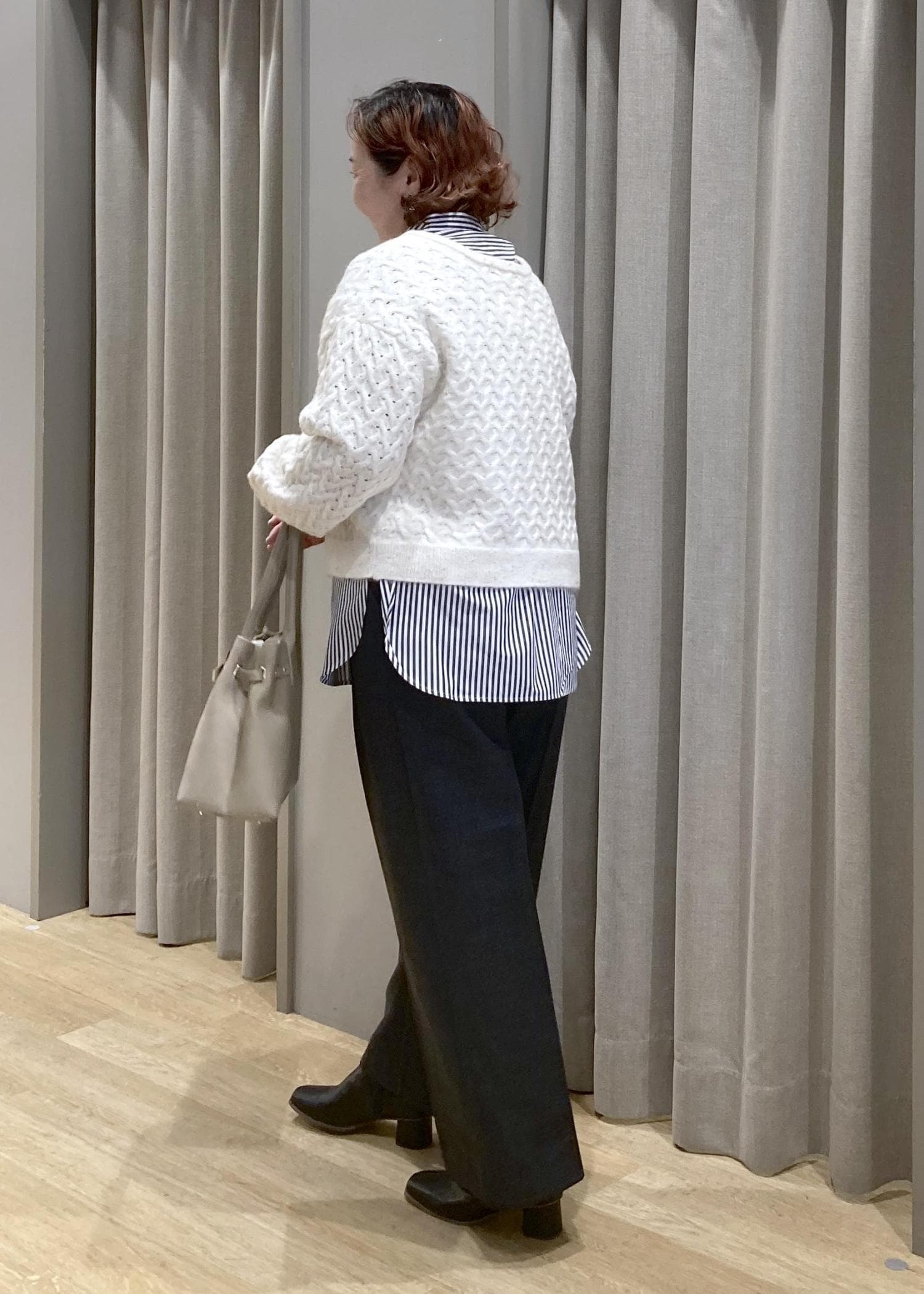 お腹周りが気になるときは、レイヤードスタイリングでカバーしながらも、キチンと感のあるオフィスカジュアルコーデになります。