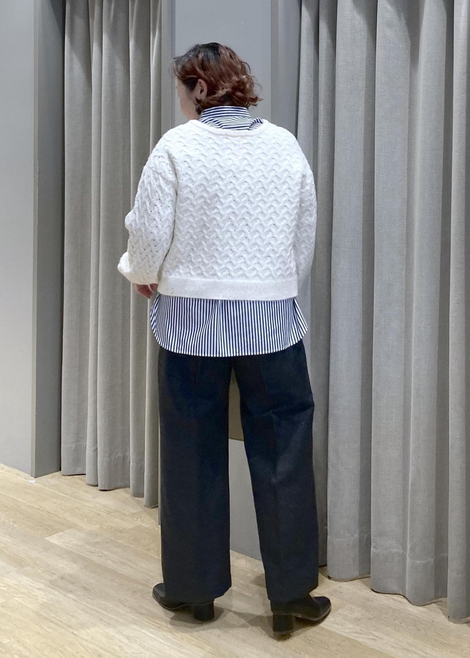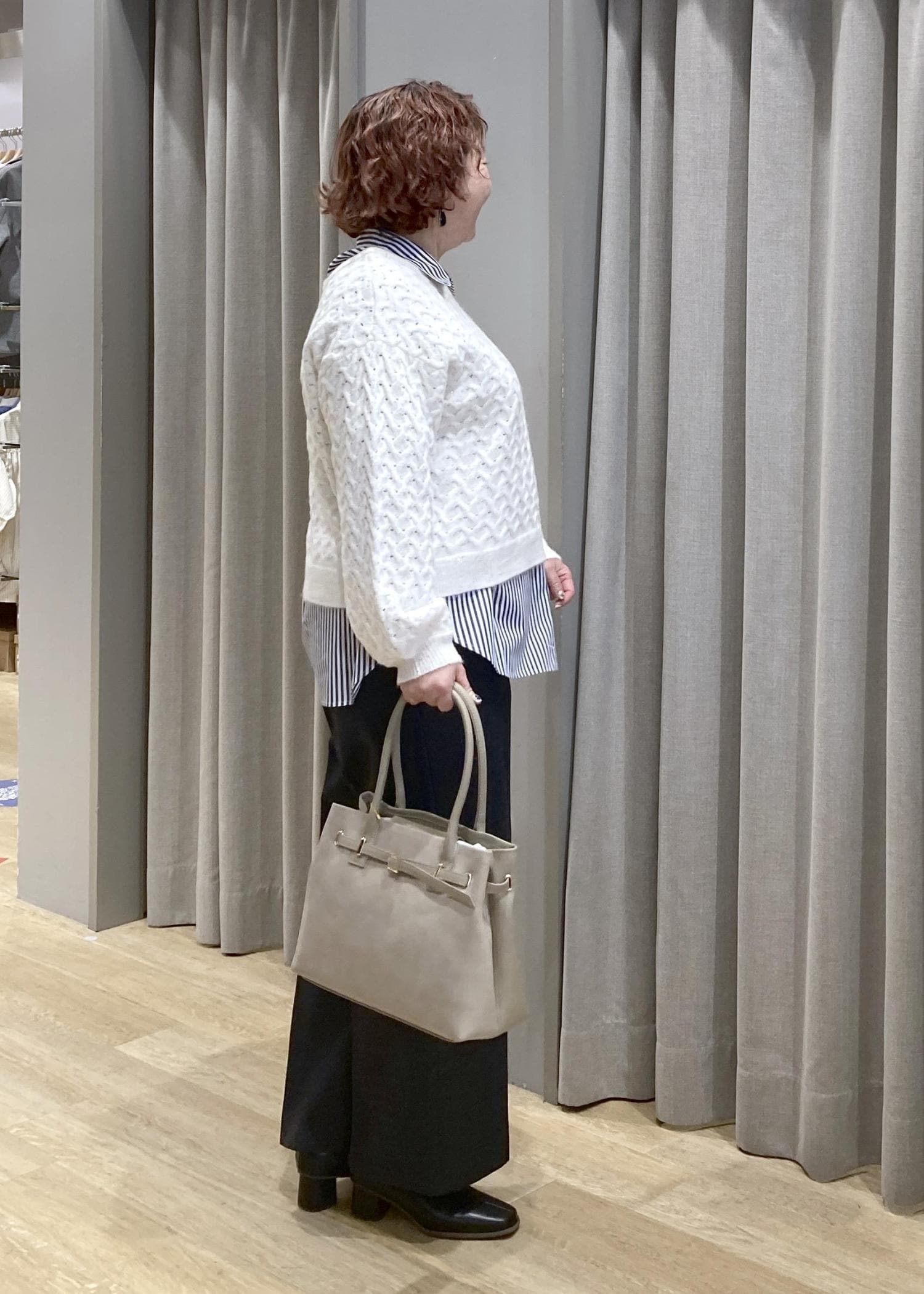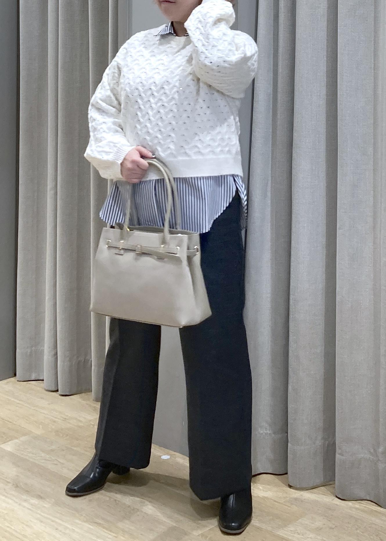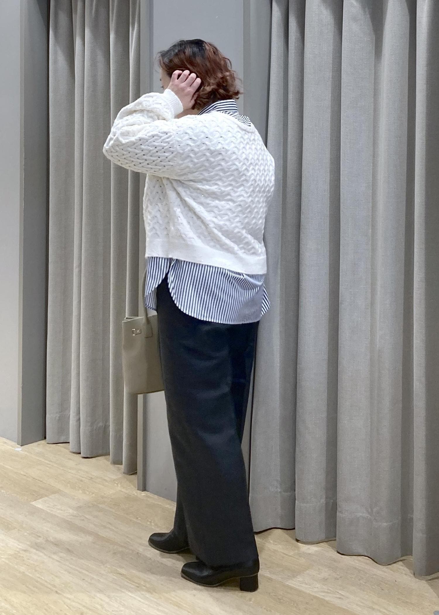 お腹周りが気になるときは、レイヤードスタイリングでカバーしながらも、キチンと感のあるオフィスカジュアルコーデになります。