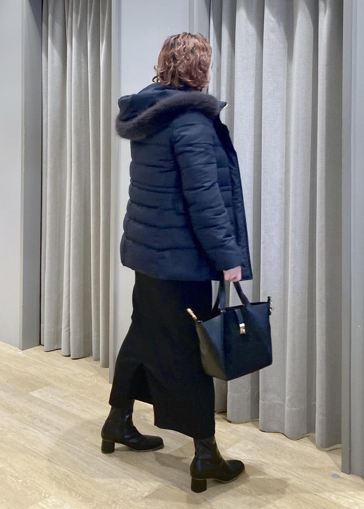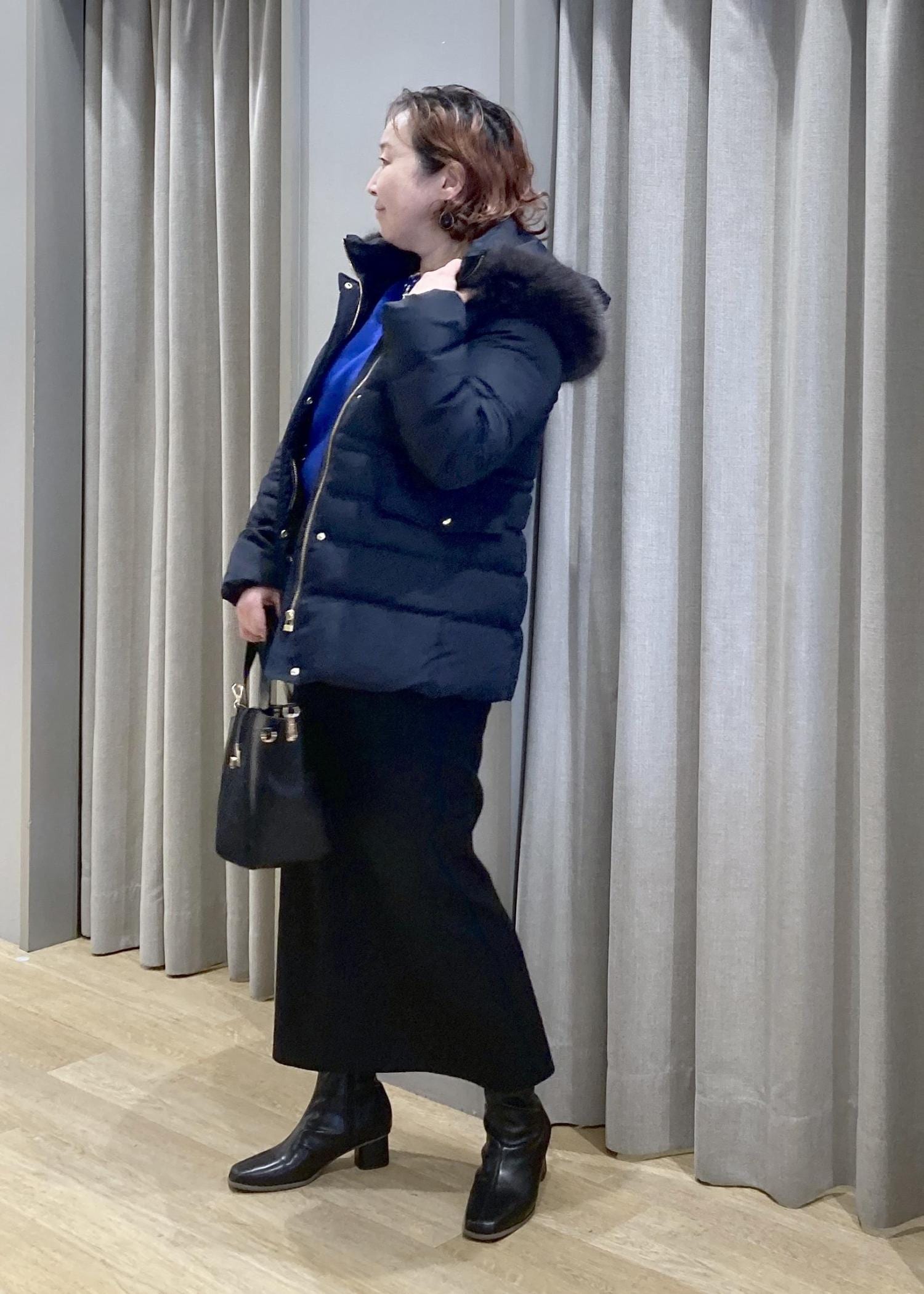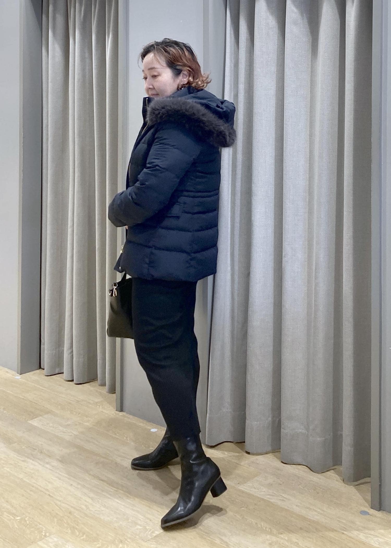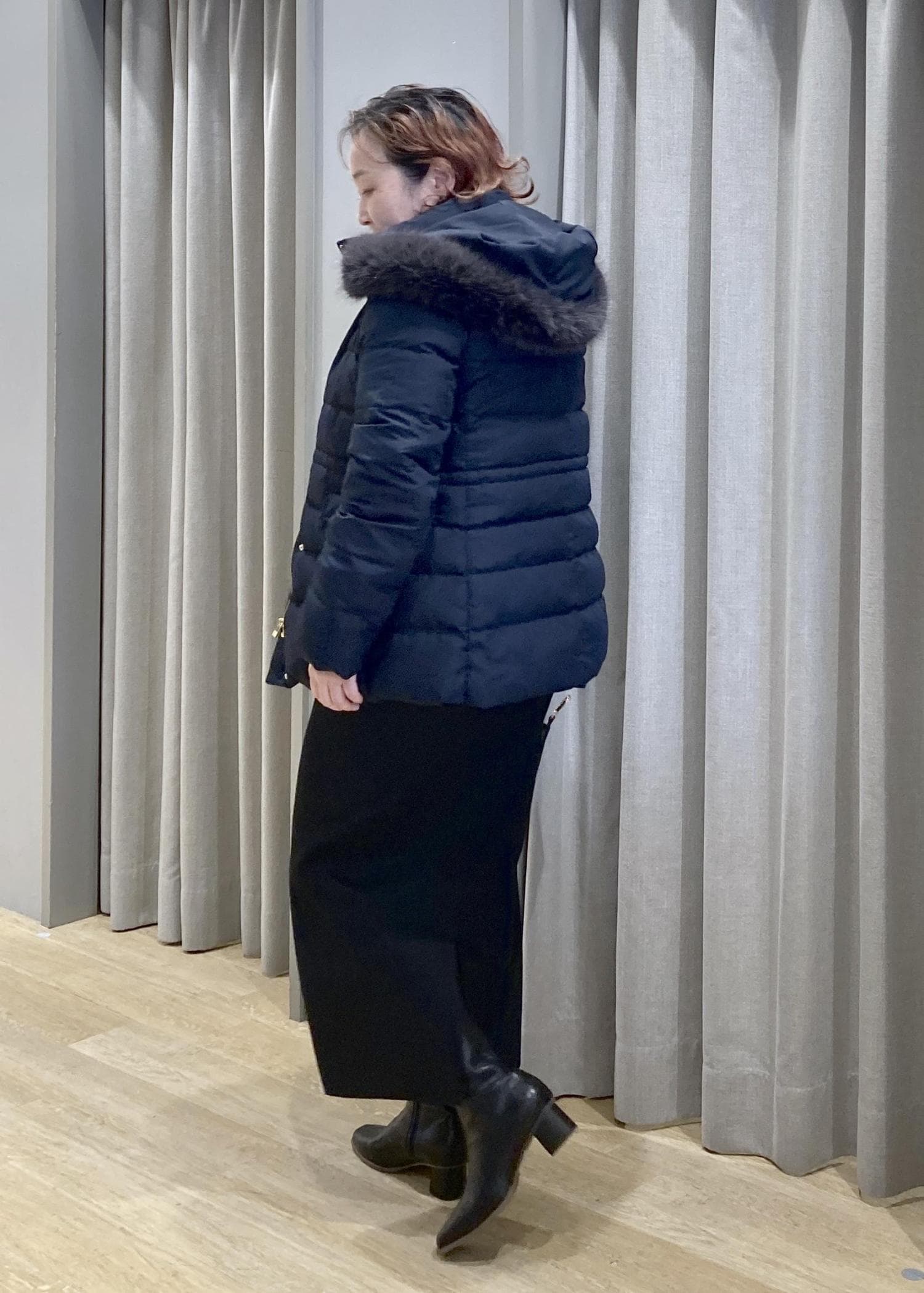 ダウンは着ぶくれなしの細見えシルエットで、体のラインをさりげなくカバー。