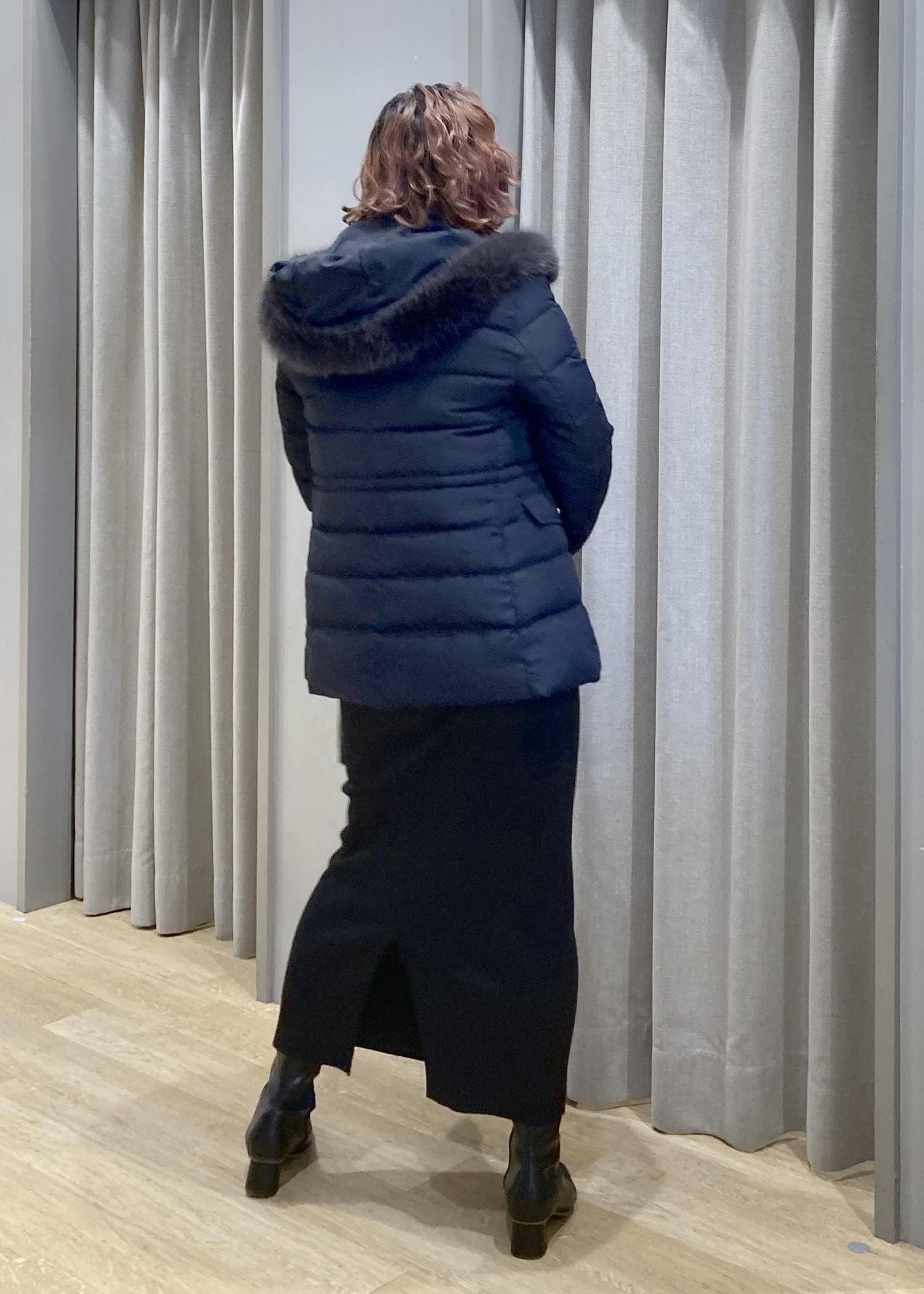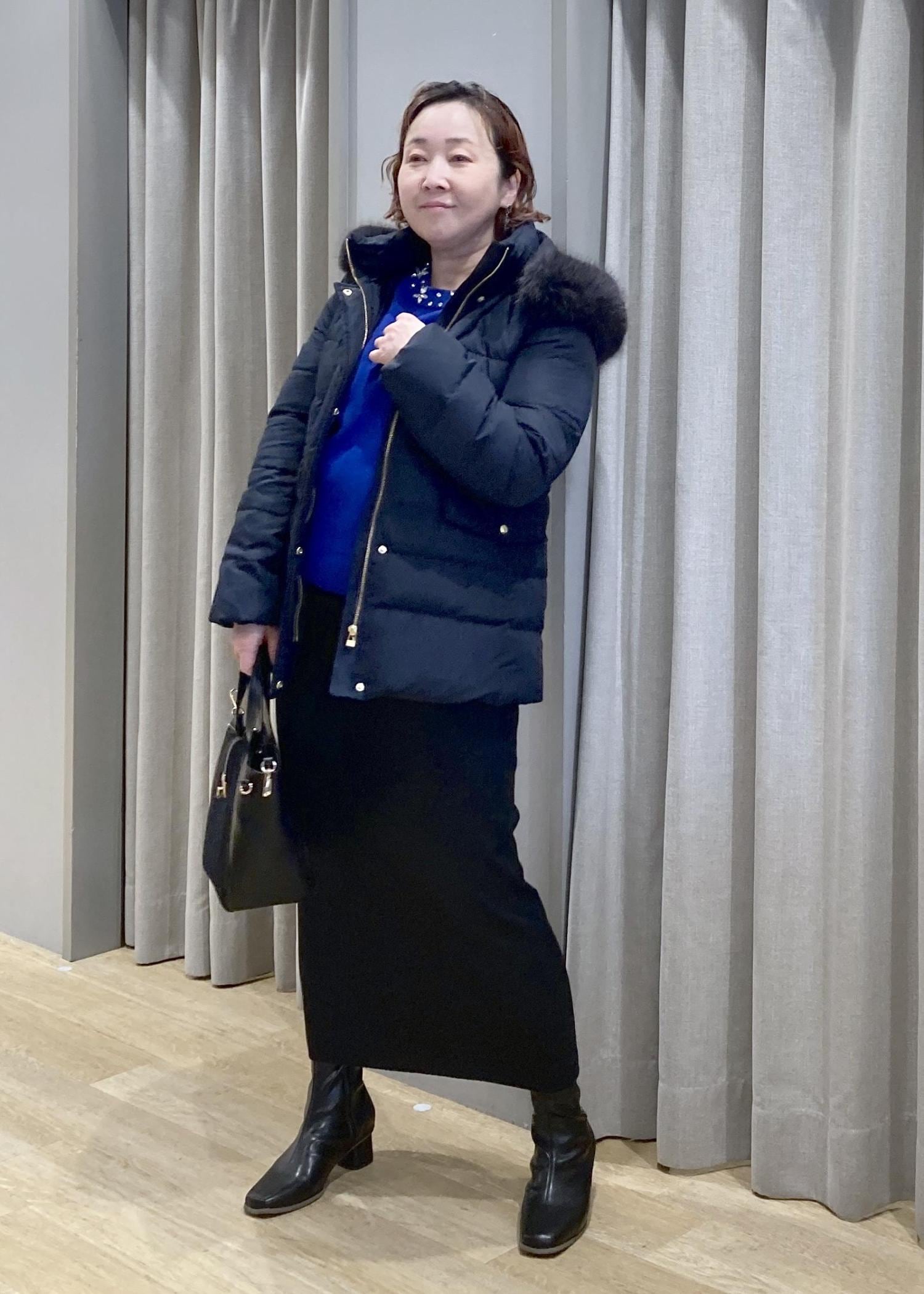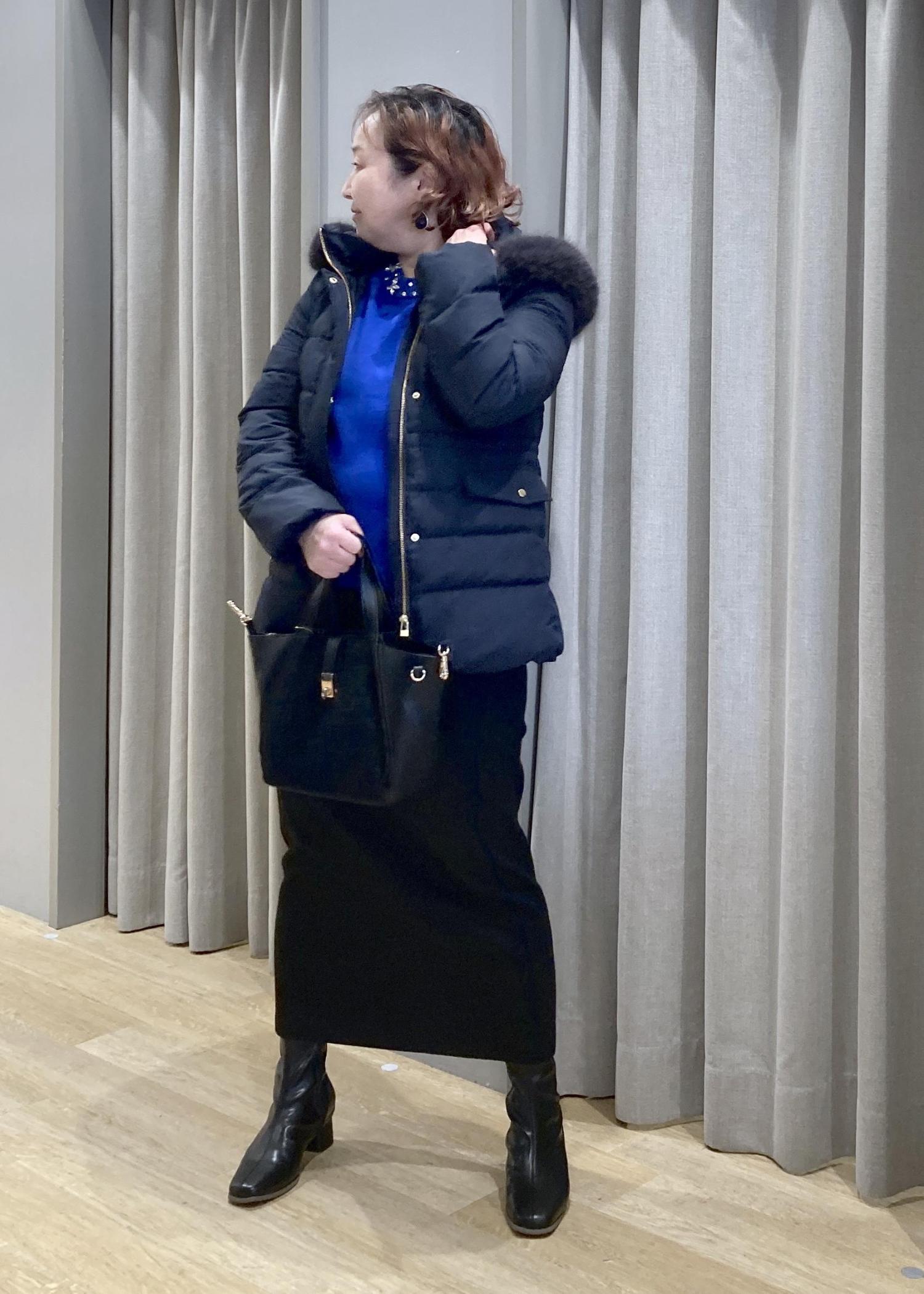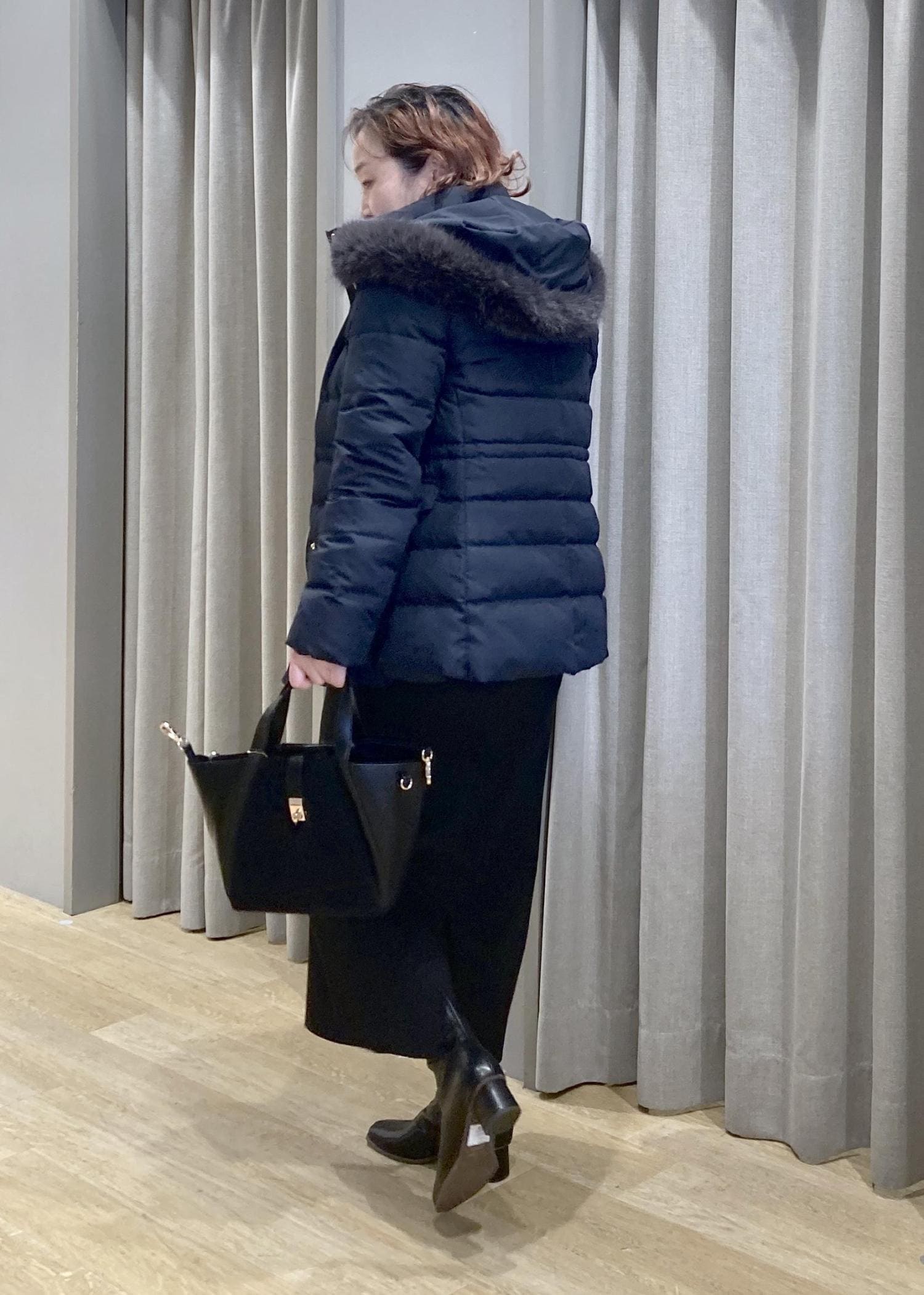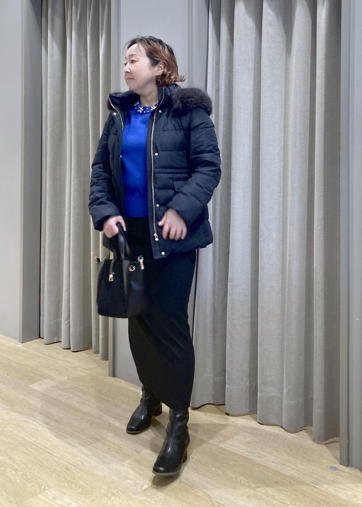 ダウンは着ぶくれなしの細見えシルエットで、体のラインをさりげなくカバー。