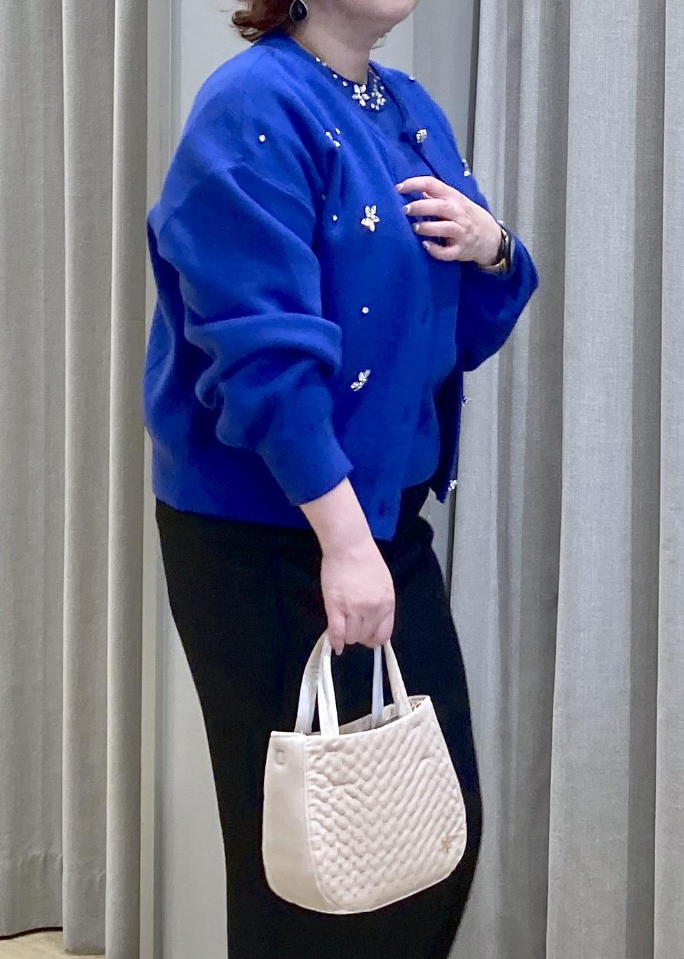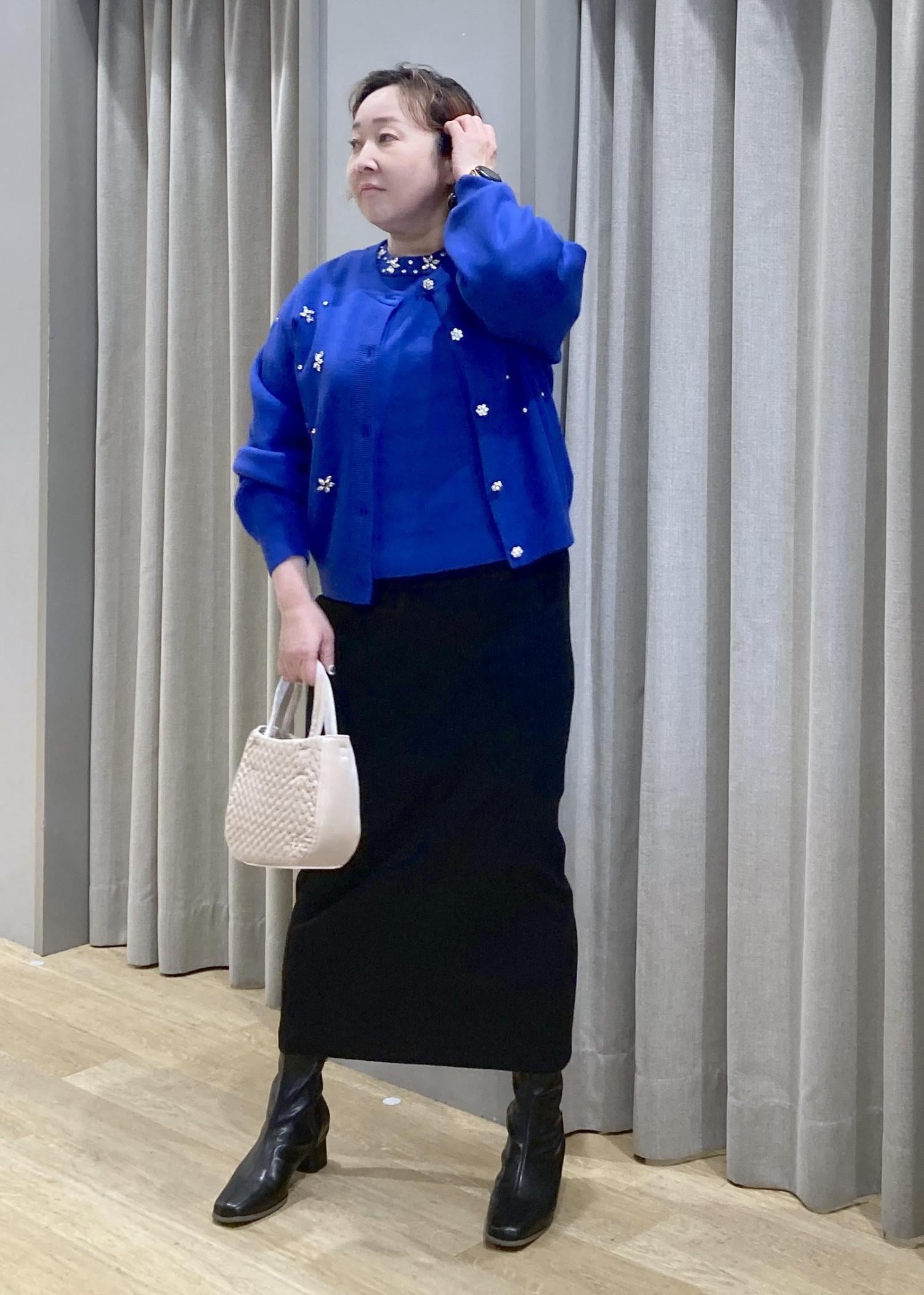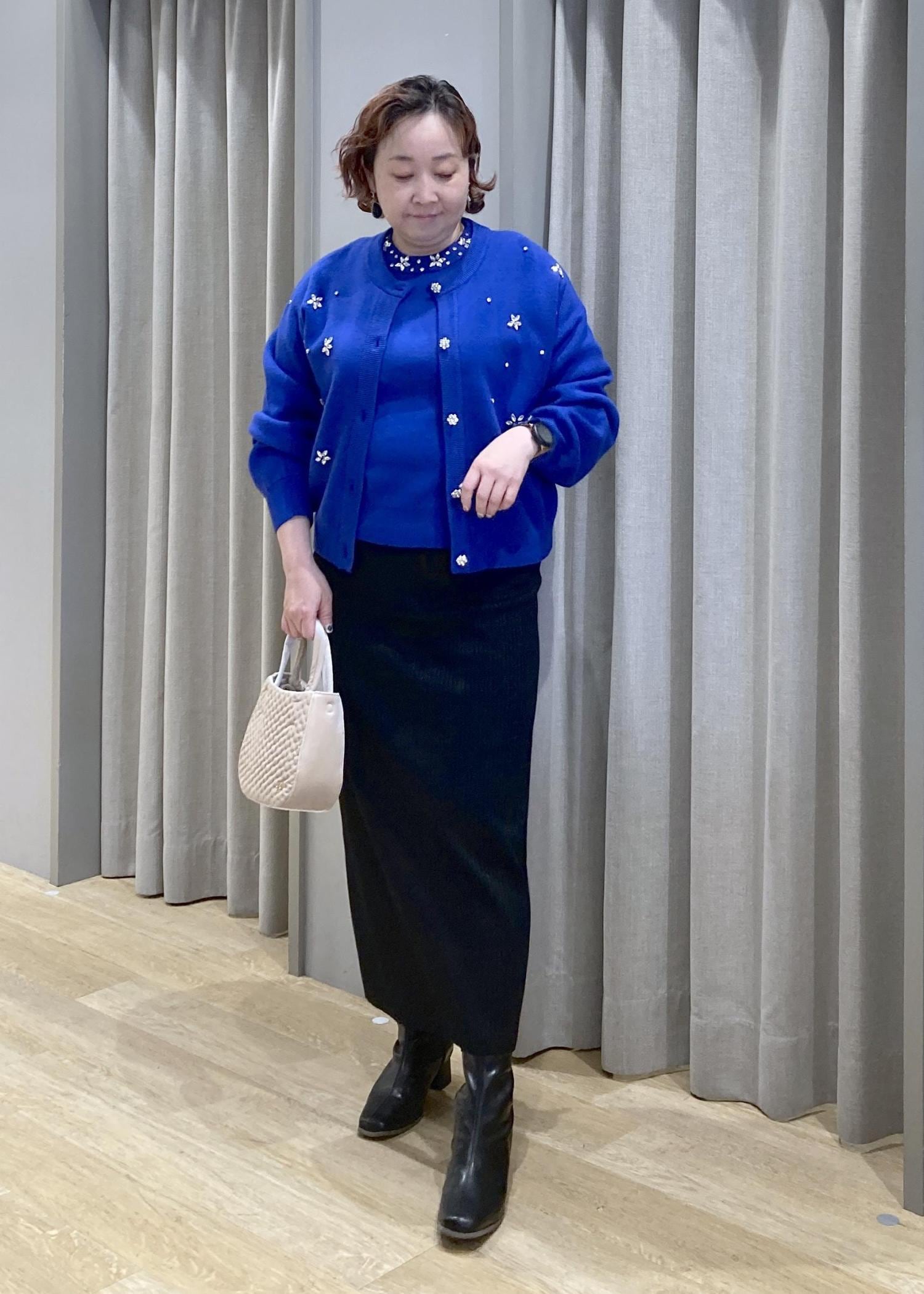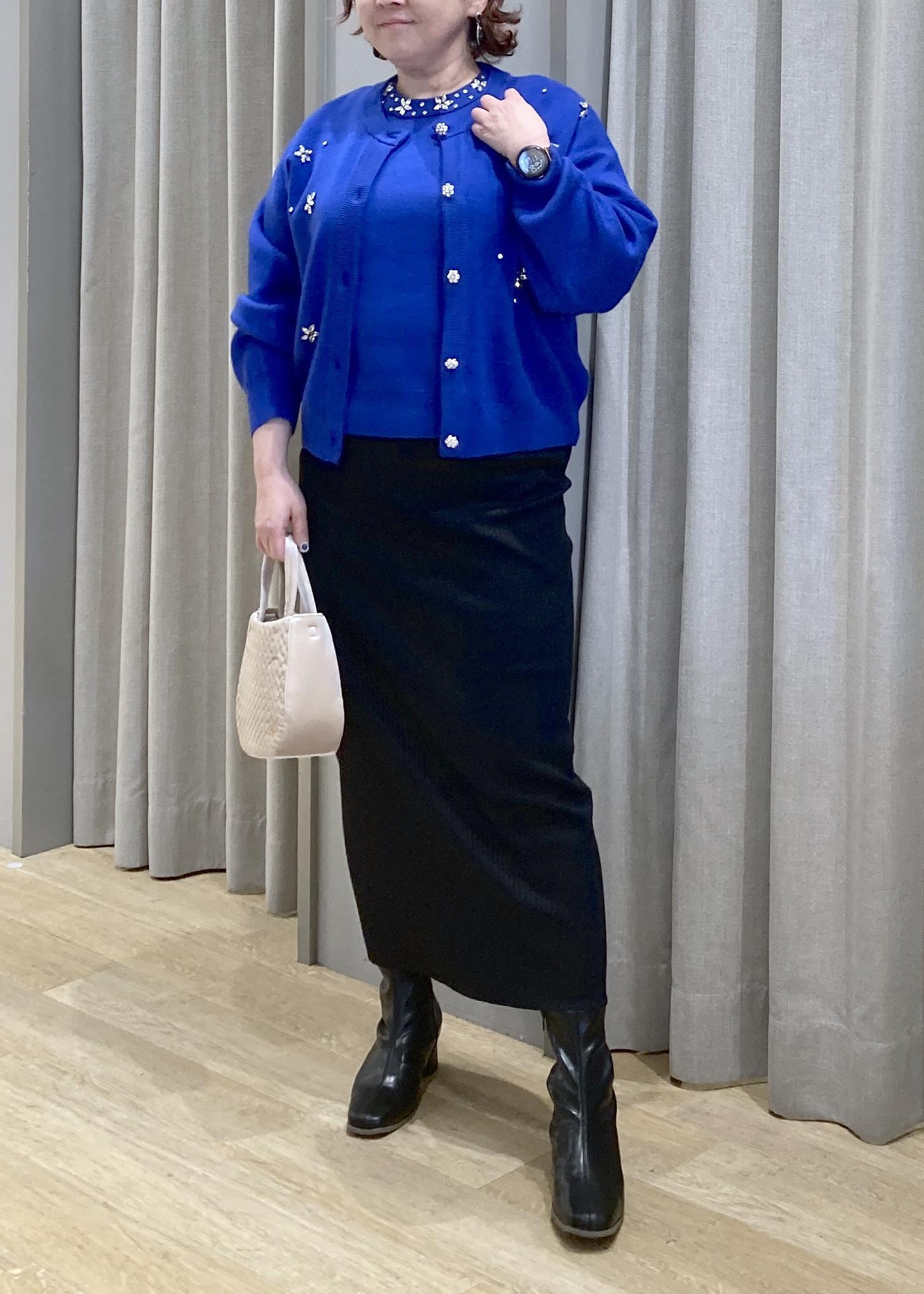 華やかなブルーのカーデが主役。