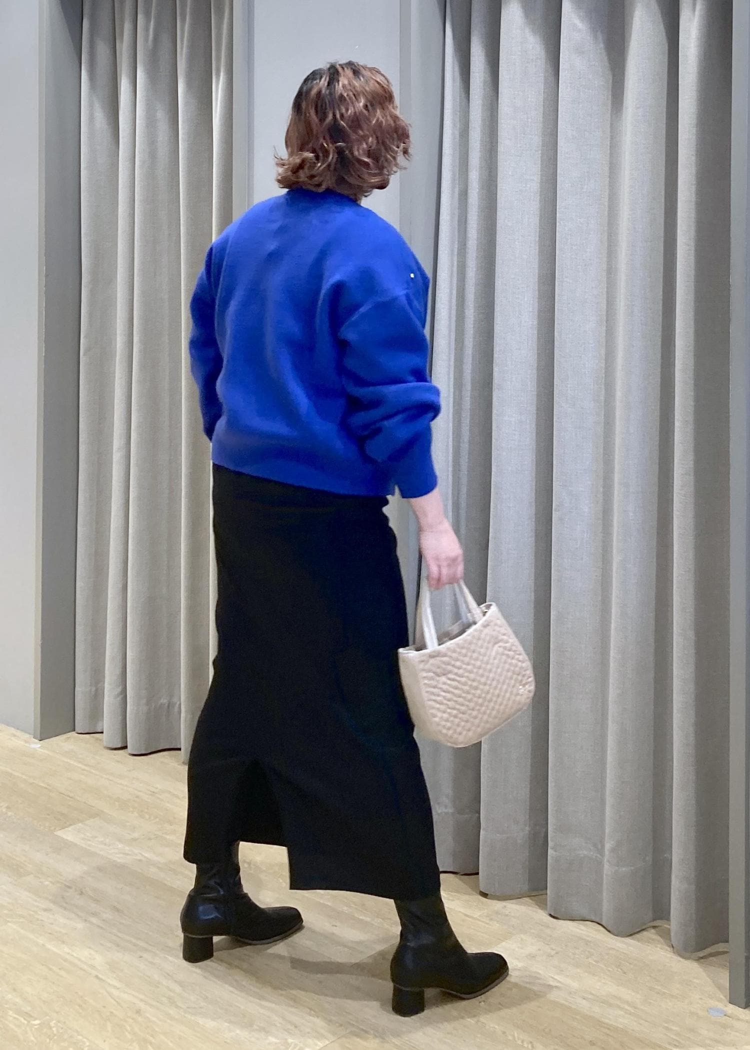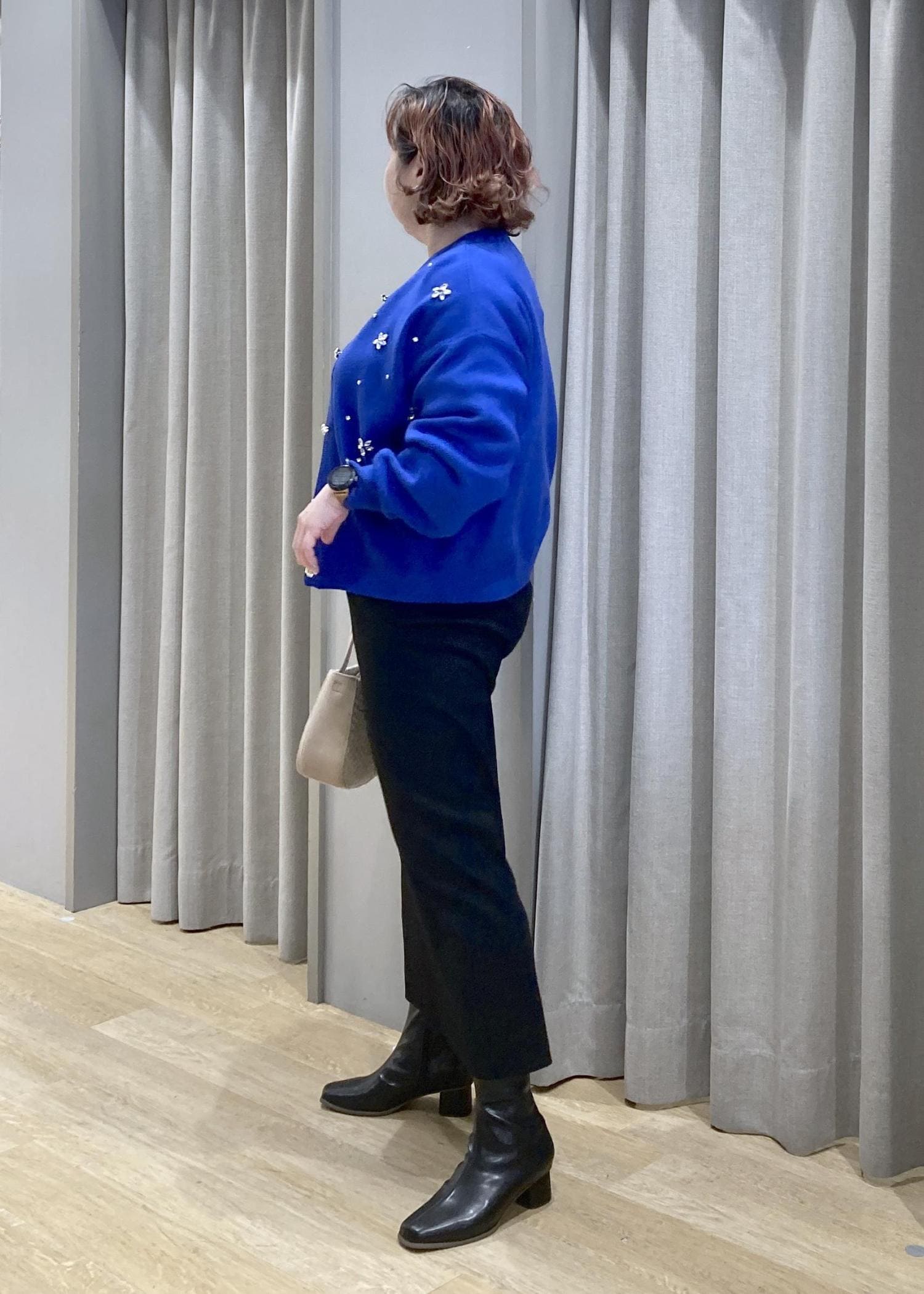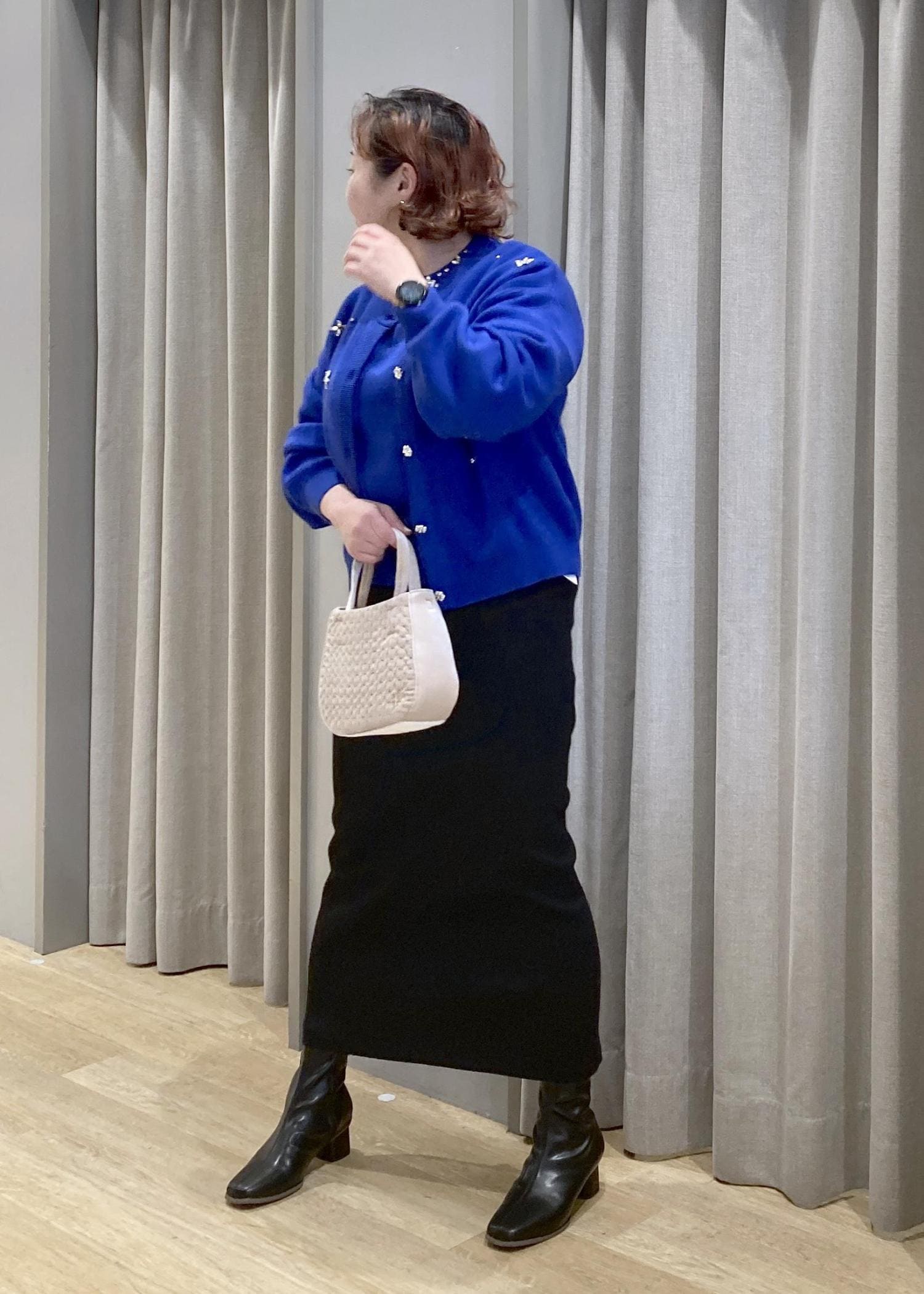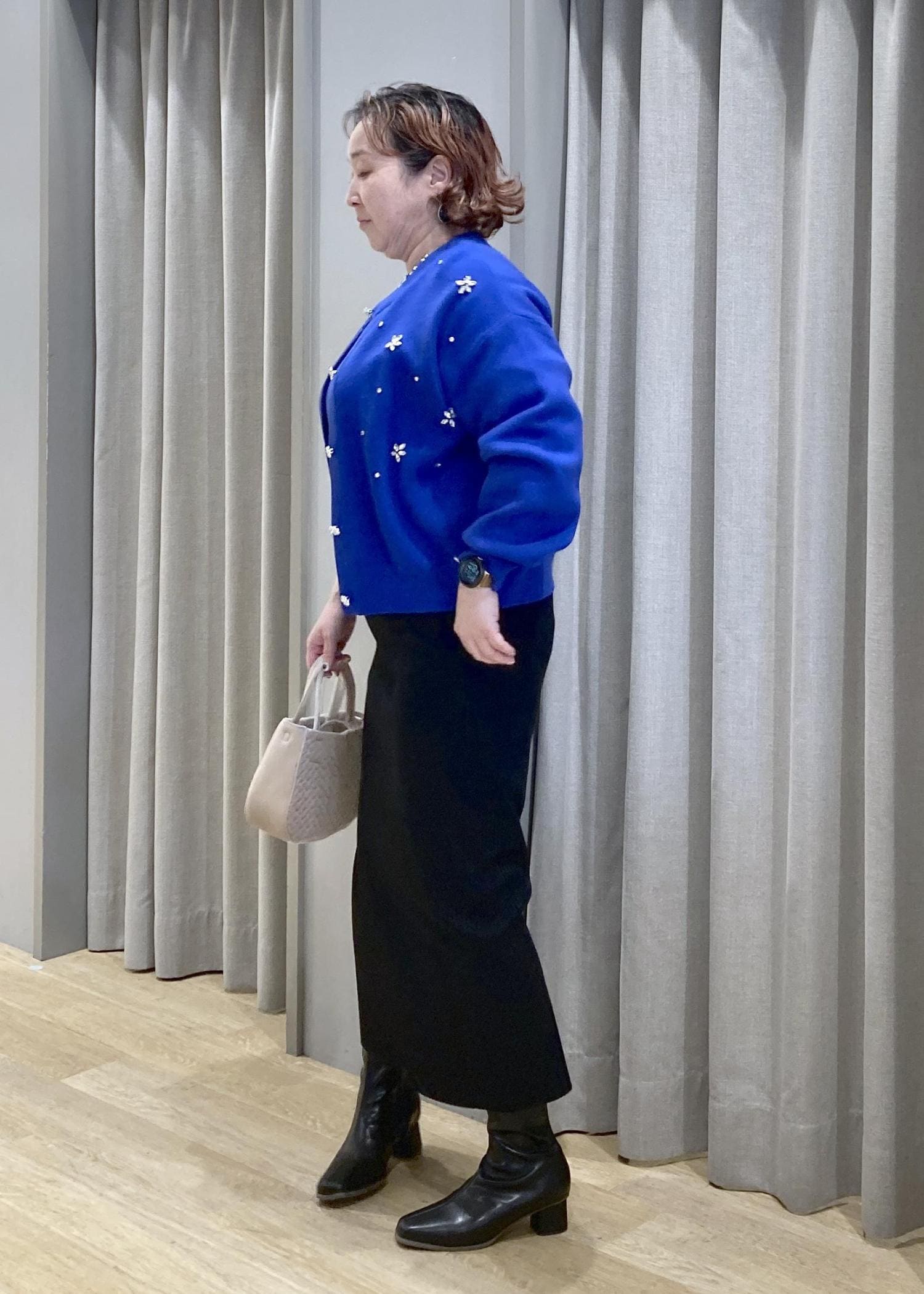 華やかなブルーのカーデが主役。