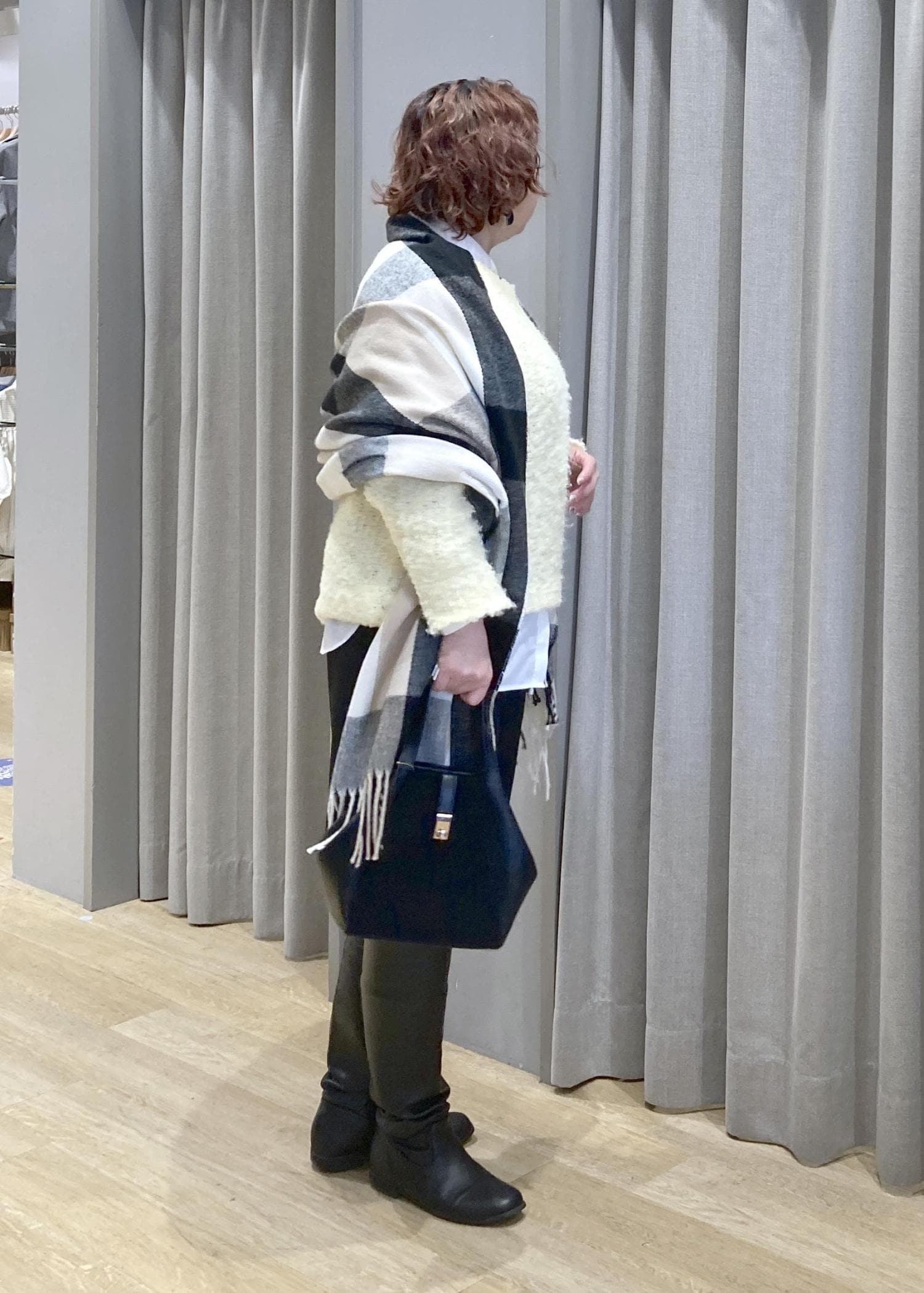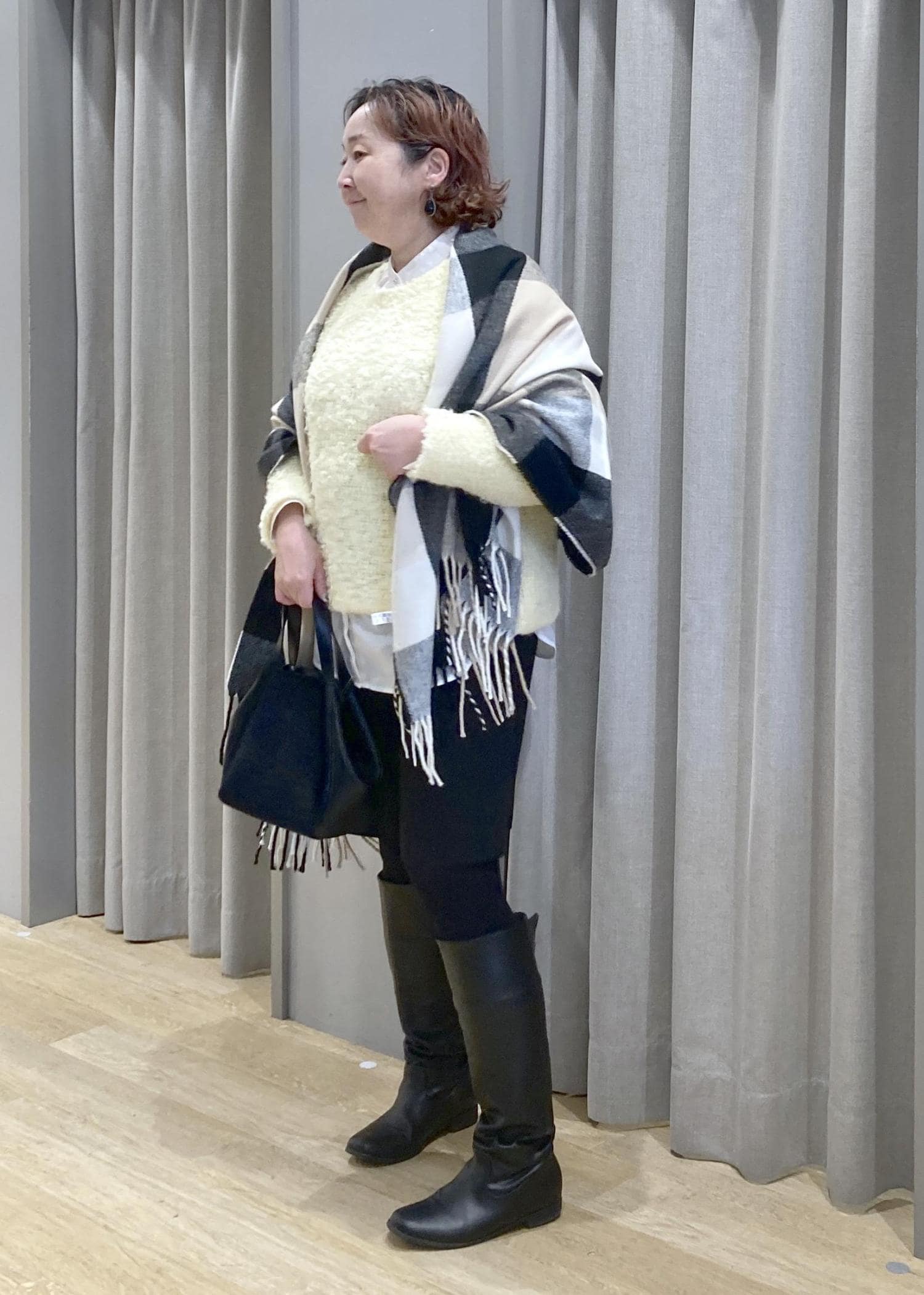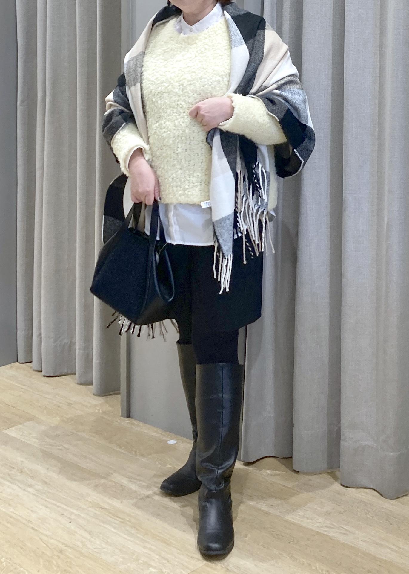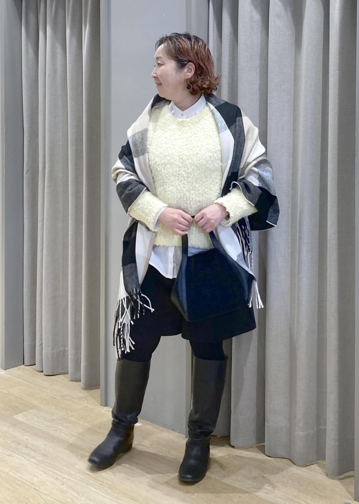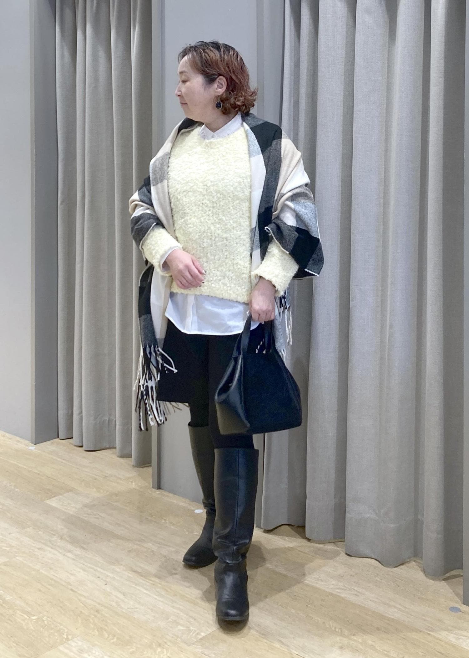 ふんわりニットにストールを重ねて、気になるラインはさりげなくカバーしてみました。