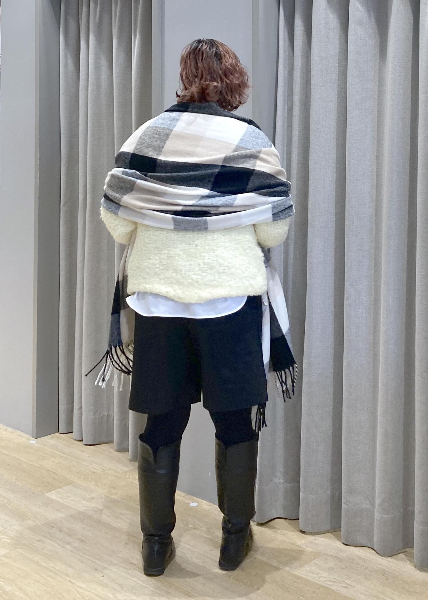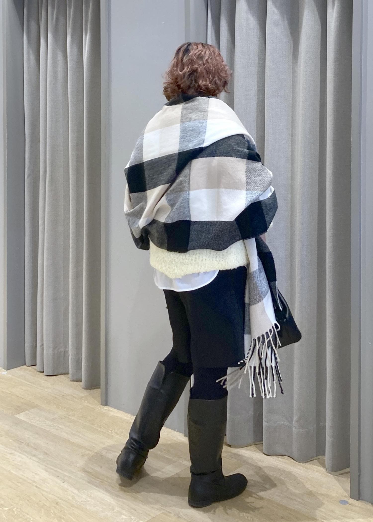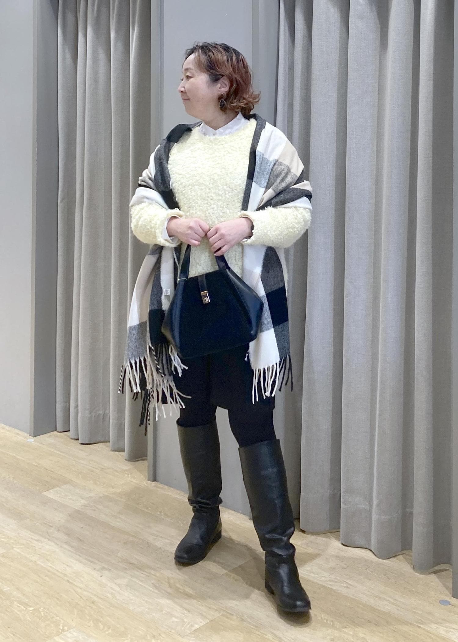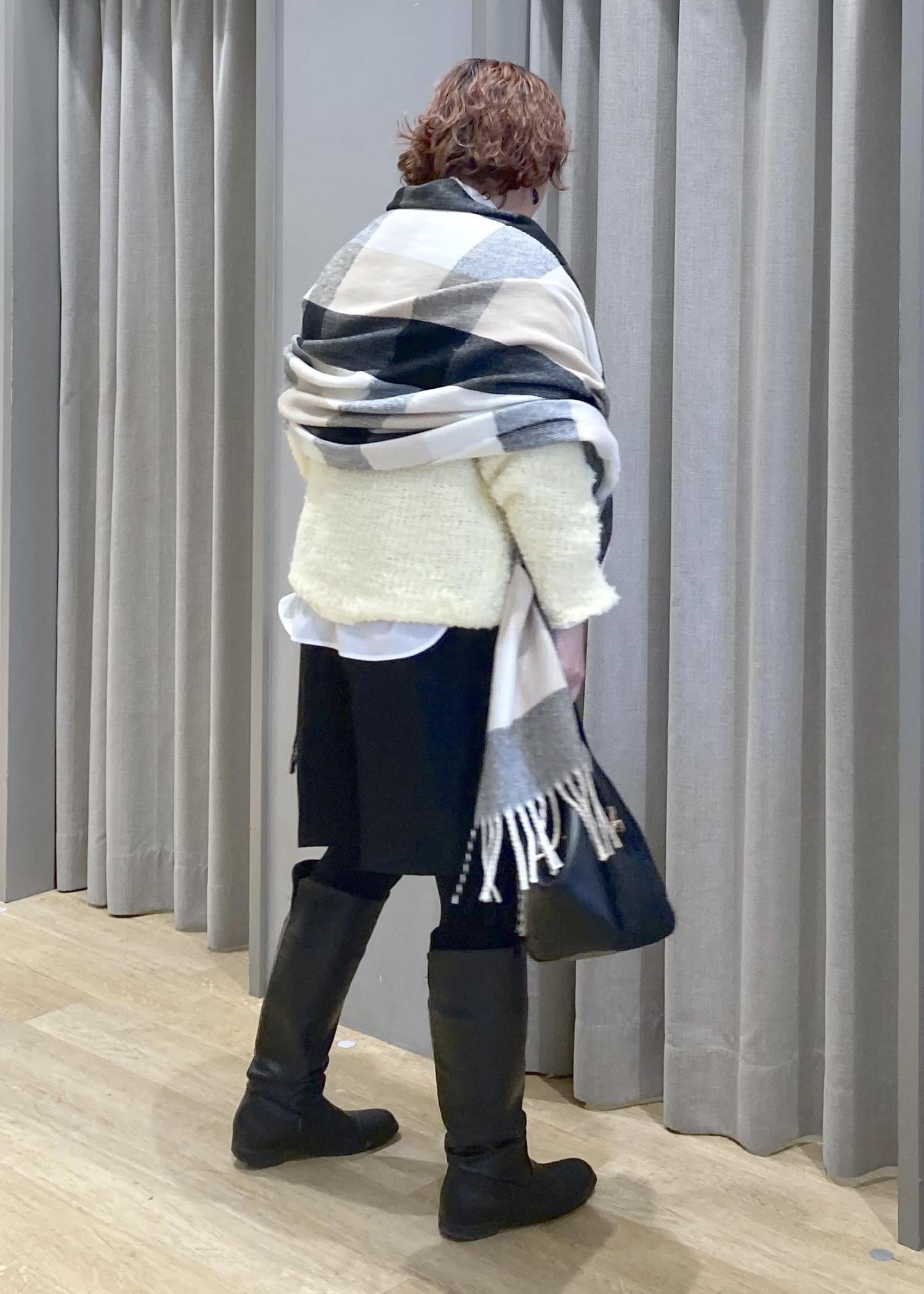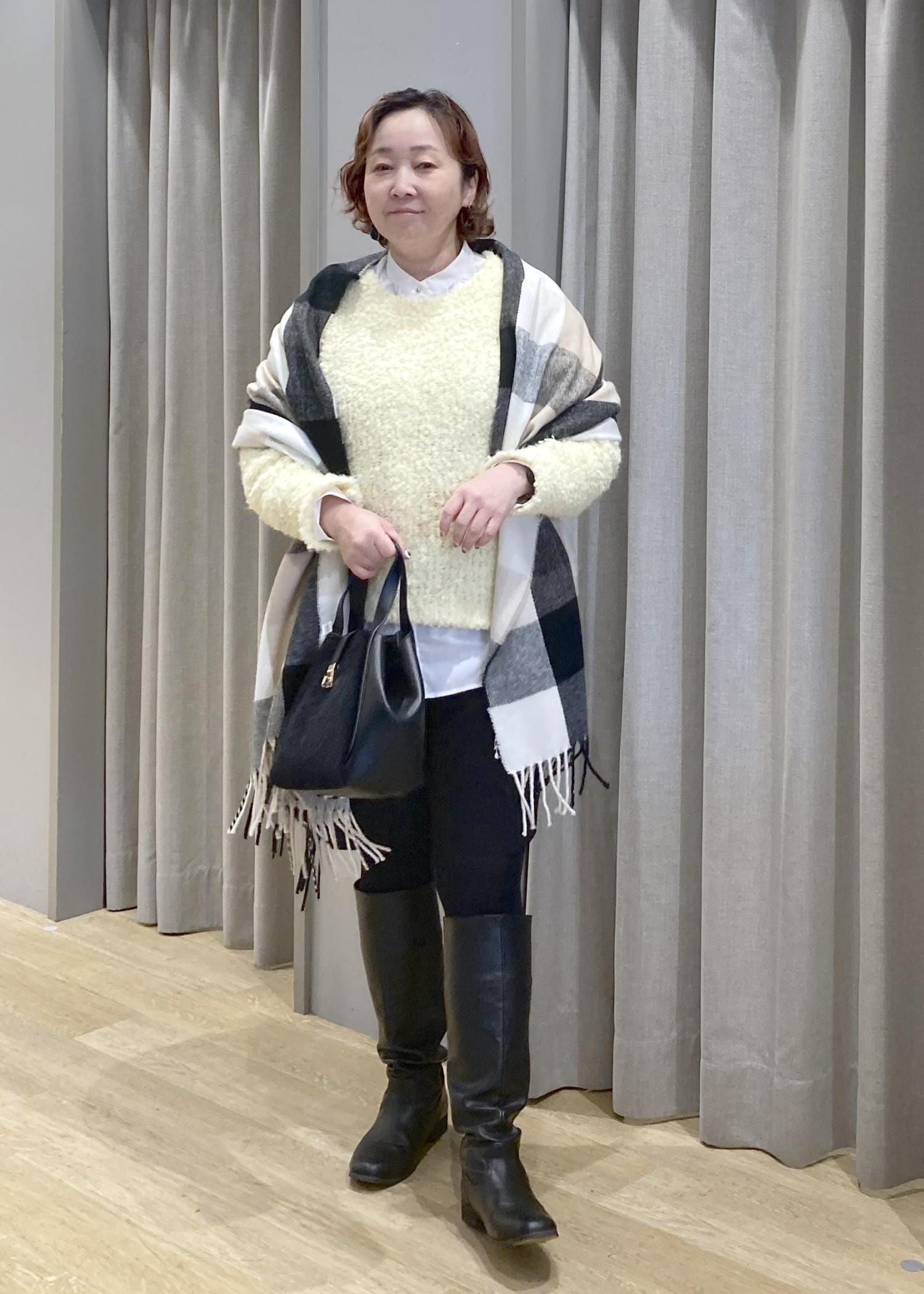 ふんわりニットにストールを重ねて、気になるラインはさりげなくカバーしてみました。