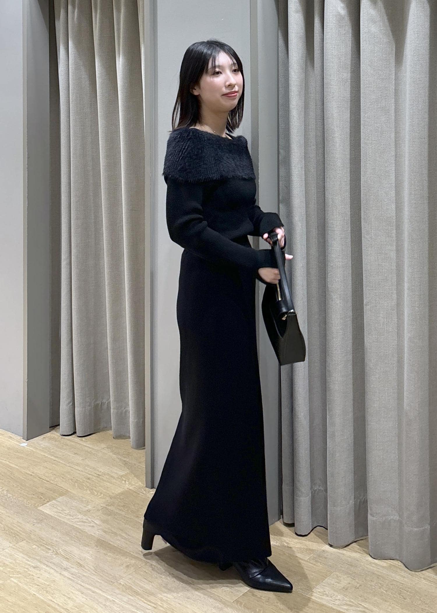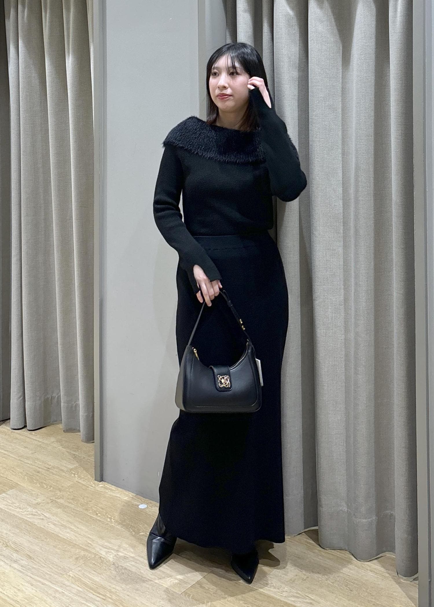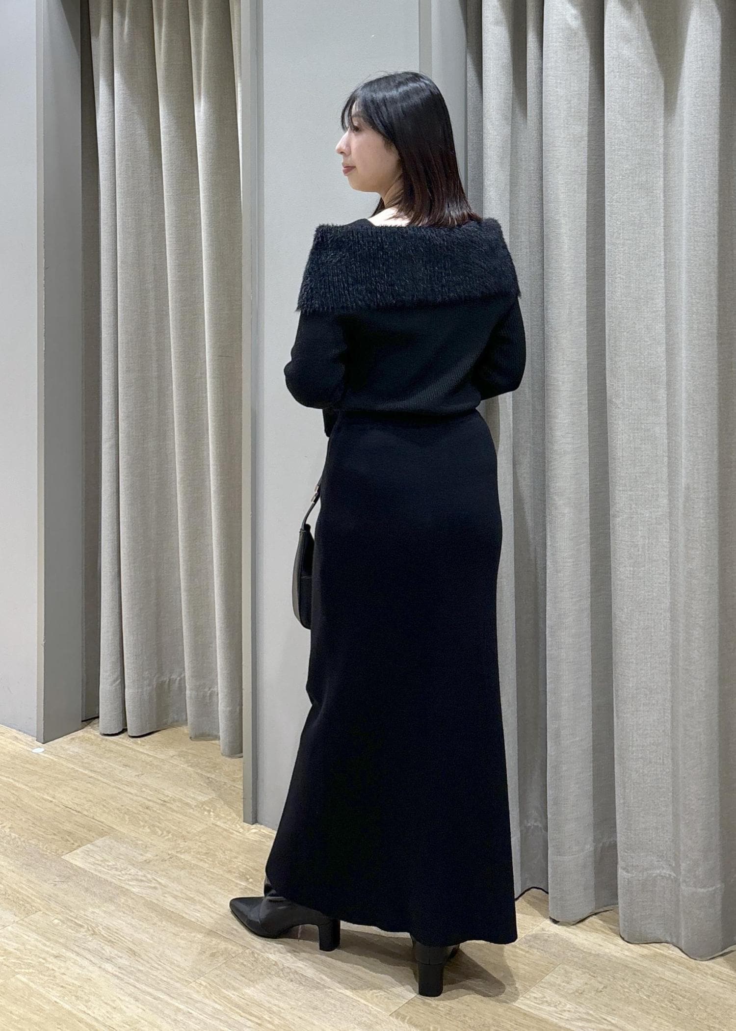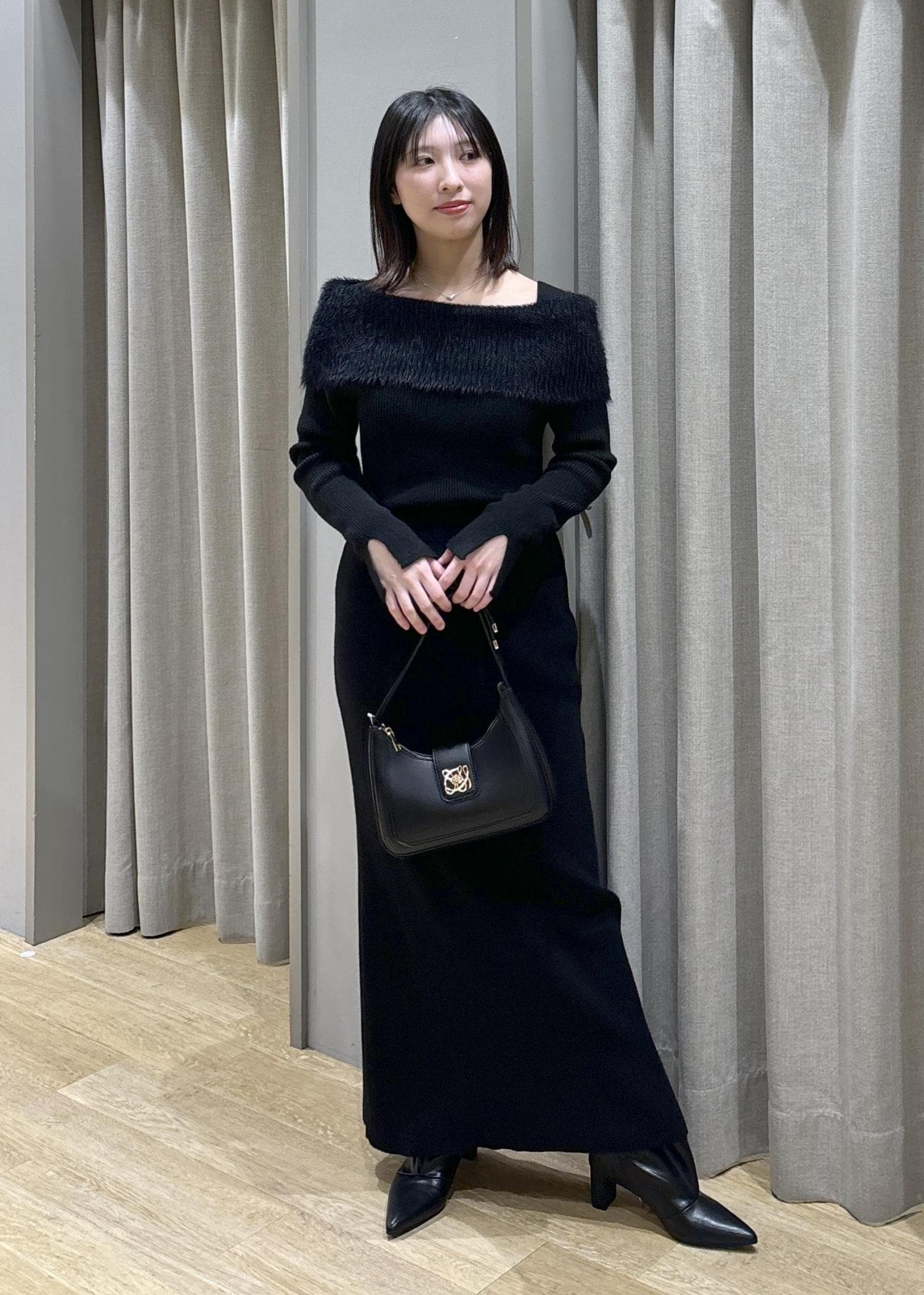 2BUY10%OFFVISフェザーヤーンオフショルもちもちリブニット/イージーケアブラック / F¥5,929レビュー身長158cm、Fサイズ着用。