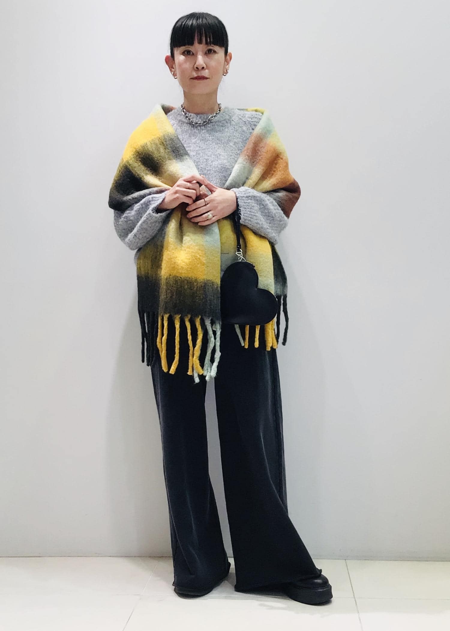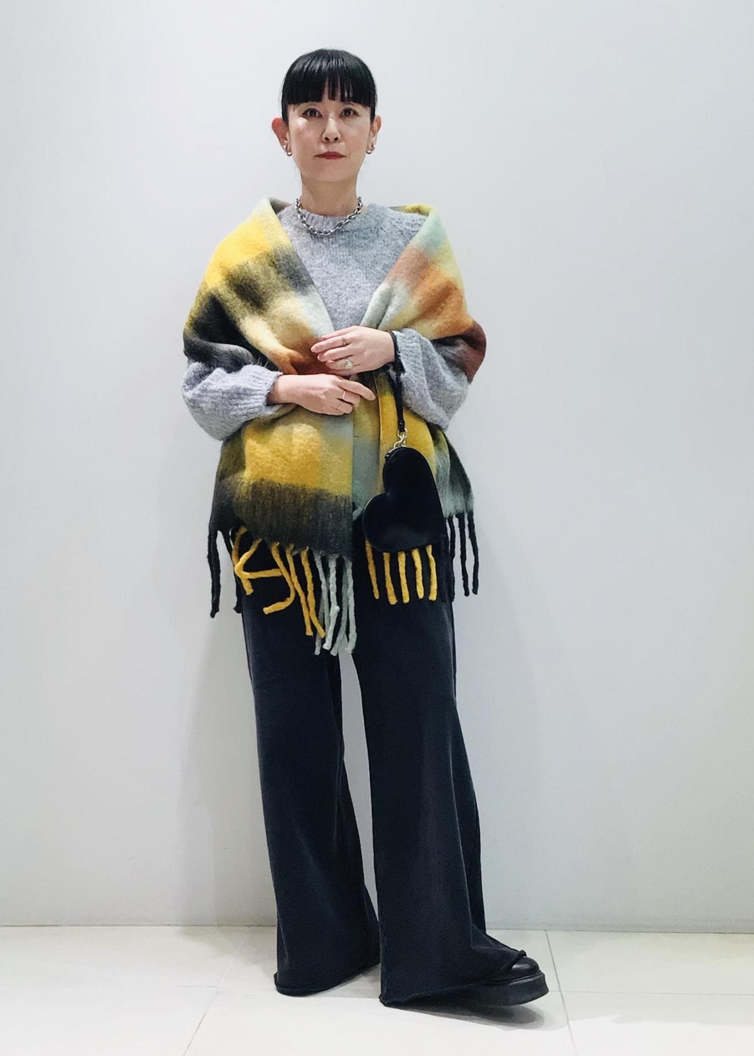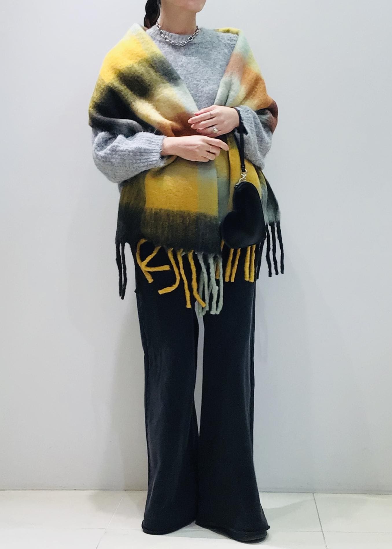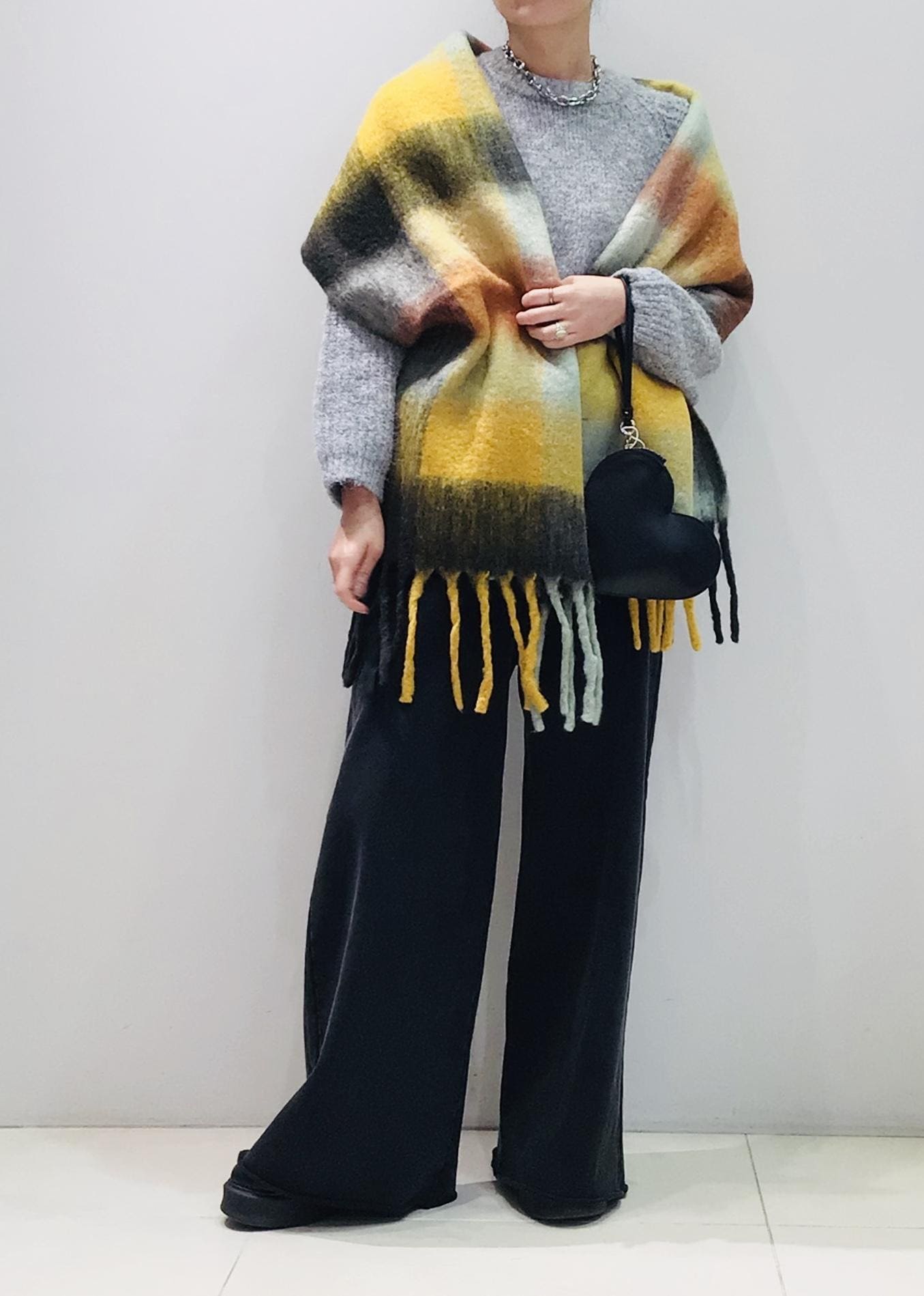 今日は以前にも何度かご紹介しているシェットランド風ニットにふわふわのチェック柄がたまらなくかわいいBagmatiのストールをサラッと羽織って、カジュアルながらもちゃんとおしゃれ見えするデイリーコーデを組んでみました