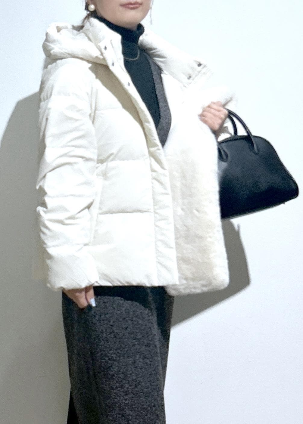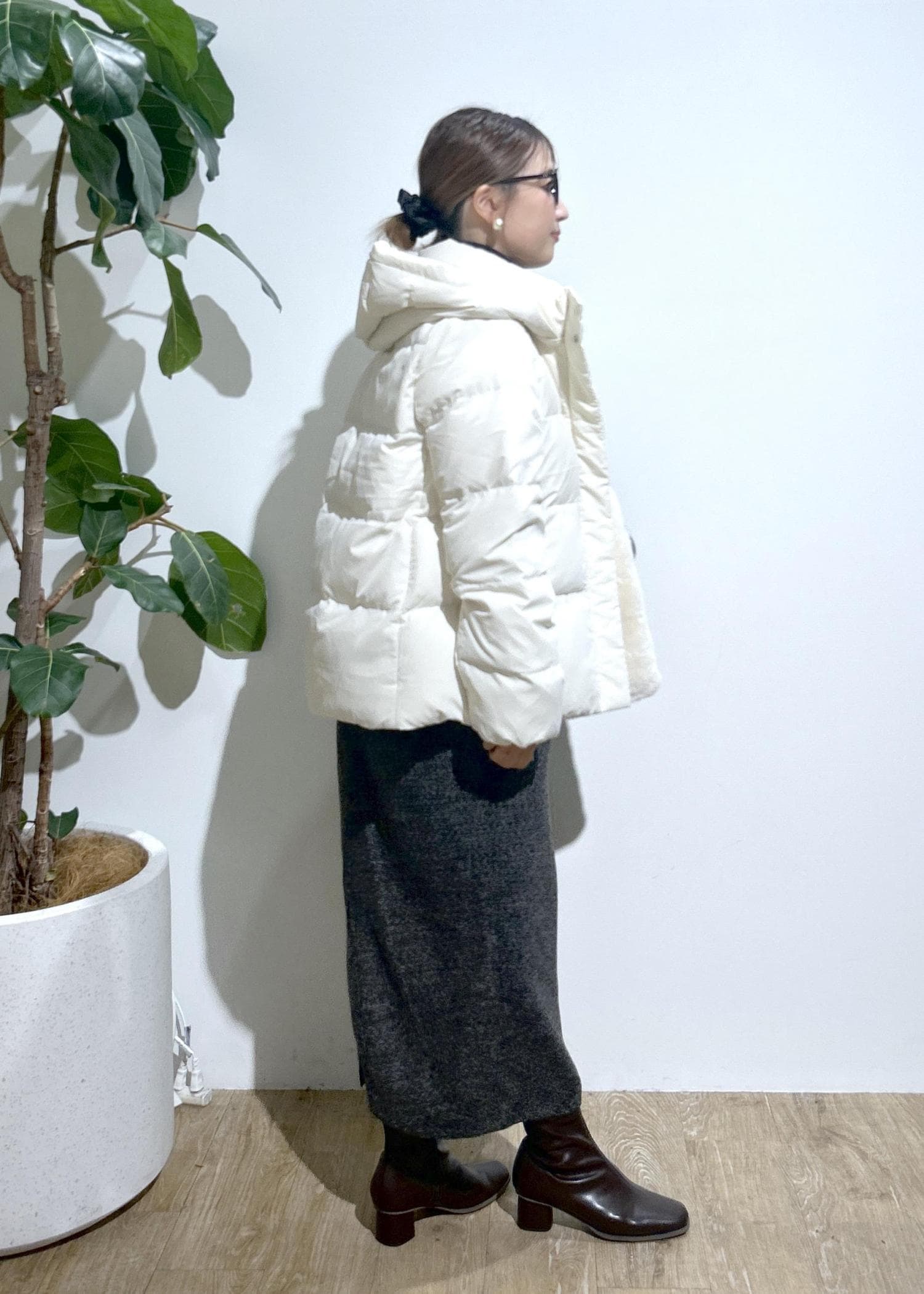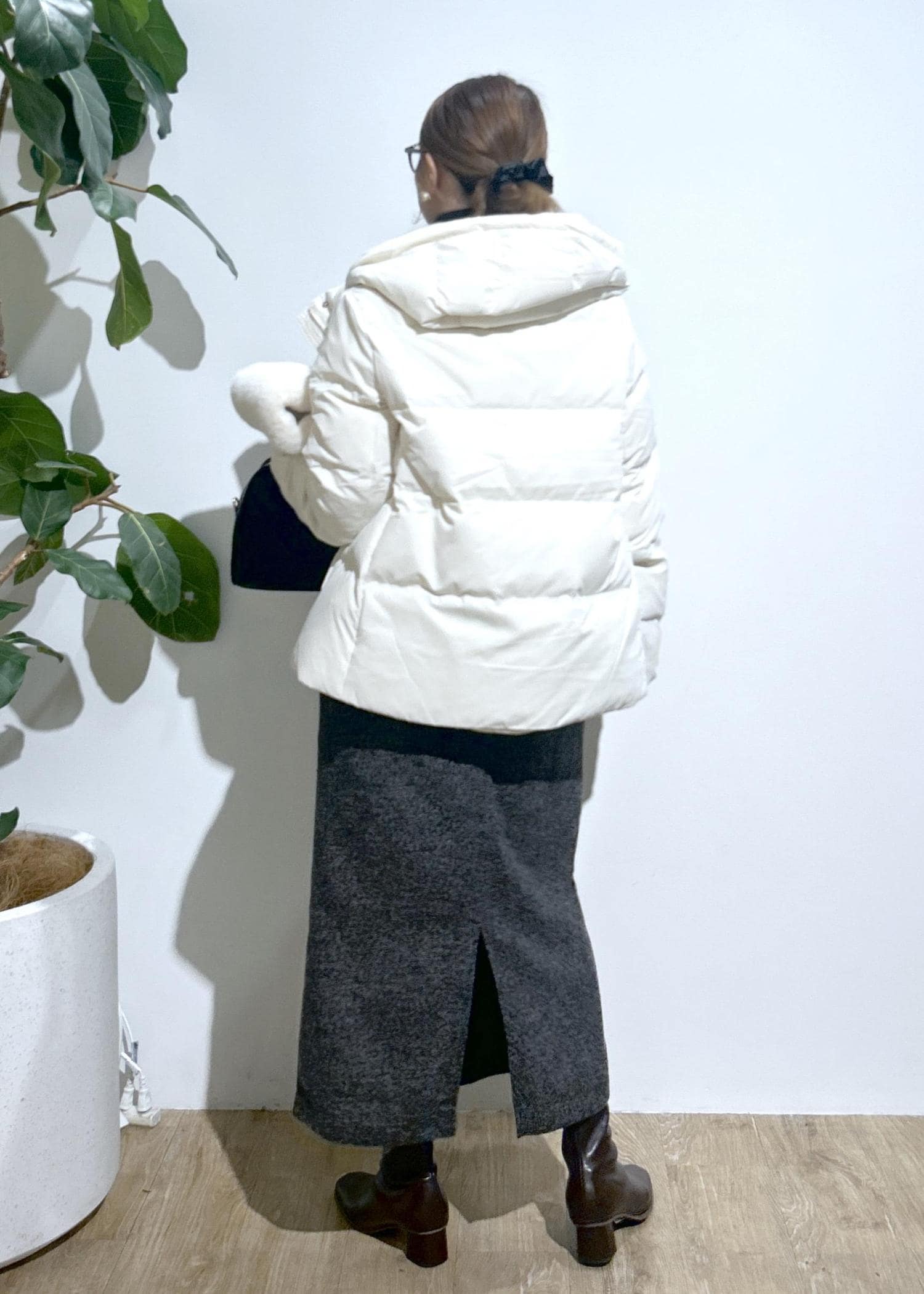 ダウンはボリュームがあり過ぎるとカジュアルな印象になりがちですが、こちらのダウンは程よいボリューム感でキレイめにもカジュアルにもお召しいただけます。フードが取り外し可能なのも嬉しいPOINTです‼︎