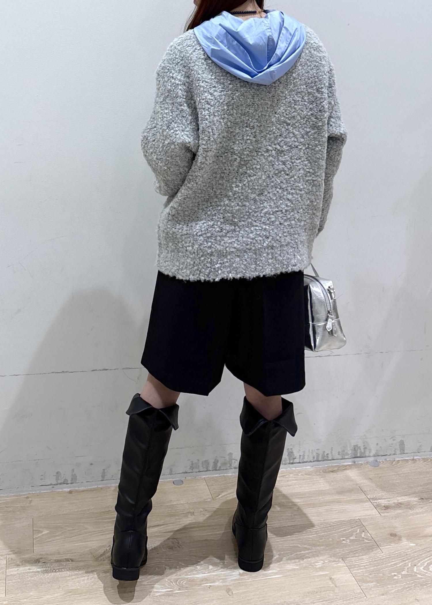 ブークレニットに、ブラックのハーフパンツを合わせた抜け感コーデ。