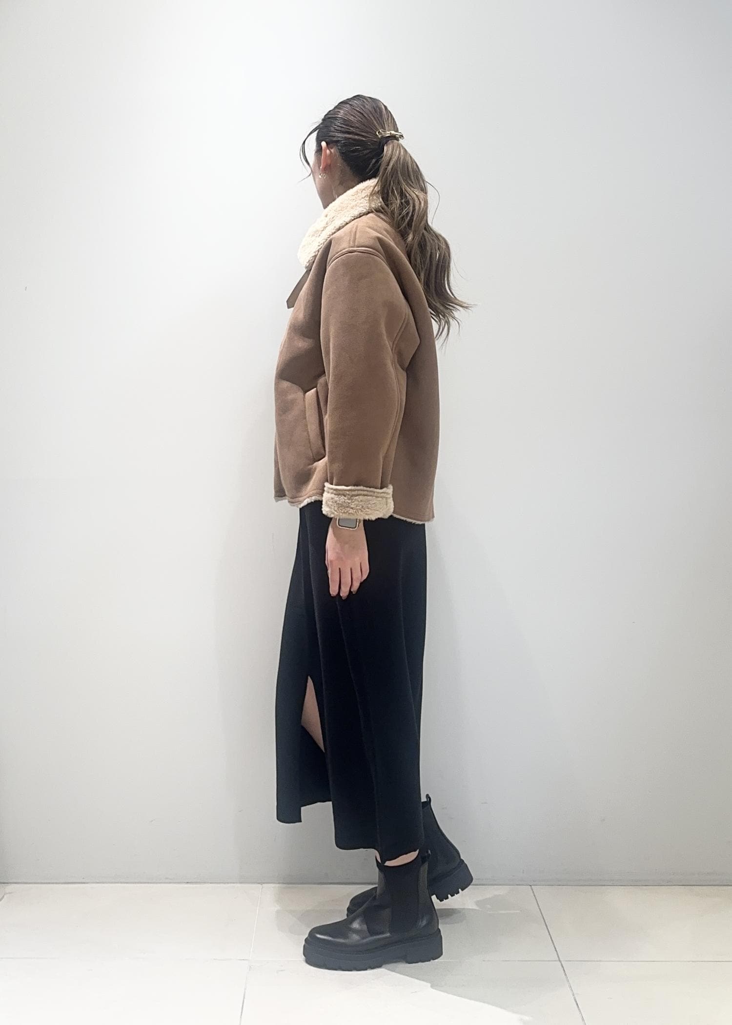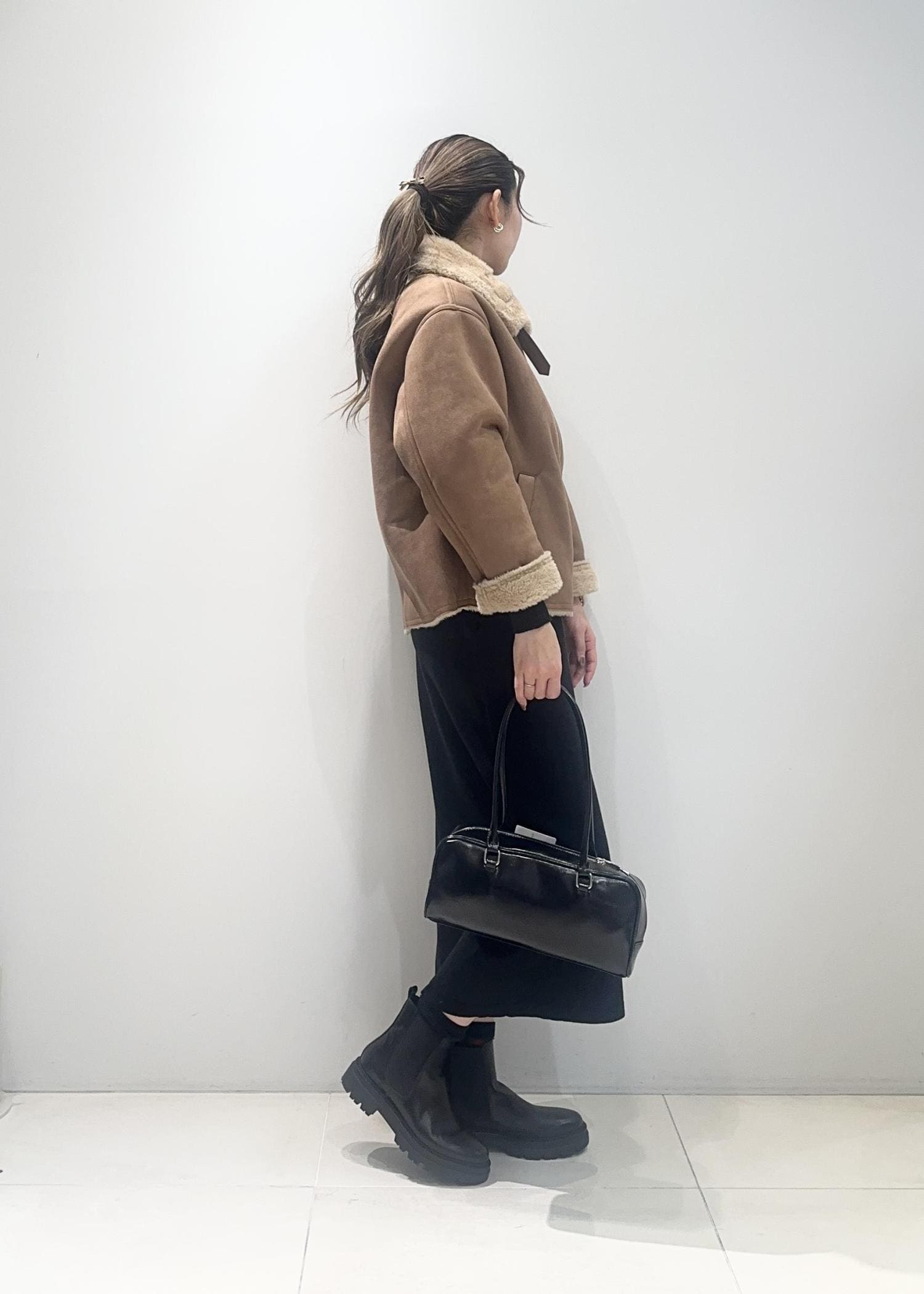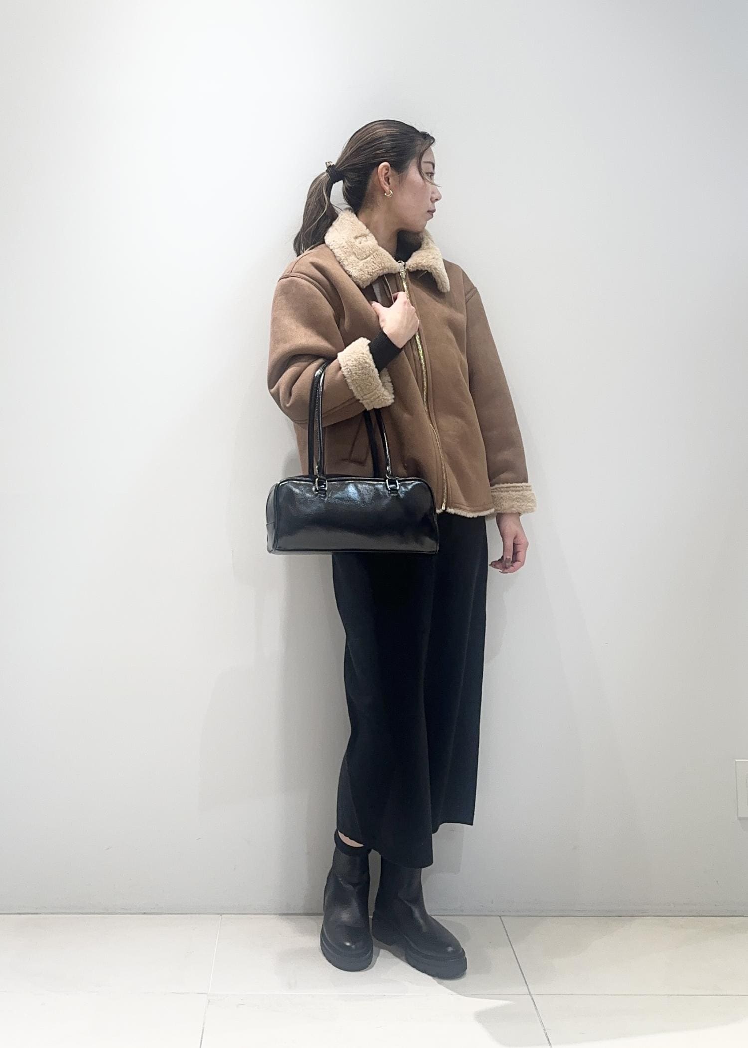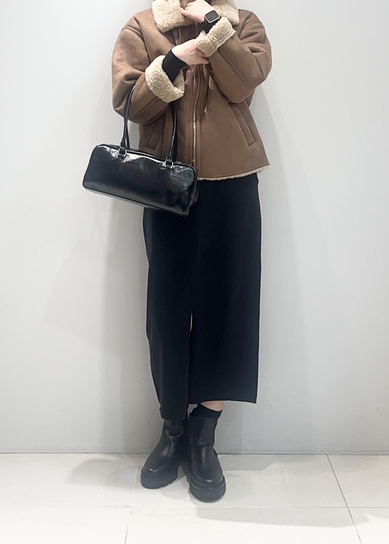 温かみのあるボア付きアウターを主役にした