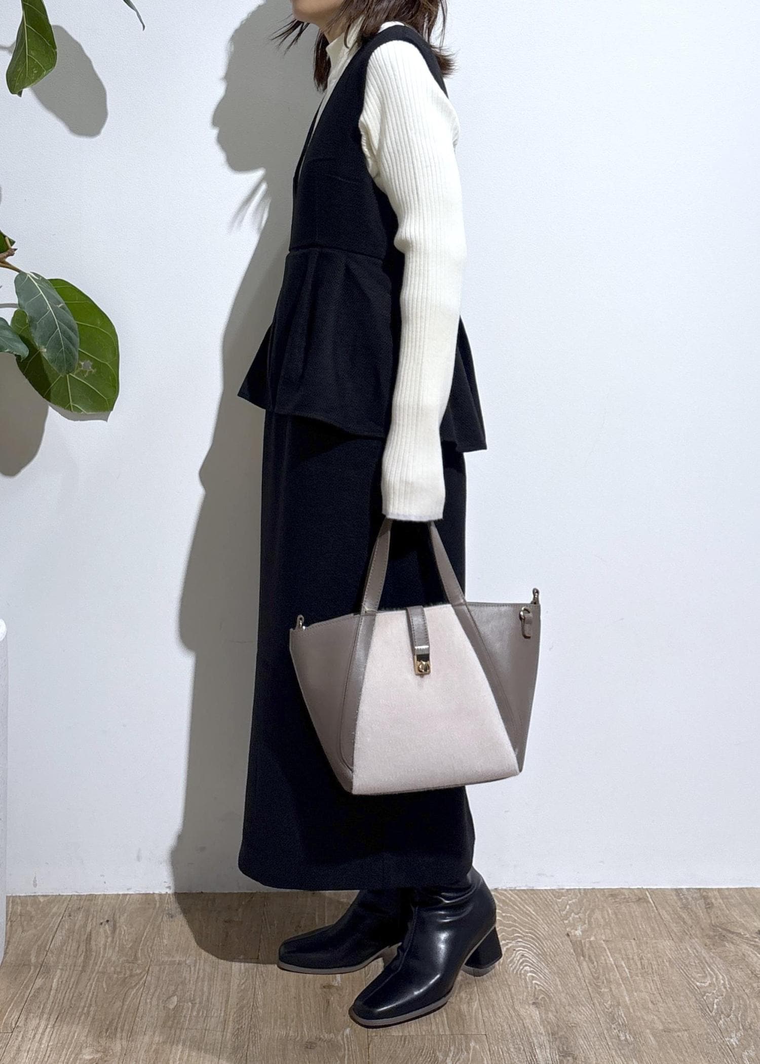 荷物の量や気分によって、中央のベルトでフォルムを変えられる2WAY仕様です♩