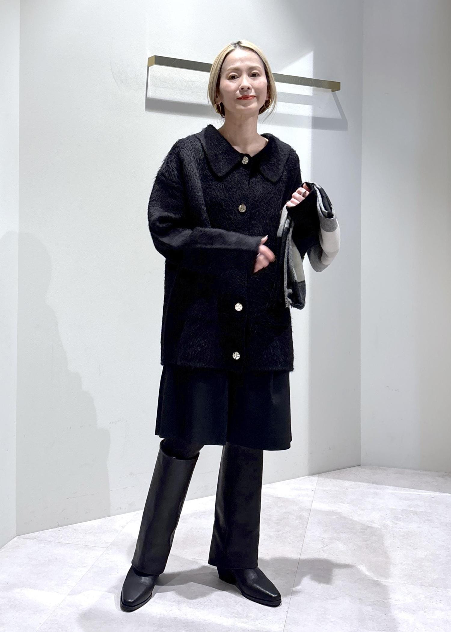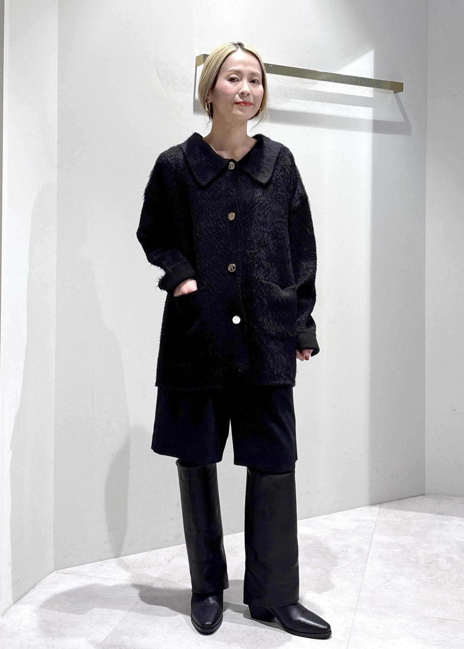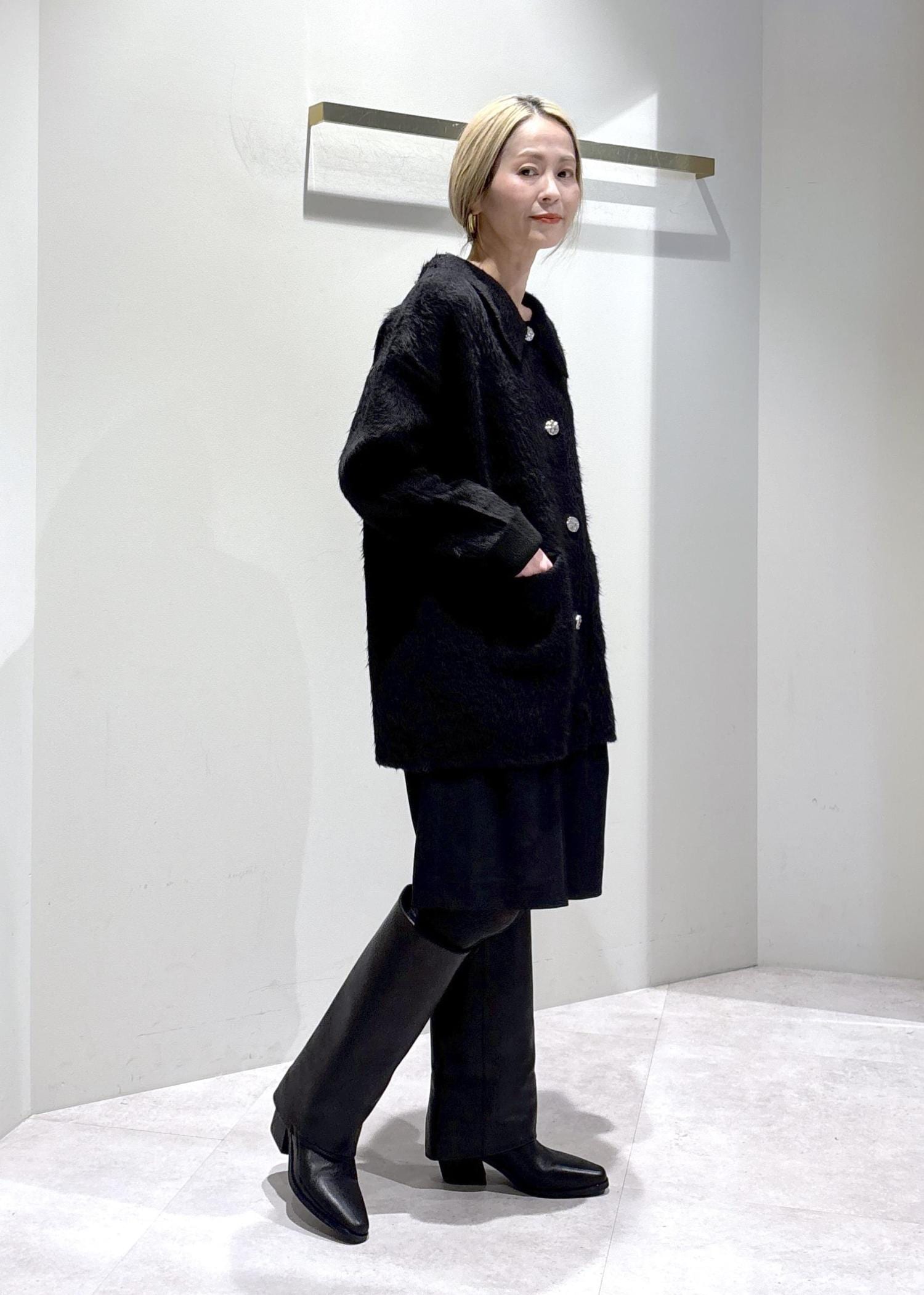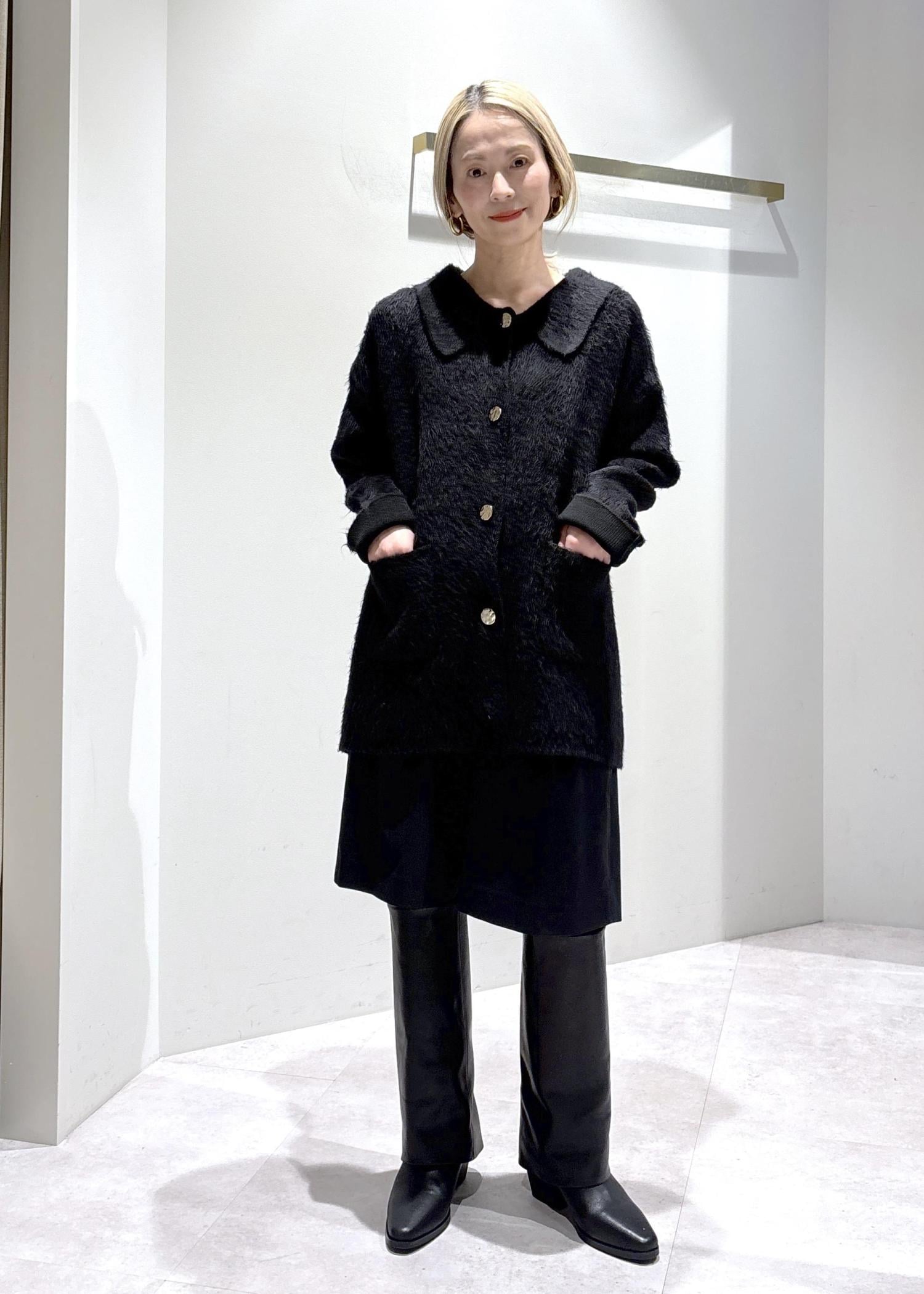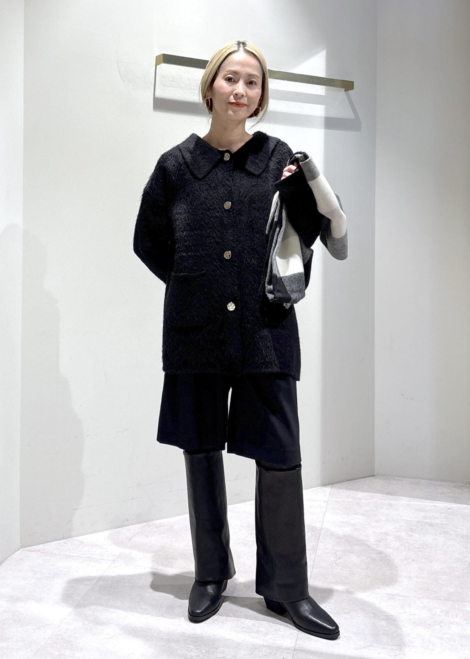 甘さを抑えたブラックコーデに、襟付きのニットコーディガンで女性らしさを出し、程よく力の抜けたスタイルにしでみました
