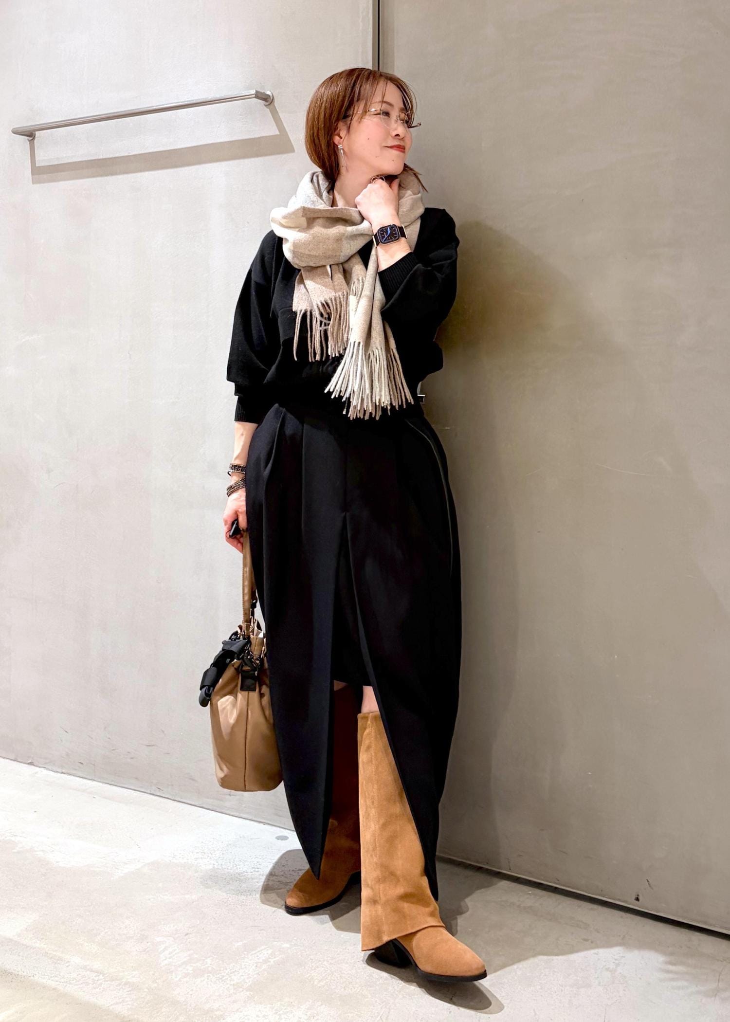 ハンサムなカーディガンに人気のツイードミルのストールでアクセントをつけて、クリスマスのお出かけコーディネートにしました。
