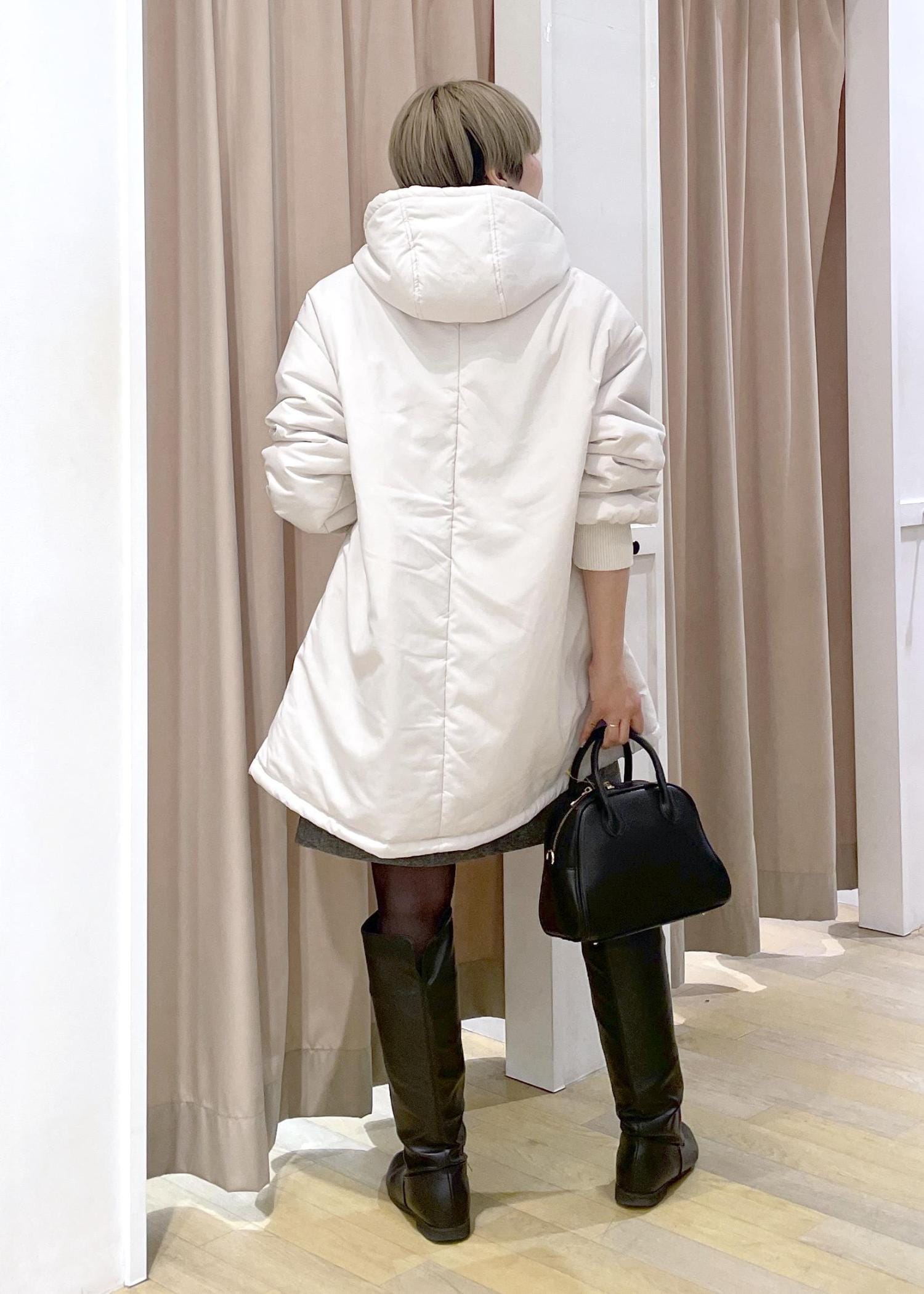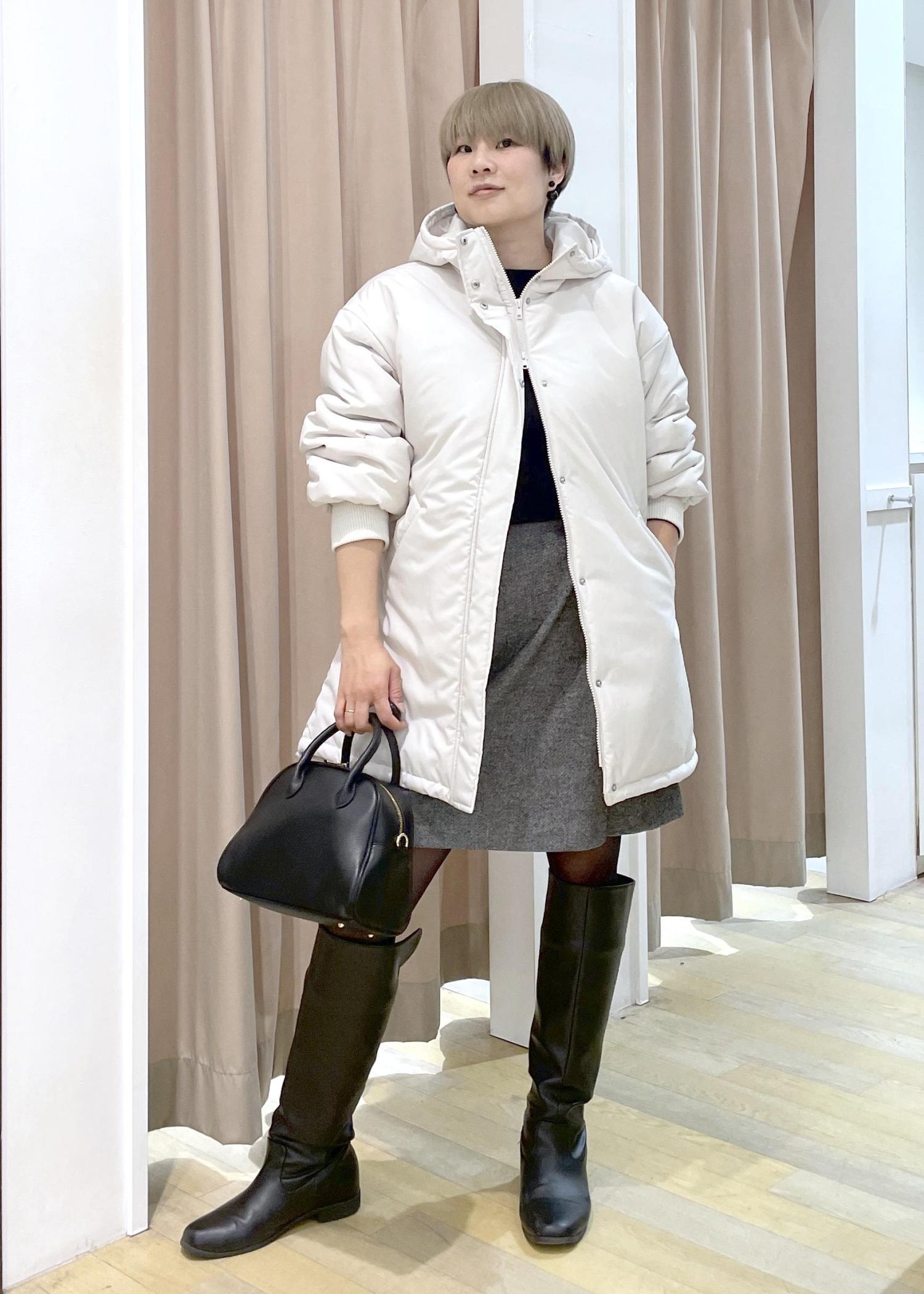 ボリューム感のある中綿モンスターコートに、ミニ×ロングブーツを合わせて、フェミニンさをプラス。