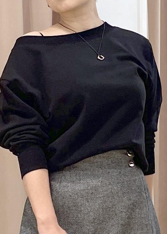 深めのボートネックを少し落とすと、オフショルシルエットになる2way仕様。