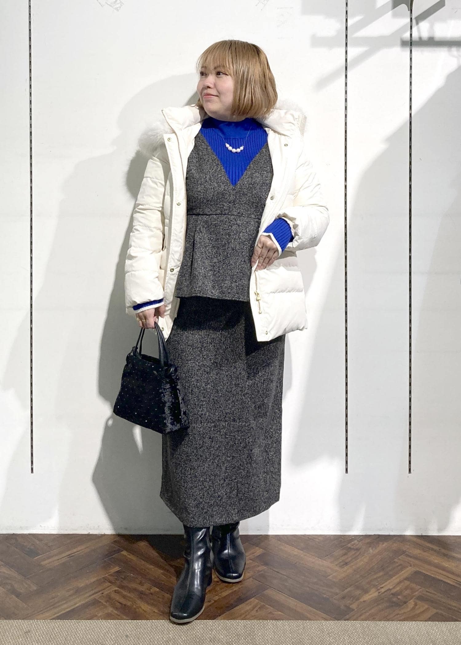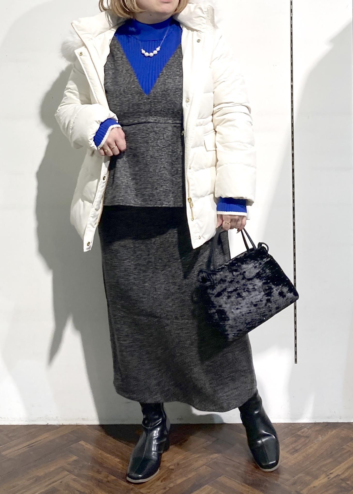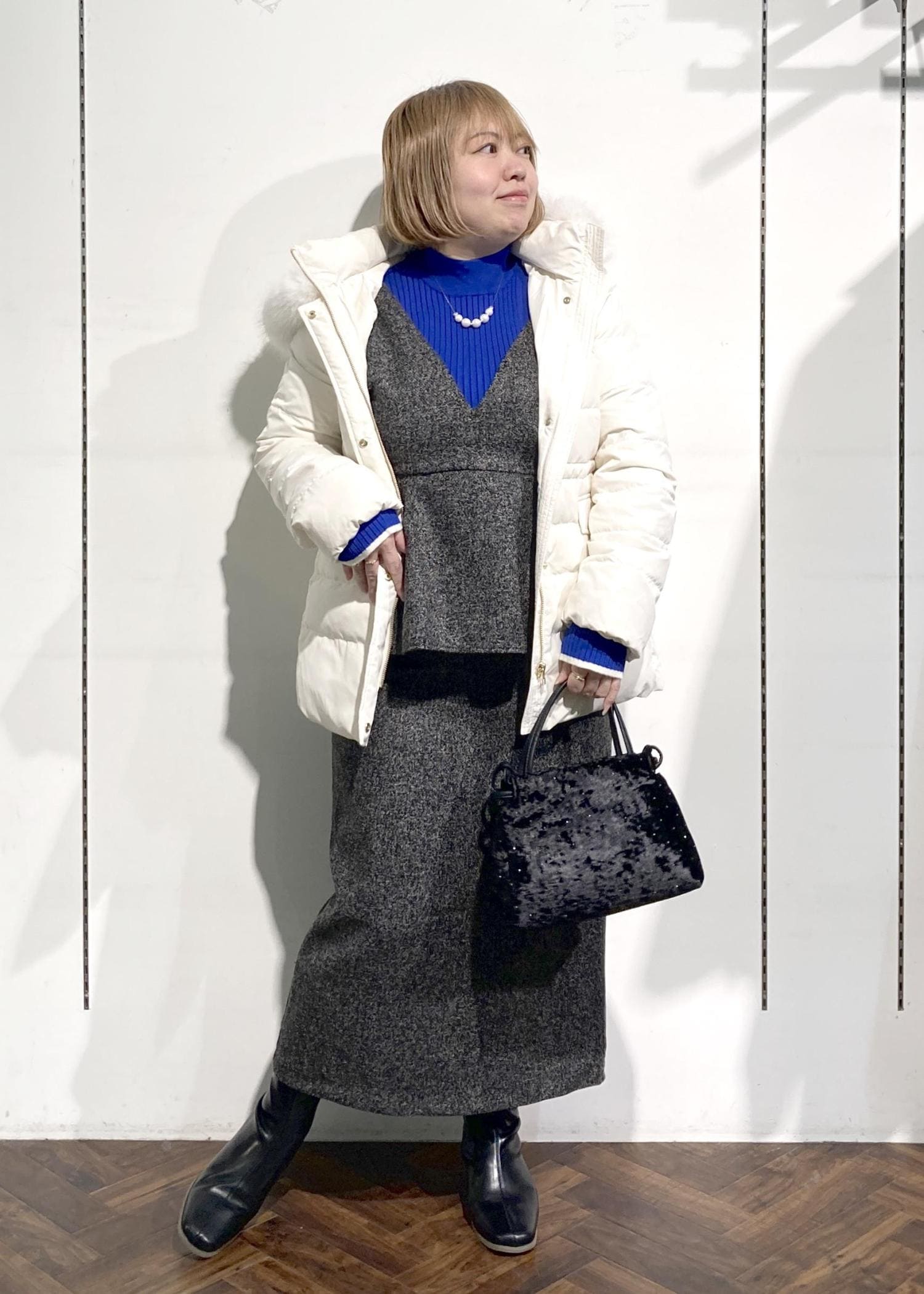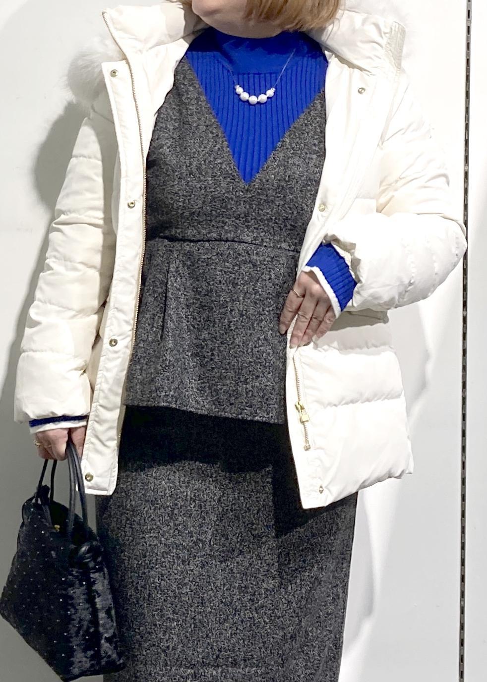 着るだけで着映えするデザインですが、カラーニットを合わせて華やかにしました。