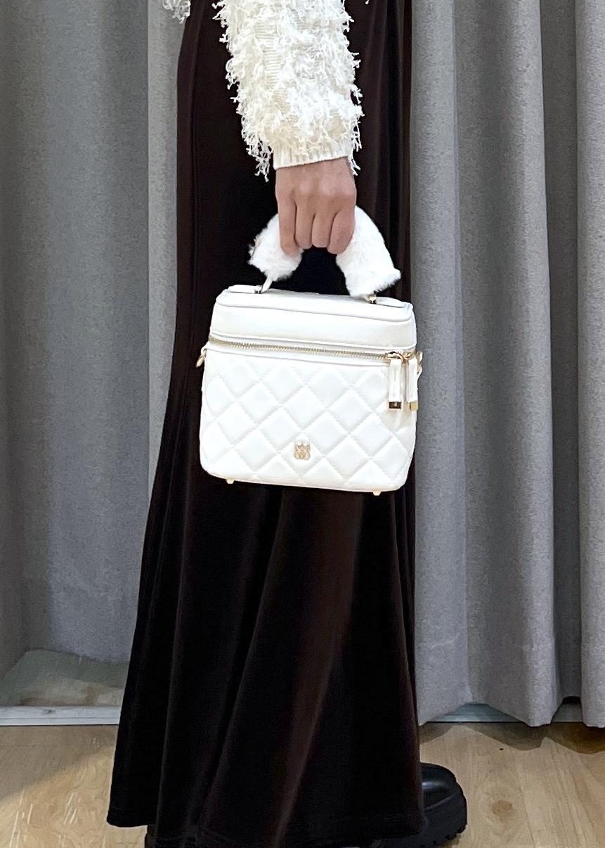 VISファーハンドルキルティング&ツイードバニティバッグ/2WAYオフホワイト / F¥7,909レビューファーハンドルが可愛い、2WAY仕様のバニティバッグ。キルティング×ゴールド金具で、上品なアクセントに。