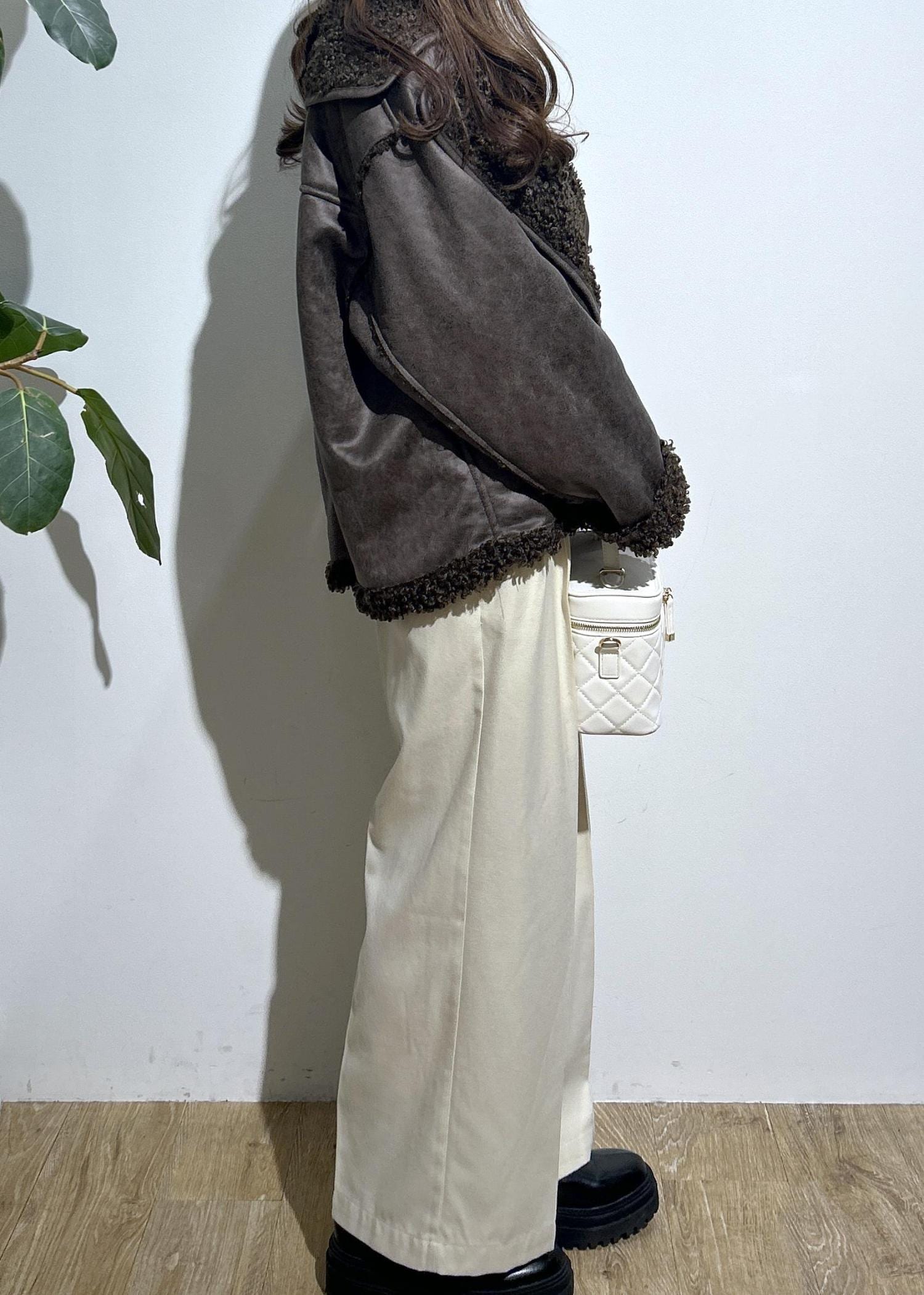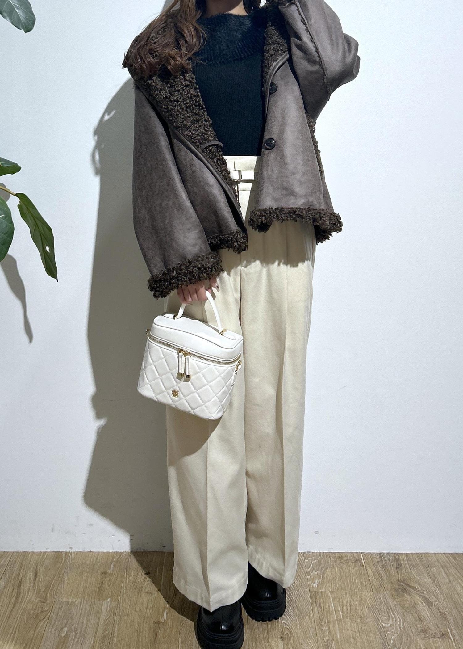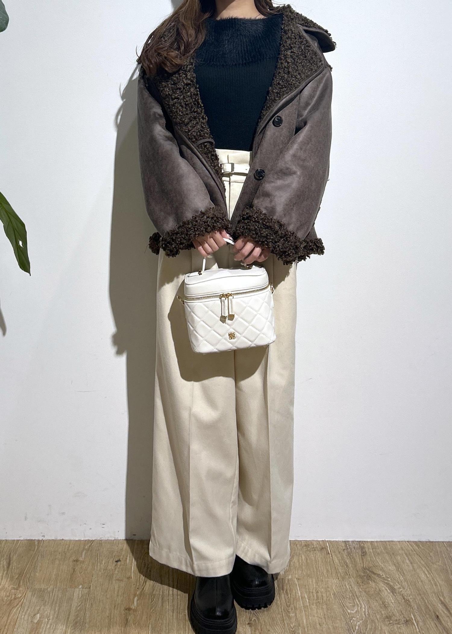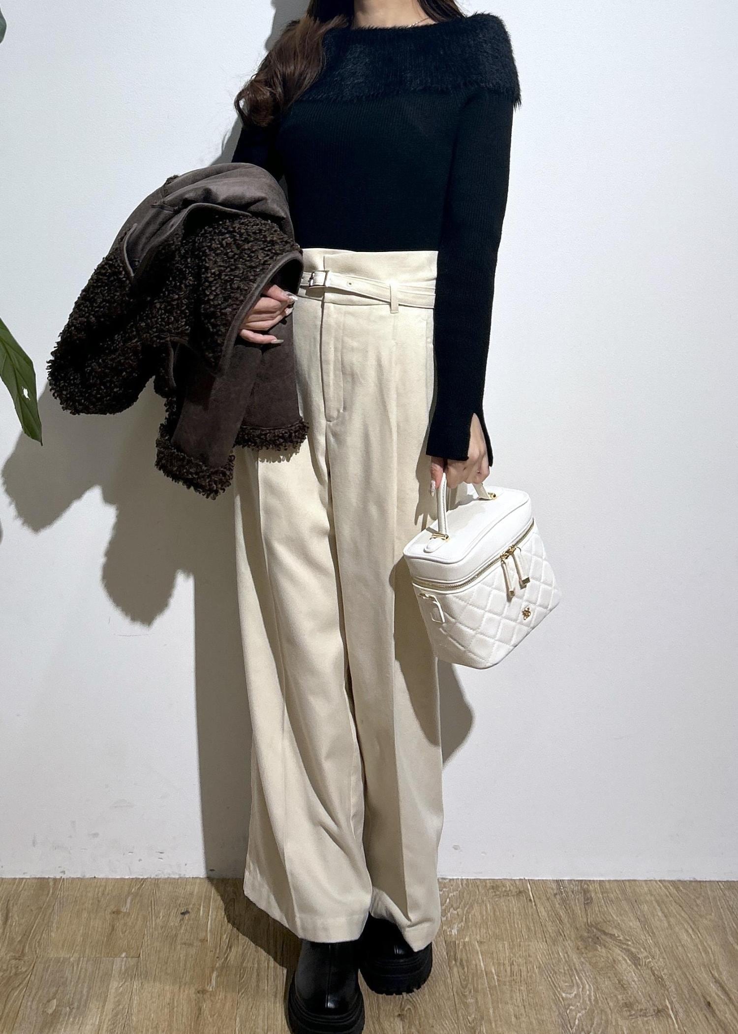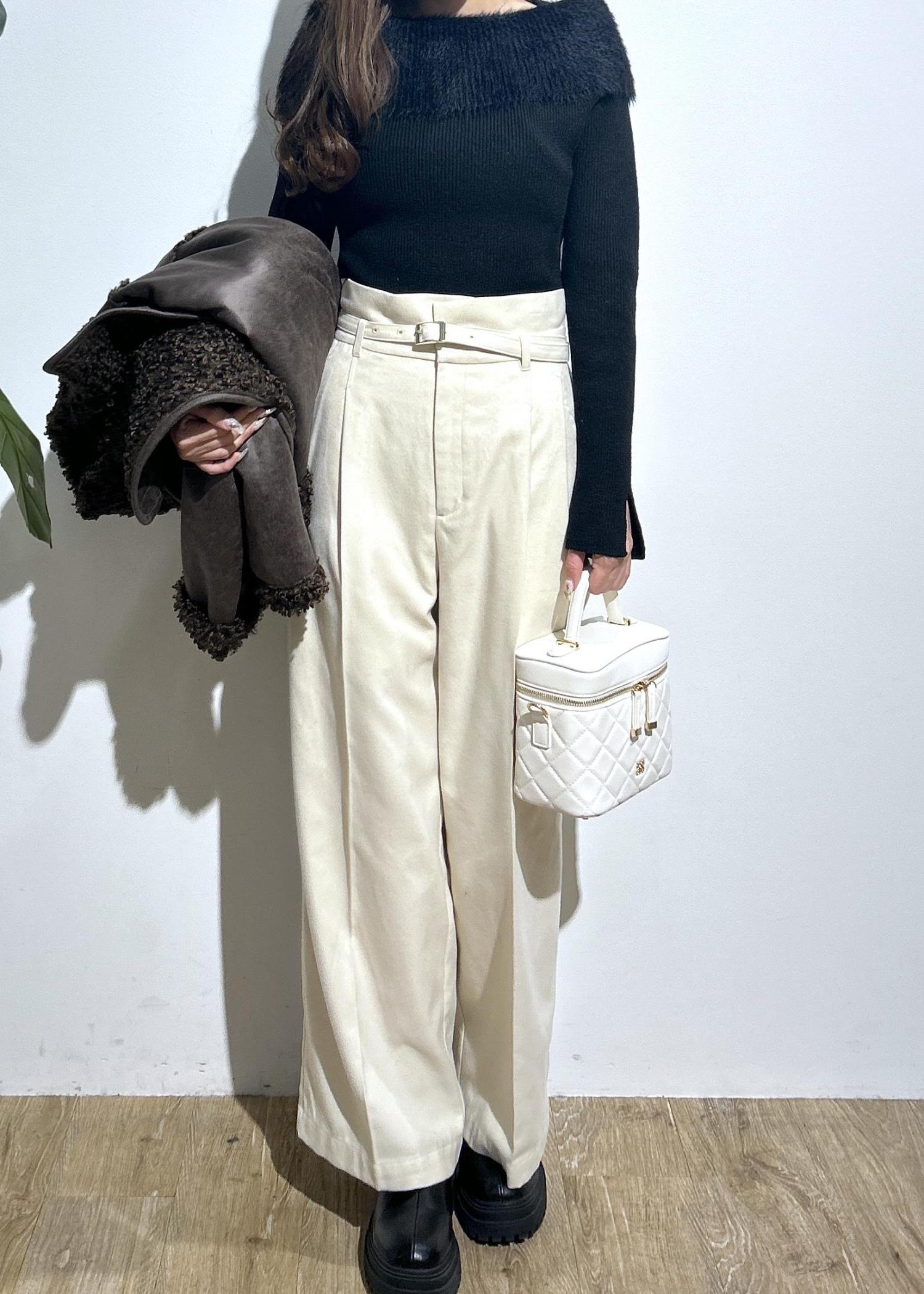 オフショルニットにハイウエストのパンツを合わせてキレイめスタイルに。フェイクムートンのアウターを合わせたらカジュアル感をプラスできます。